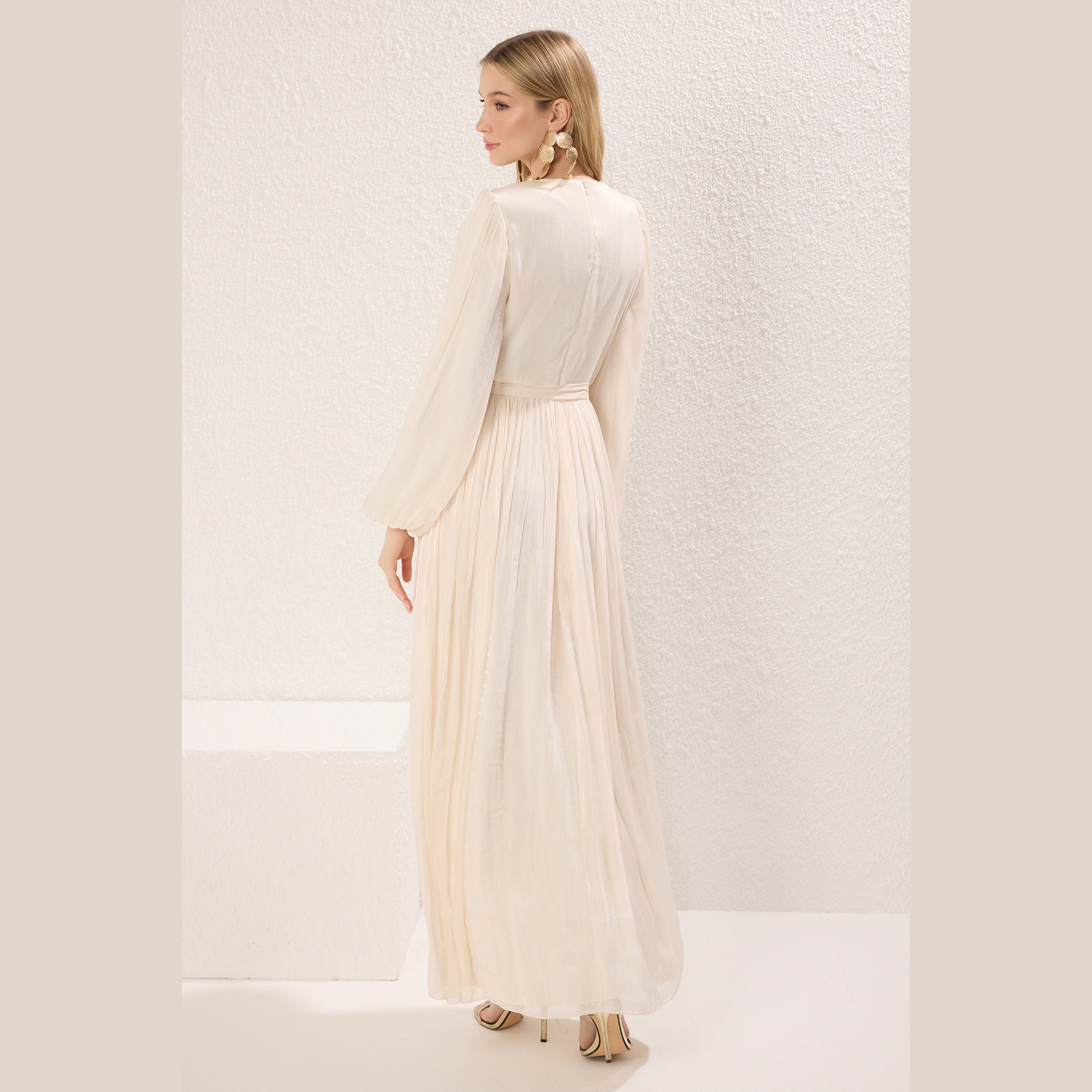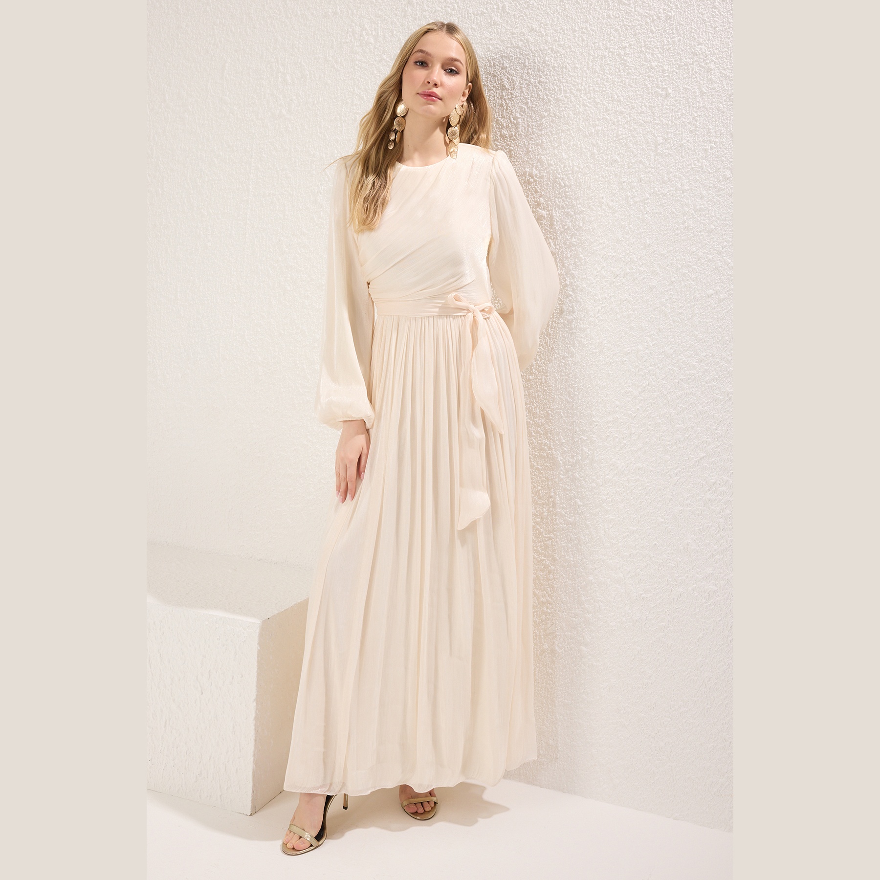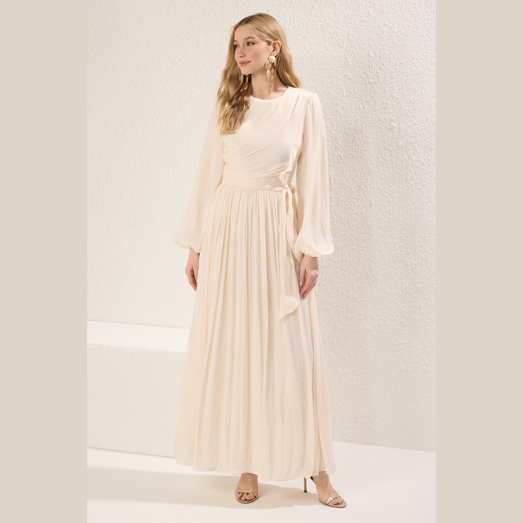 فستان نسائي – إكرُو طويل بشيفون لامع وتفصيلة حزام من مجموعة Trendyolmilla Modest (أناقة ملكية بلمسة محتشمة)