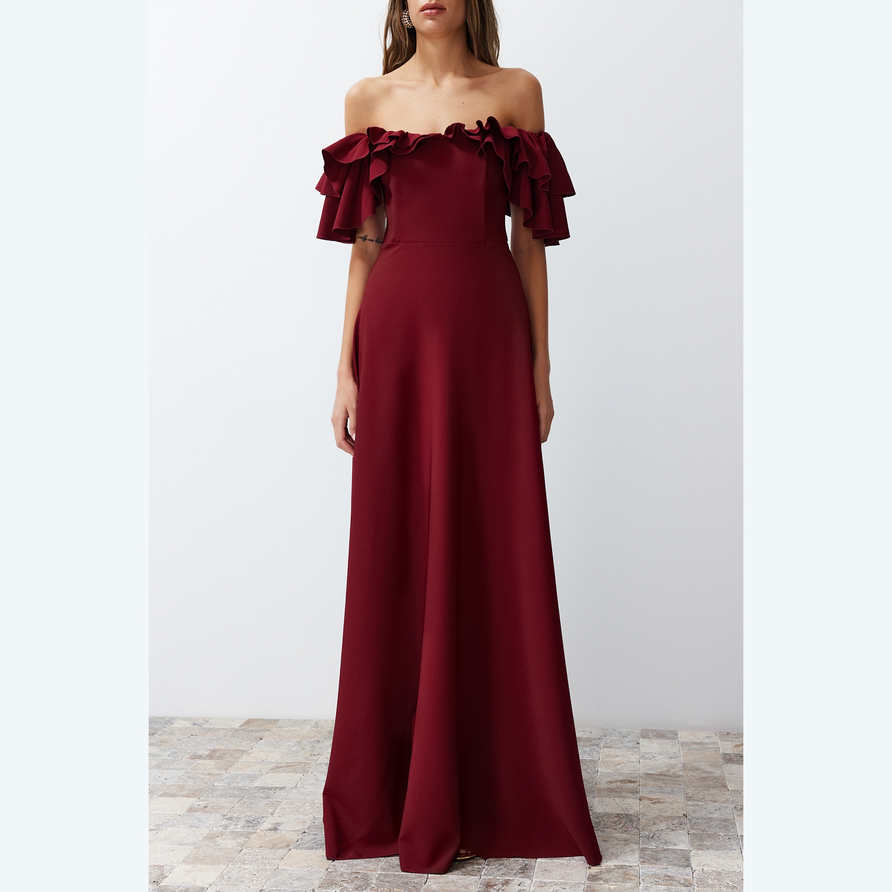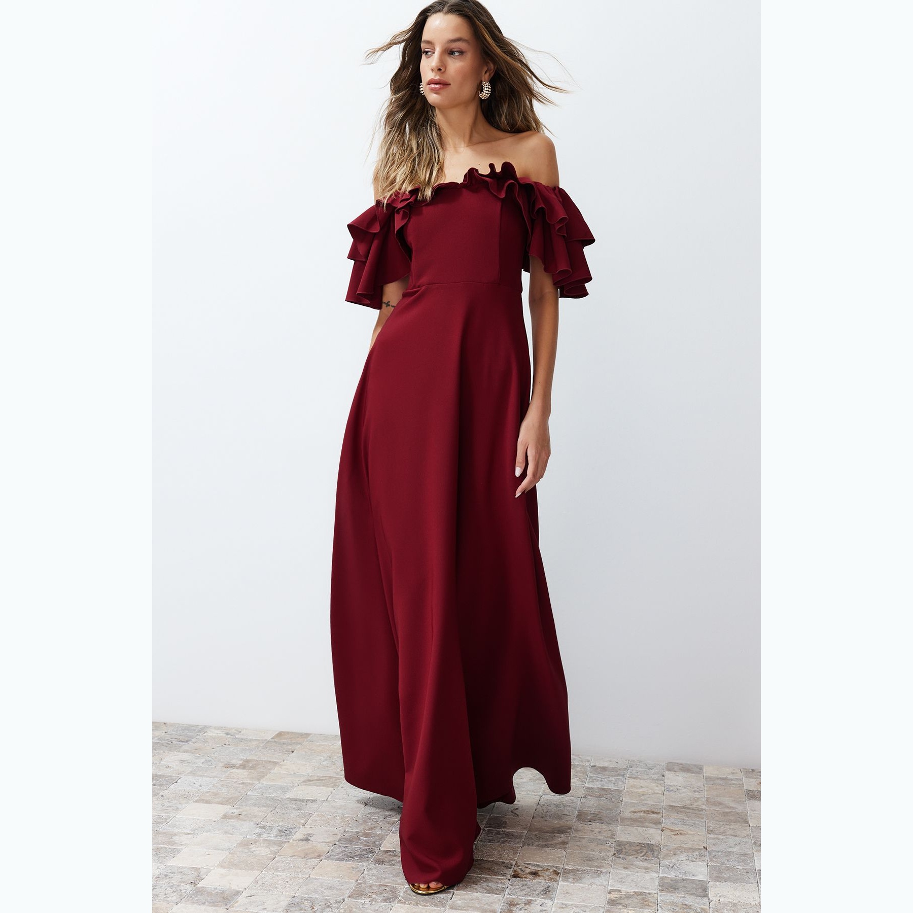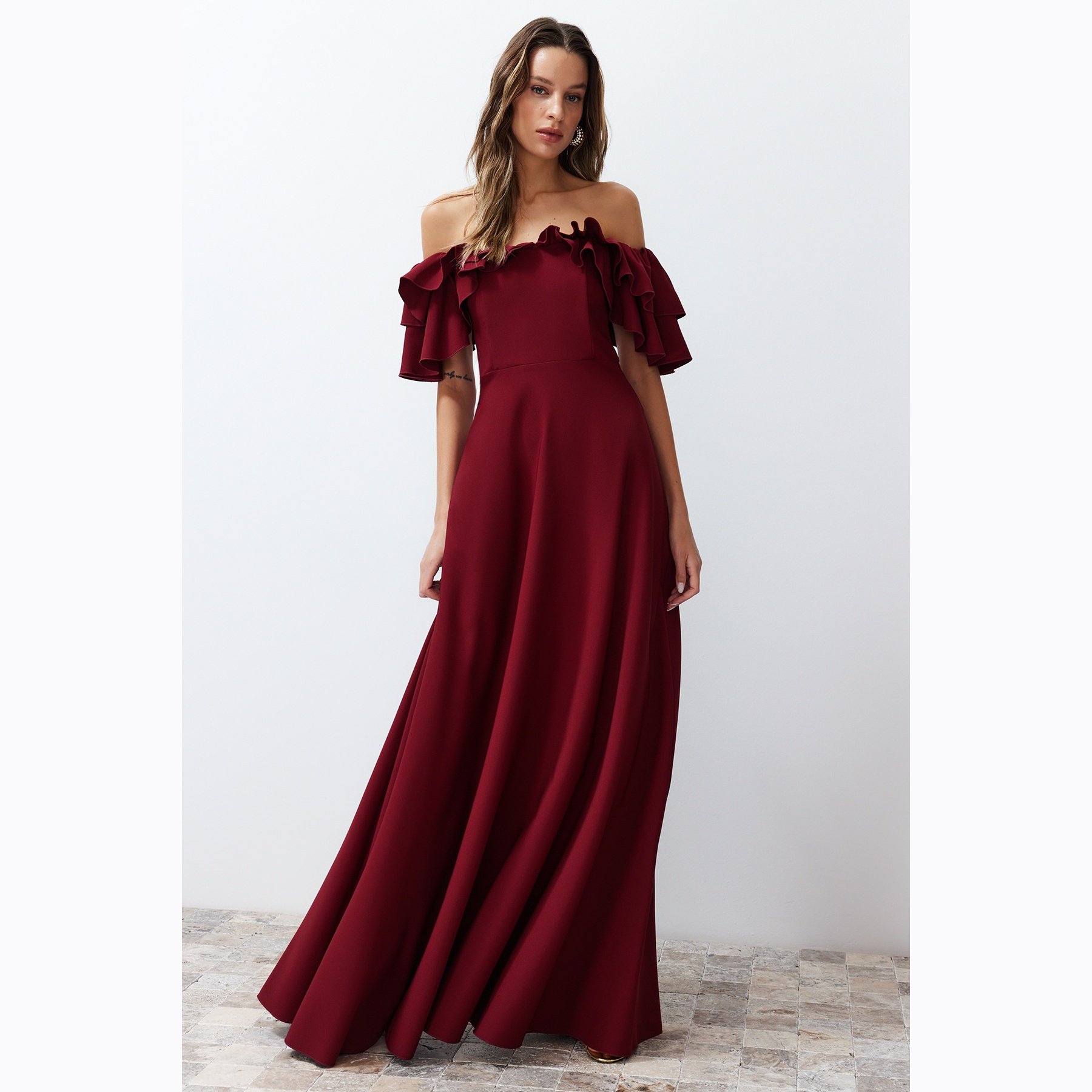 فستان سهرة بلون بوردو جذاب، مصمم بقصة A-line انسيابية تبرز جمال القوام، مع خامة دوكوم ناعمة وتفاصيل كشكش تضيف حركة أنثوية ساحرة. يأتي بياقة كارمن مكشوفة، بدون أكمام، وطول ماكسي يمنحك حضورًا راقيًا في المناسبات الخاصة مثل حفلات التخرج أو السهرات الرسمية.