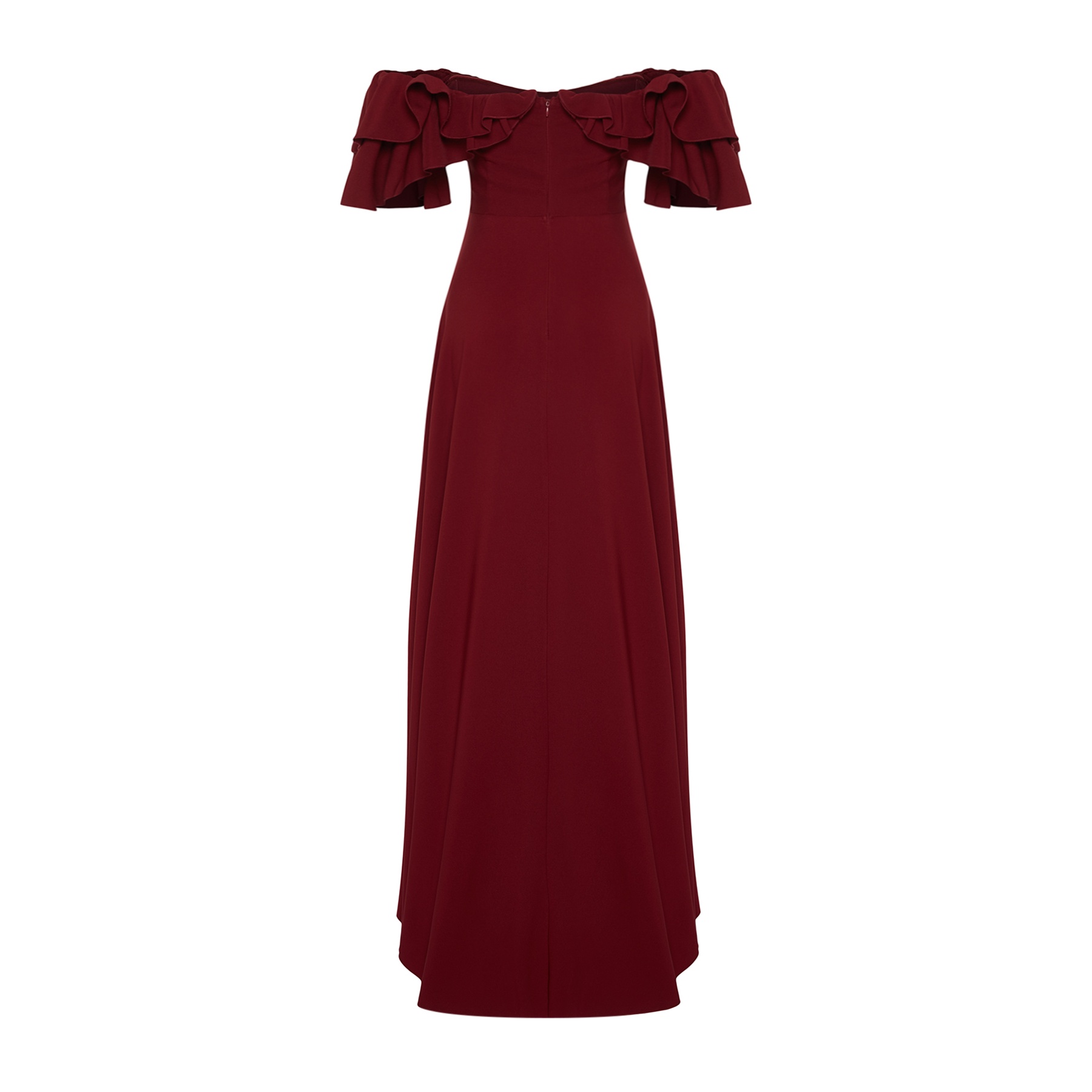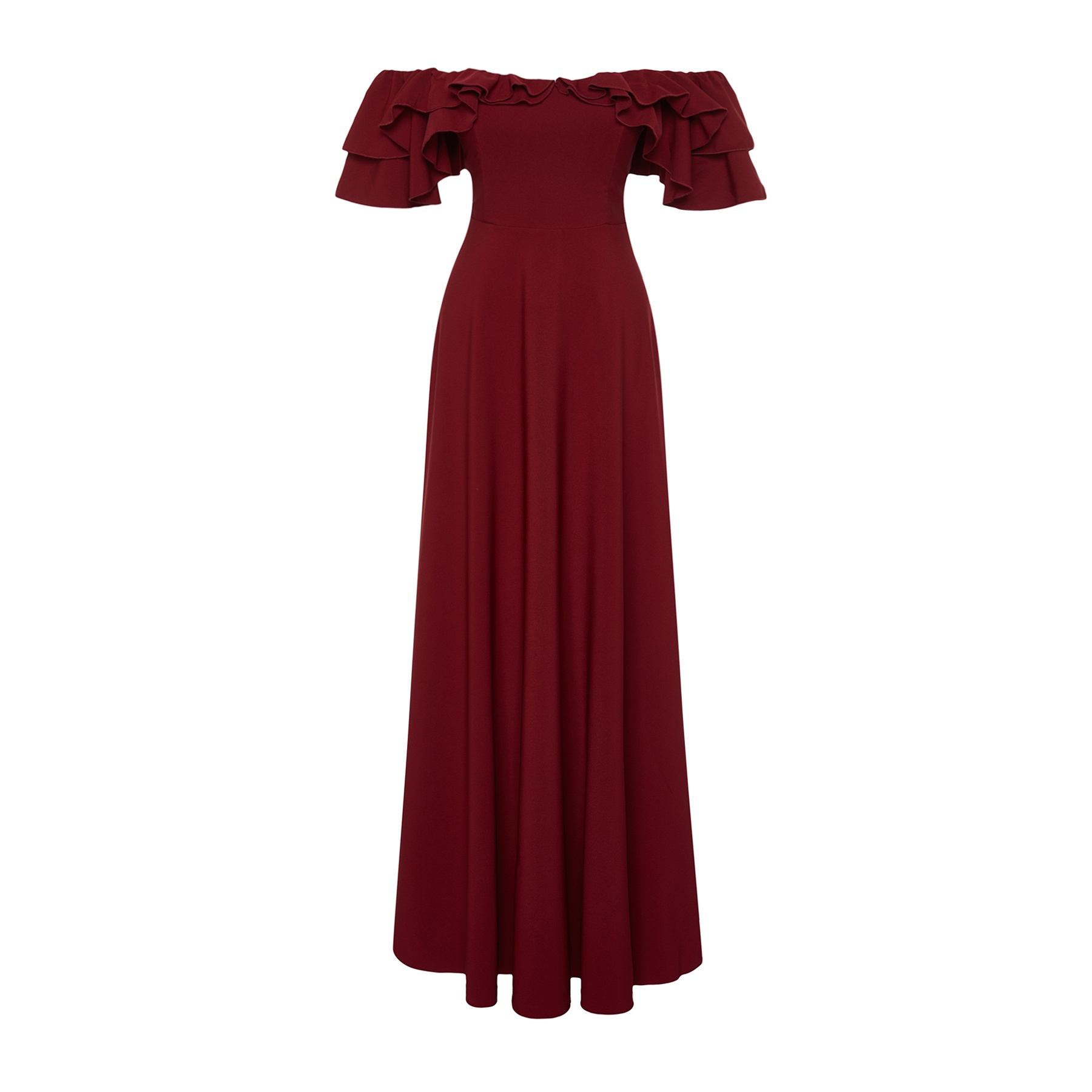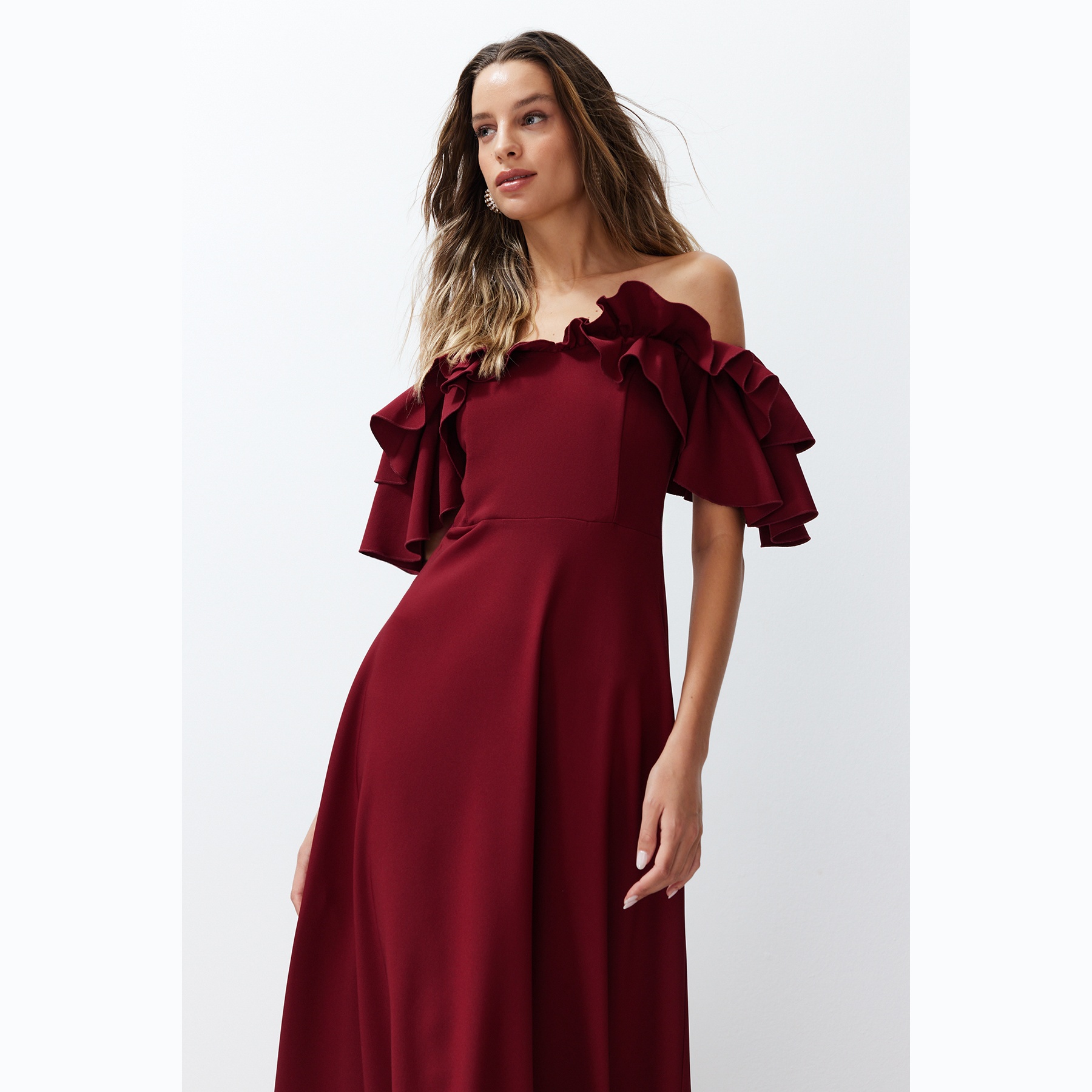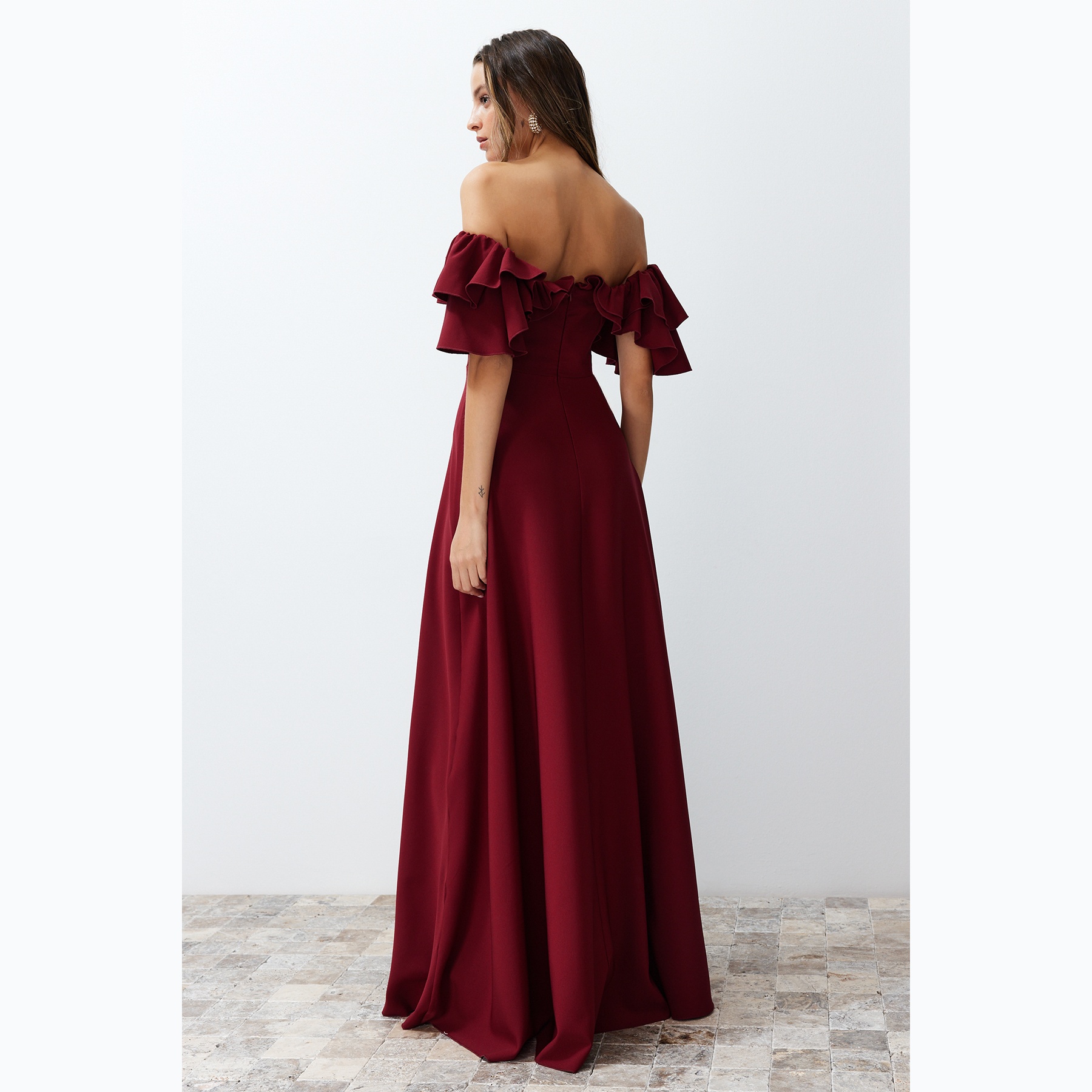 فستان سهرة بلون بوردو جذاب، مصمم بقصة A-line انسيابية تبرز جمال القوام، مع خامة دوكوم ناعمة وتفاصيل كشكش تضيف حركة أنثوية ساحرة. يأتي بياقة كارمن مكشوفة، بدون أكمام، وطول ماكسي يمنحك حضورًا راقيًا في المناسبات الخاصة مثل حفلات التخرج أو السهرات الرسمية.