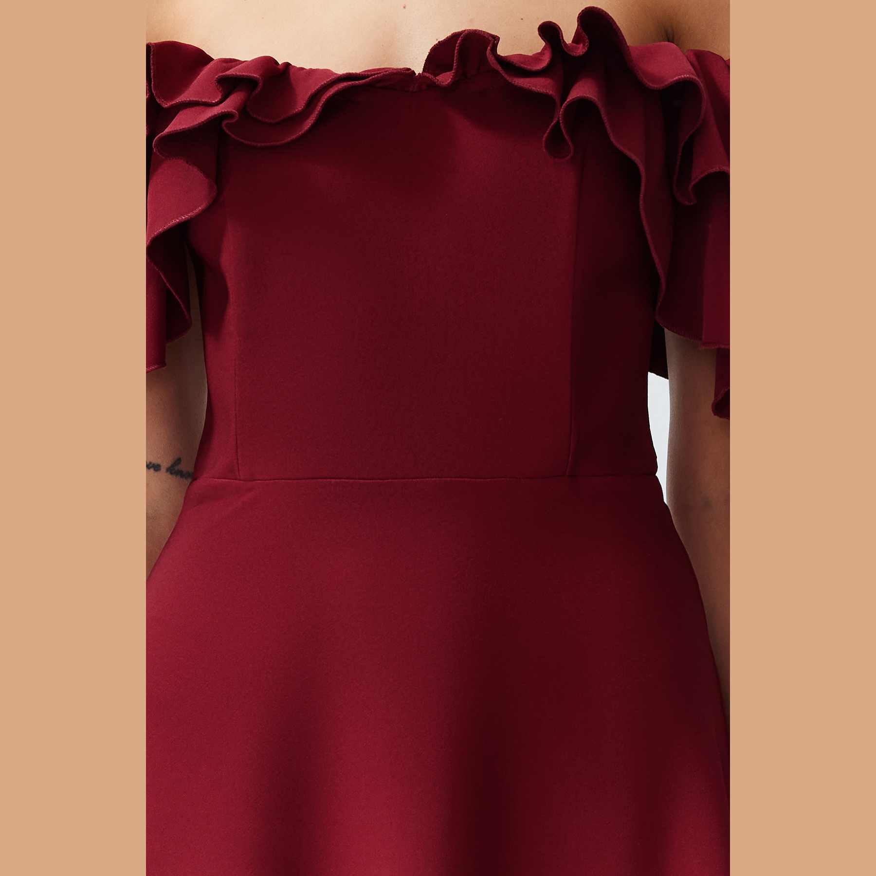 فستان نسائي – بوردو طويل بقصة A وقماش دوكوم مع تفاصيل كشكش (إطلالة أنثوية بلمسة فاخرة)
