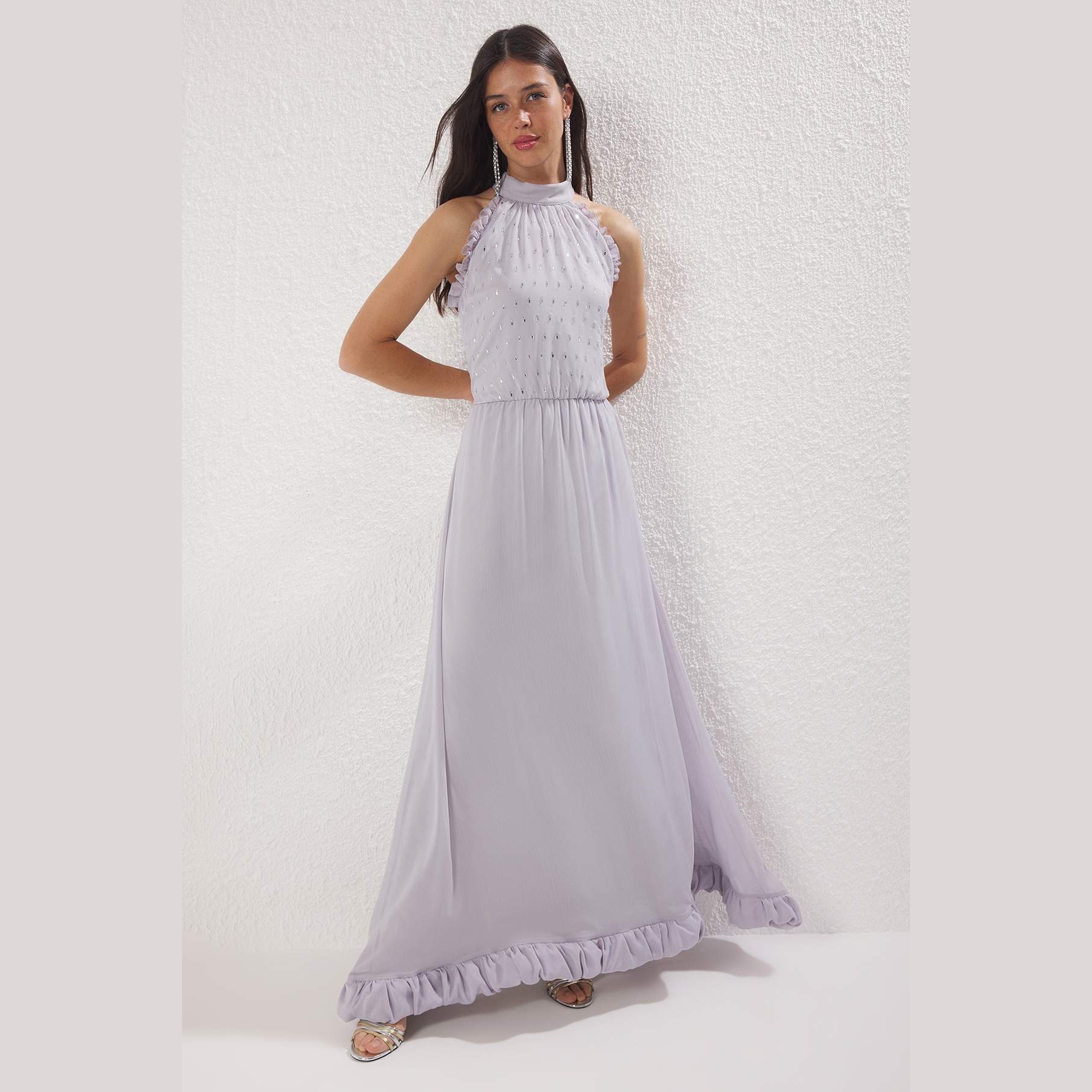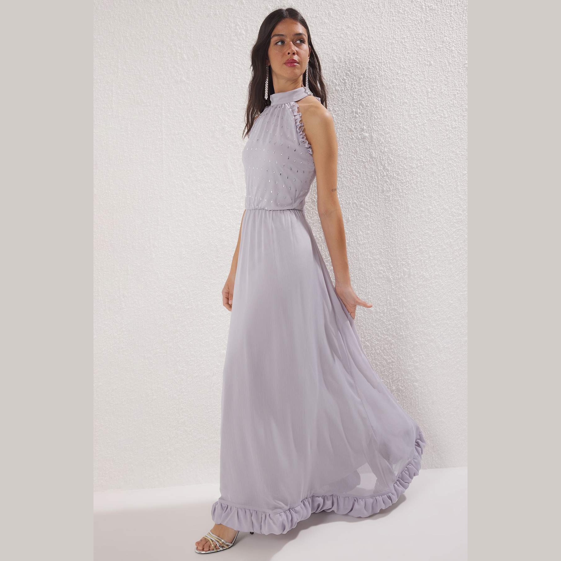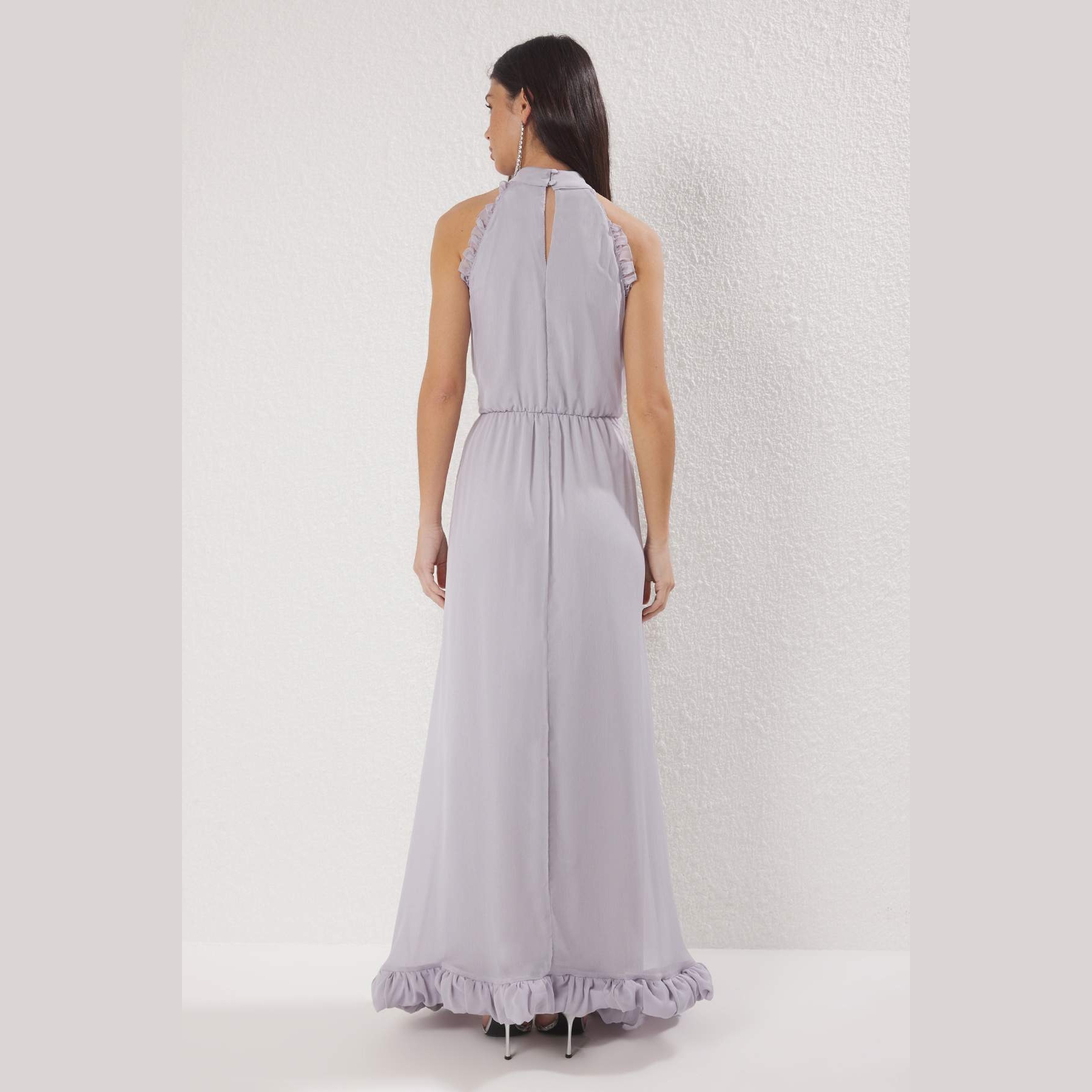 فستان نسائي – رمادي طويل مزين بالأحجار وتفاصيل كشكش أنيقة (إطلالة ملكية بلمسة براقة)