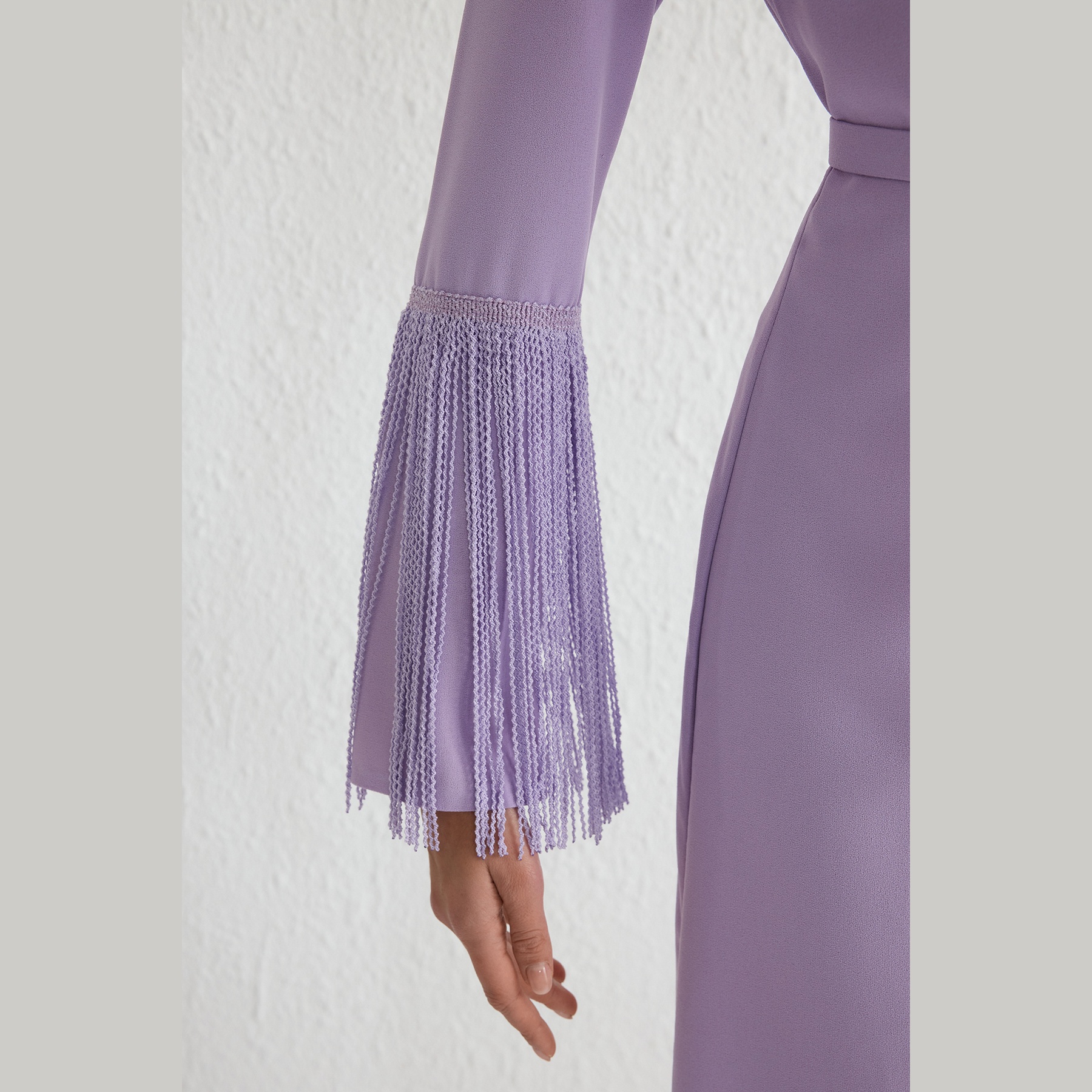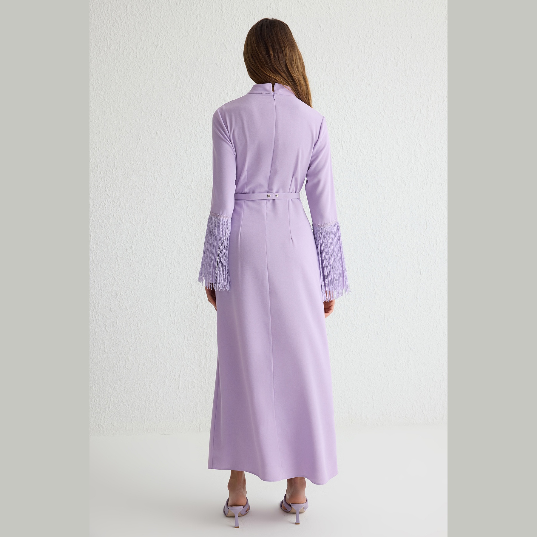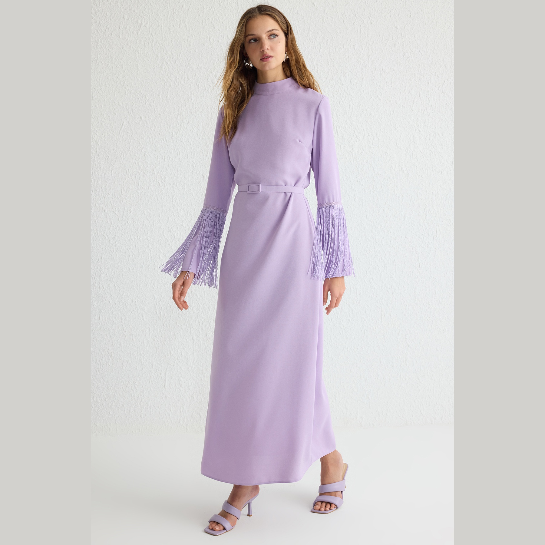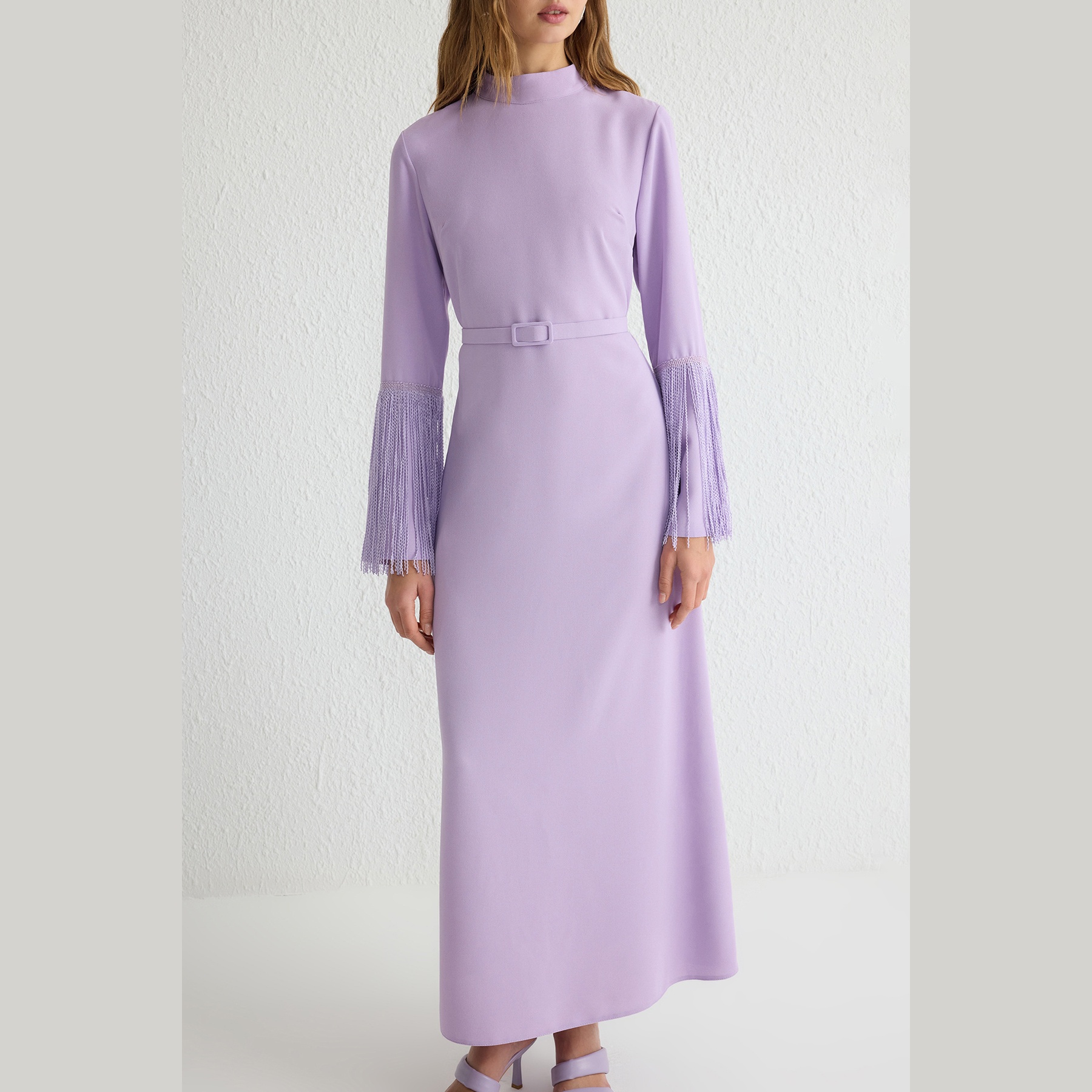 فستان سهرة بلون ليلكي ناعم، مصمم بقصة Shift انسيابية وطول ماكسي، مع تفاصيل شراريب تضيف حركة أنثوية جذابة. يأتي بياقة مستديرة مغلقة، وأكمام طويلة، وخامة دوكوم ناعمة بدون بطانة، ما يجعله خيارًا مثاليًا للمناسبات الخاصة التي تتطلب أناقة محتشمة بأسلوب عصري.