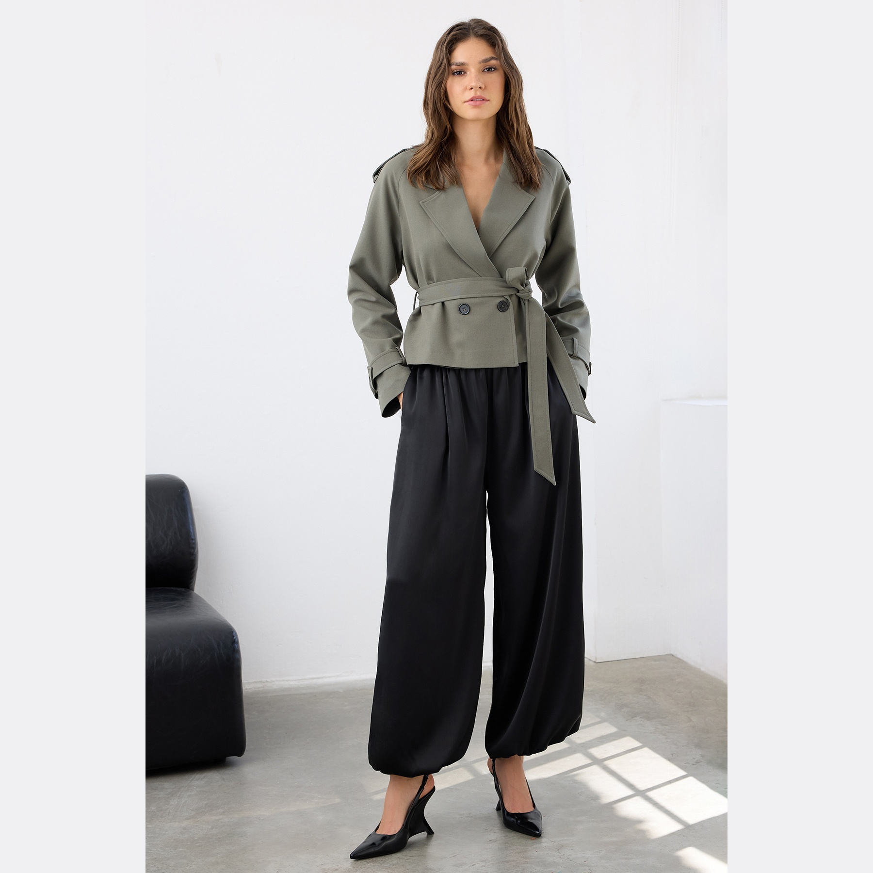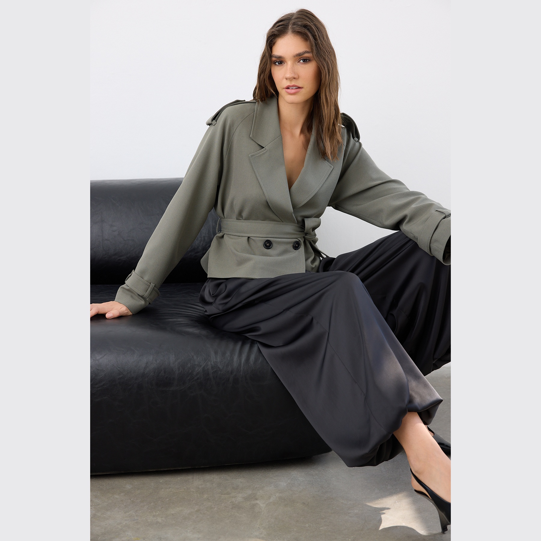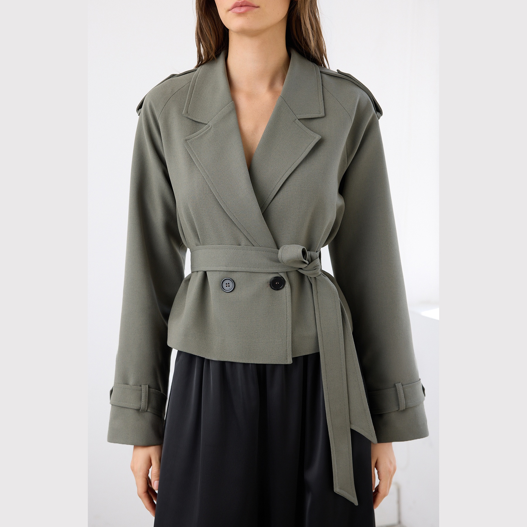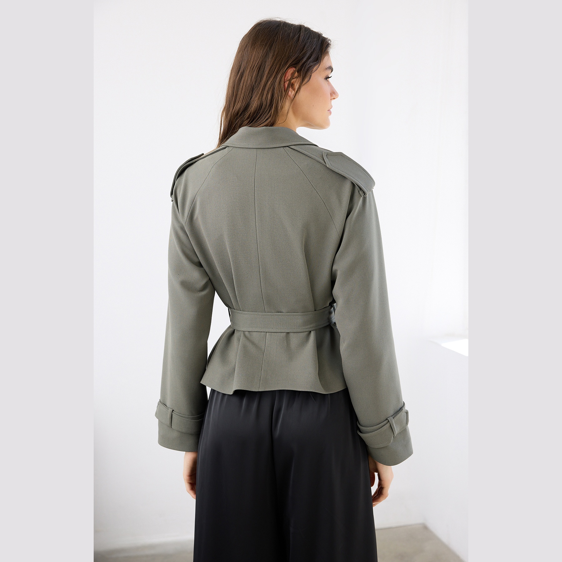 بليزر نسائي – هاكي بتصميم قصير من خامة فاخرة محاكة (أناقة عملية بلمسة عصرية)