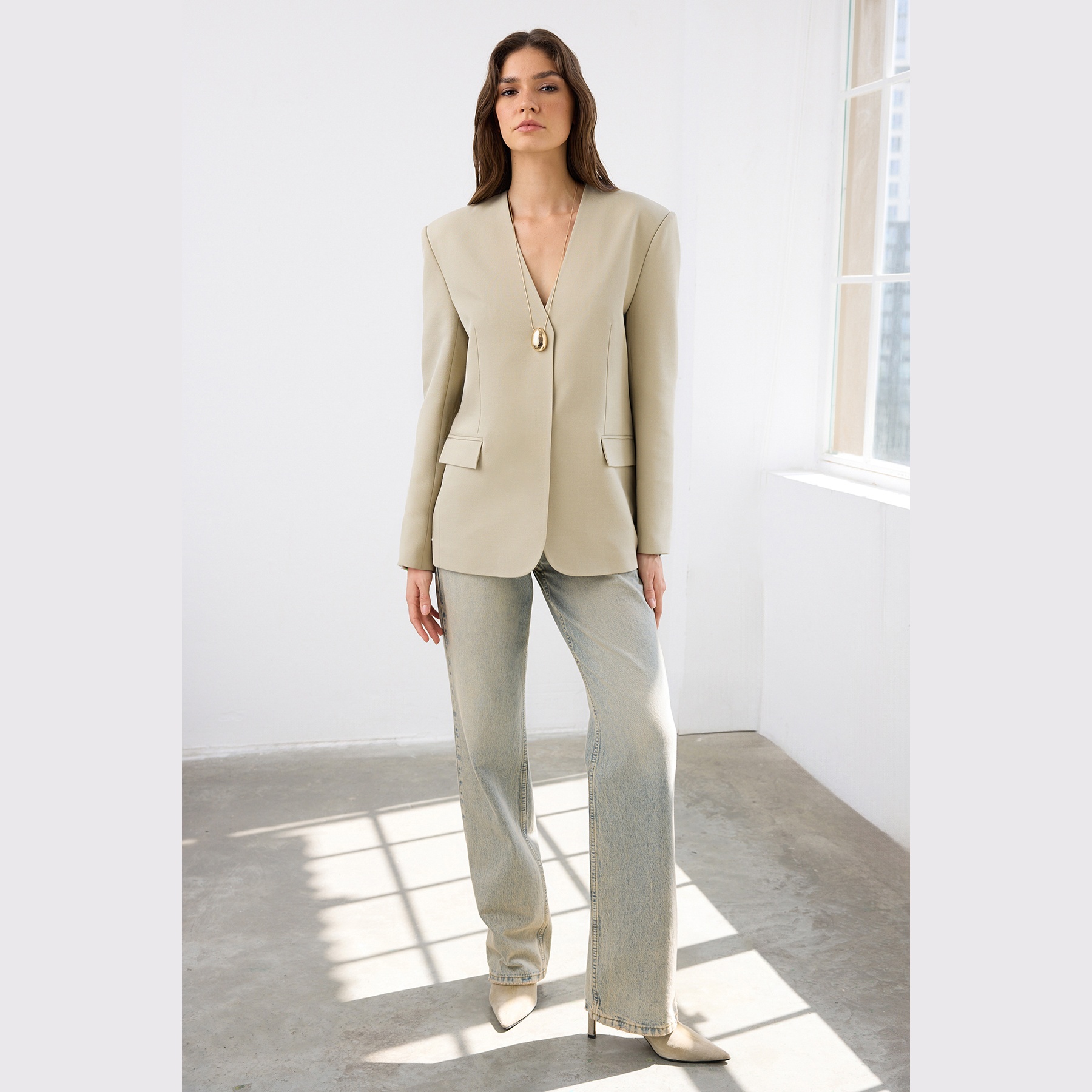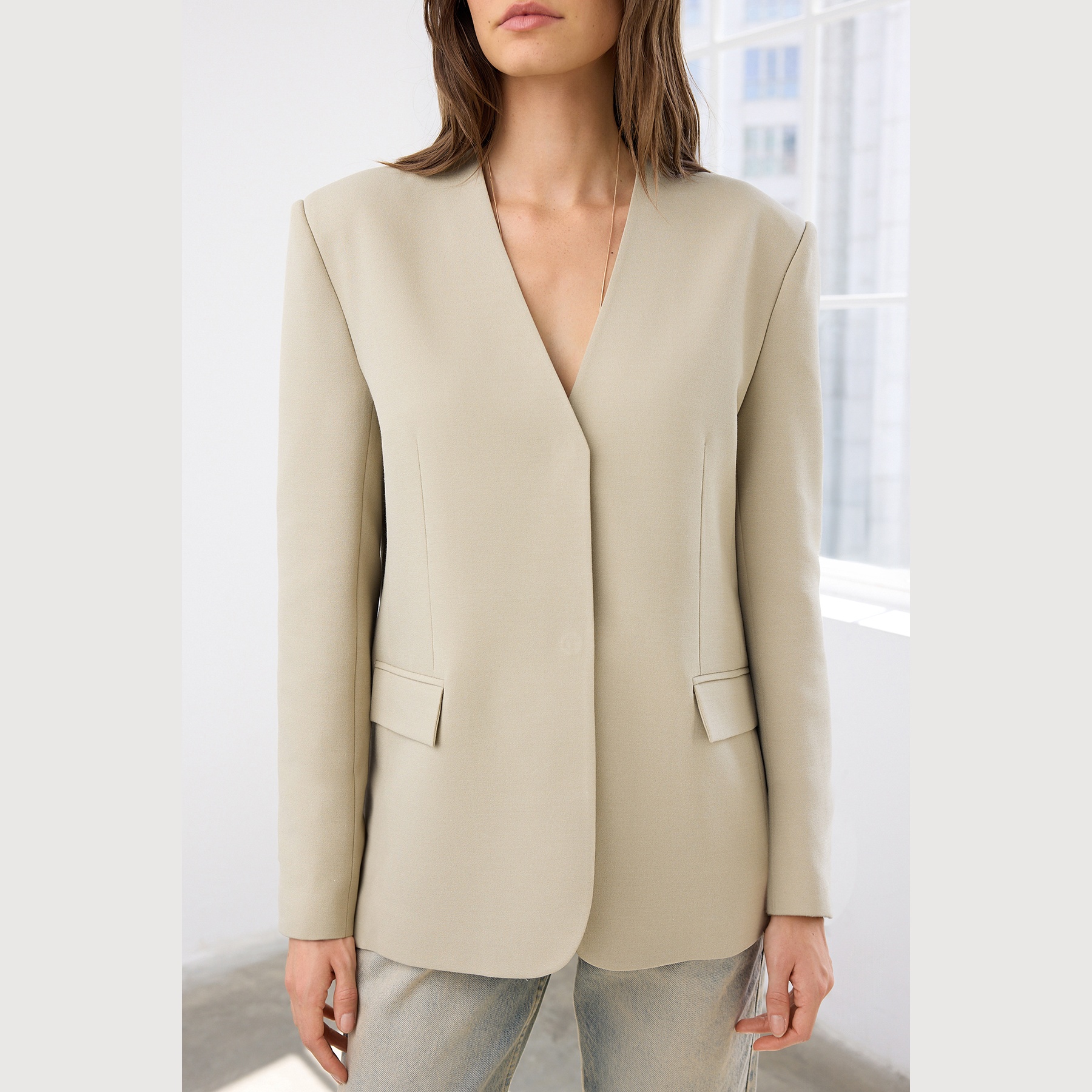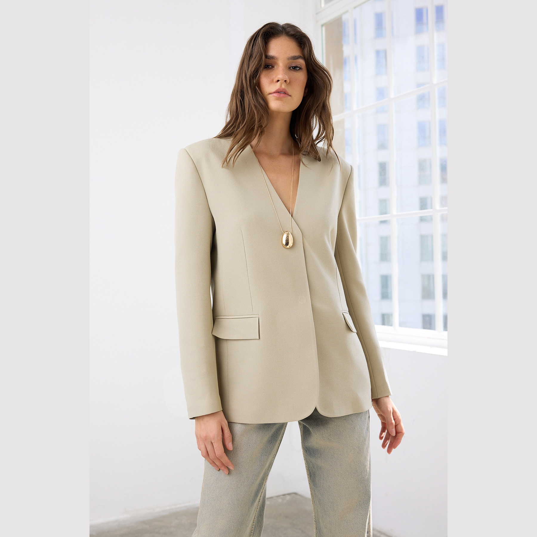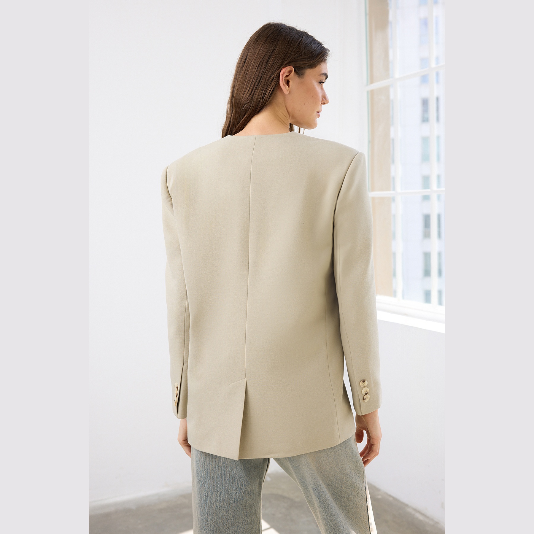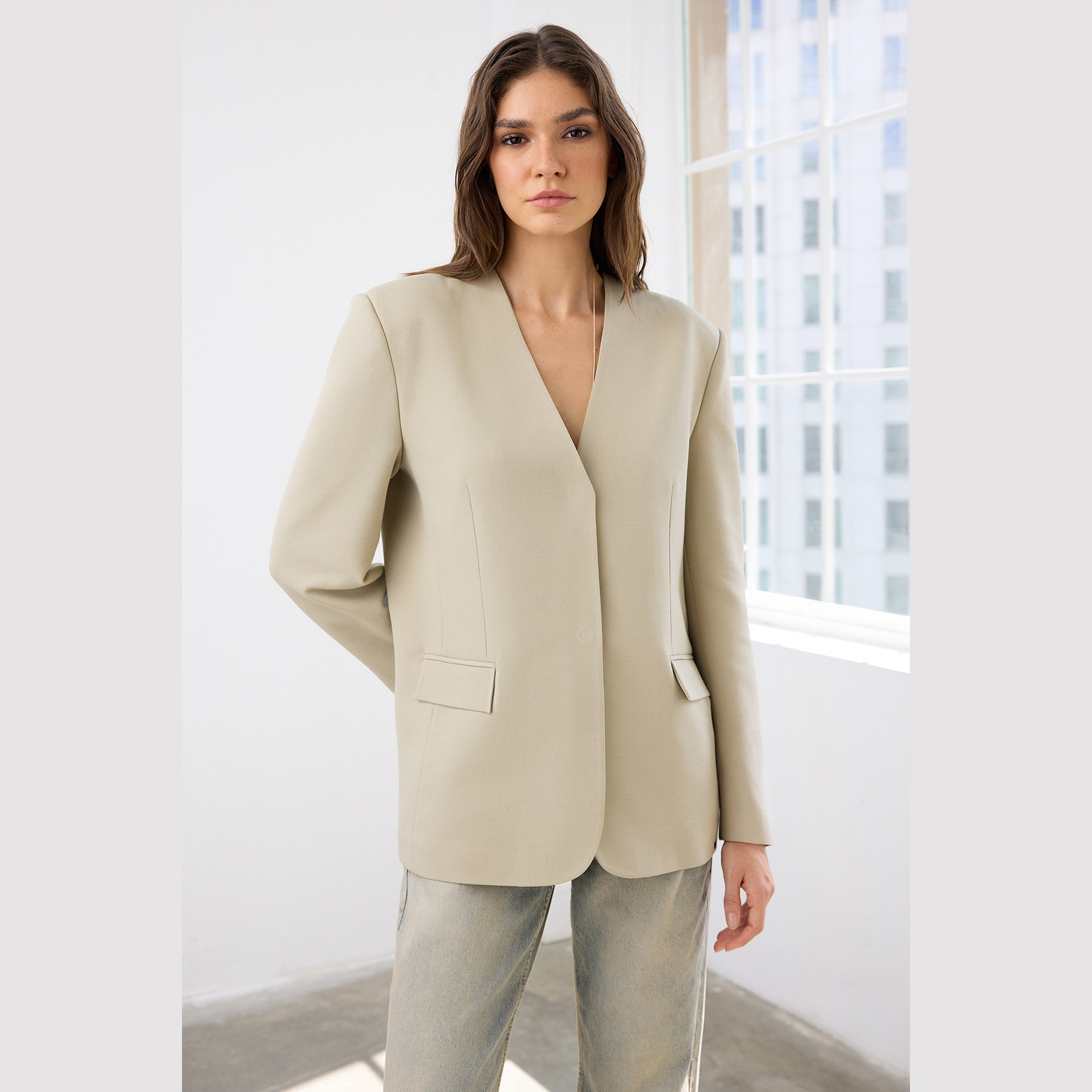 بليزر نسائي – بيج فاتح بدون ياقة وبإغلاق كبّاس (أناقة ناعمة بلمسة رسمية)