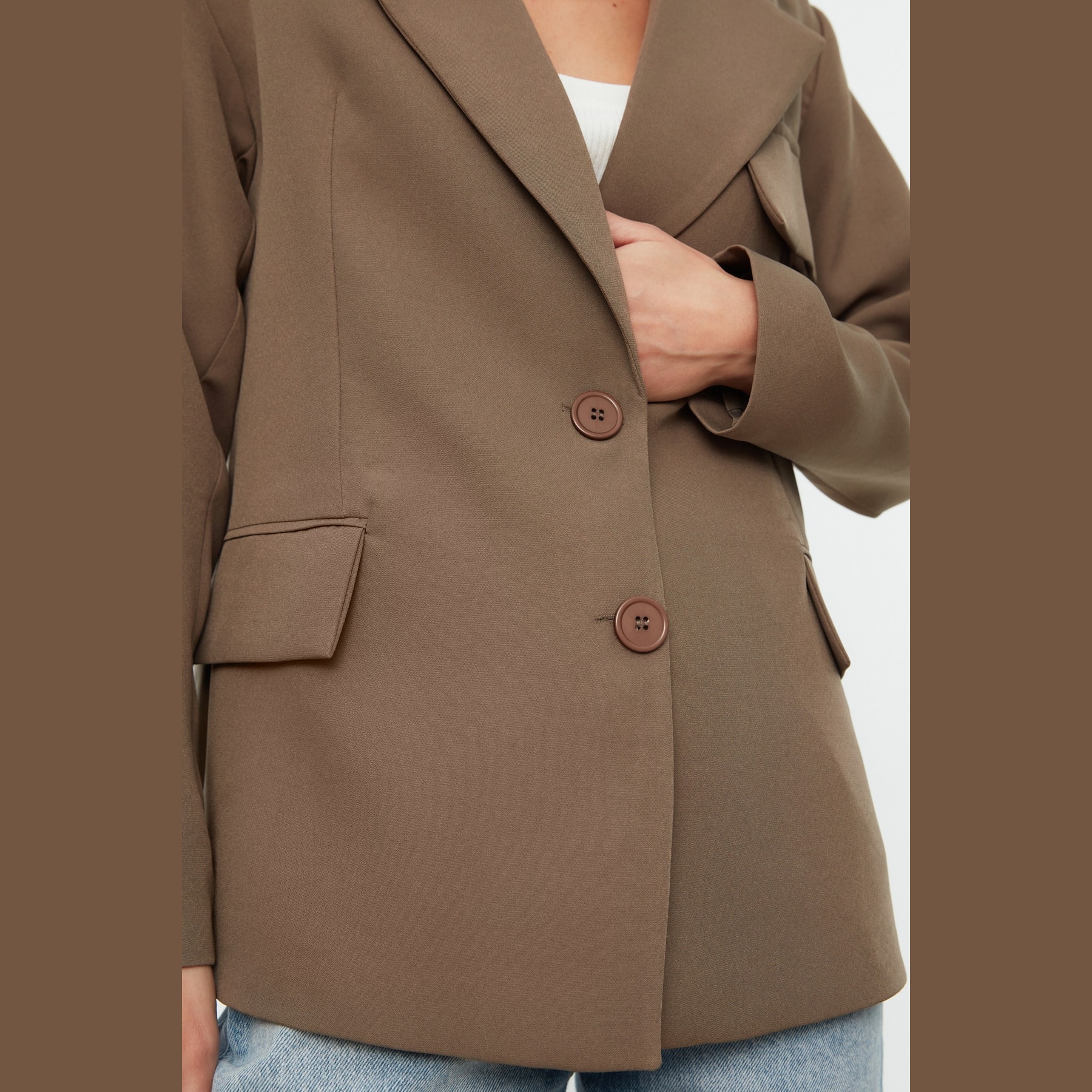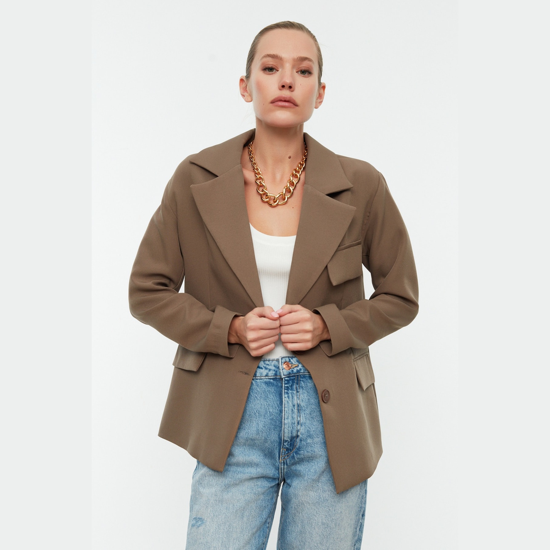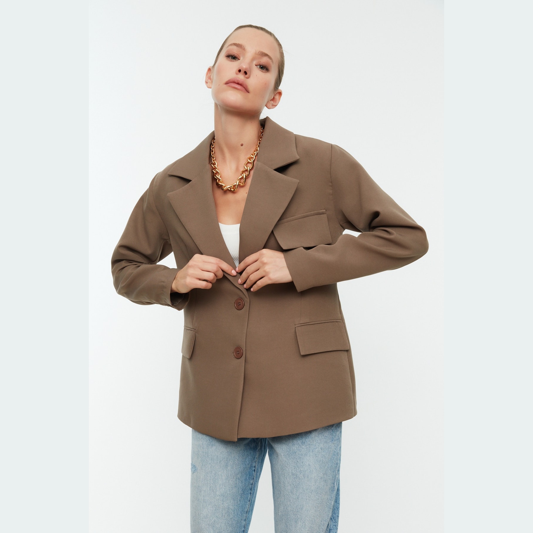 بليزر أنيق بلون بيج فاتح (Vizon)، يتميز بقصة واسعة (Oversize) تمنحك مظهرًا عصريًا مريحًا، مع إغلاق أمامي كروڤاز وزر مزدوج. مصنوع من خامة محاكة متينة ومبطّن بالكامل، ما يجعله مثاليًا للإطلالات اليومية أو العملية في المواسم الانتقالية.