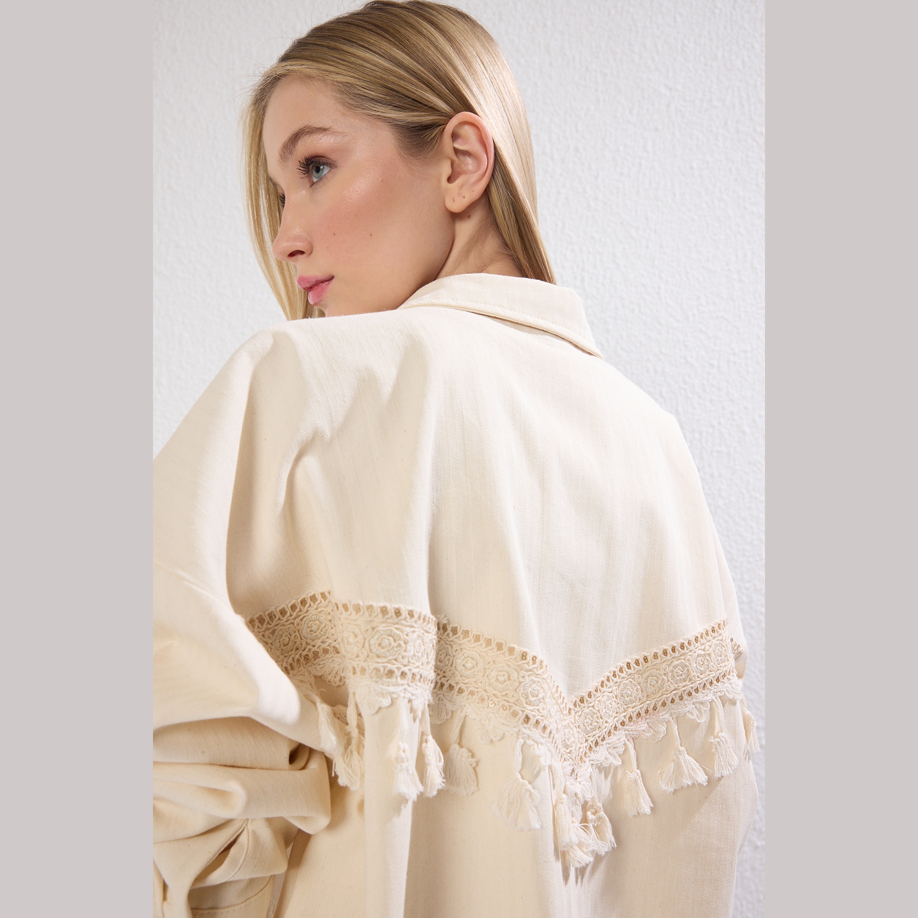 جاكيت بلون بيج هادئ، مصنوع من خامة جبردين قطنية بالكامل، يتميز بتفاصيل دانتيل أنثوية في الجهة الخلفية تضيف لمسة ناعمة للتصميم. يأتي بقصة منتظمة (Regular) وياقة قميص كلاسيكية، مع أكمام طويلة وجيوب أمامية عملية، ما يجعله مثاليًا للإطلالات اليومية في المواسم الانتقالية.