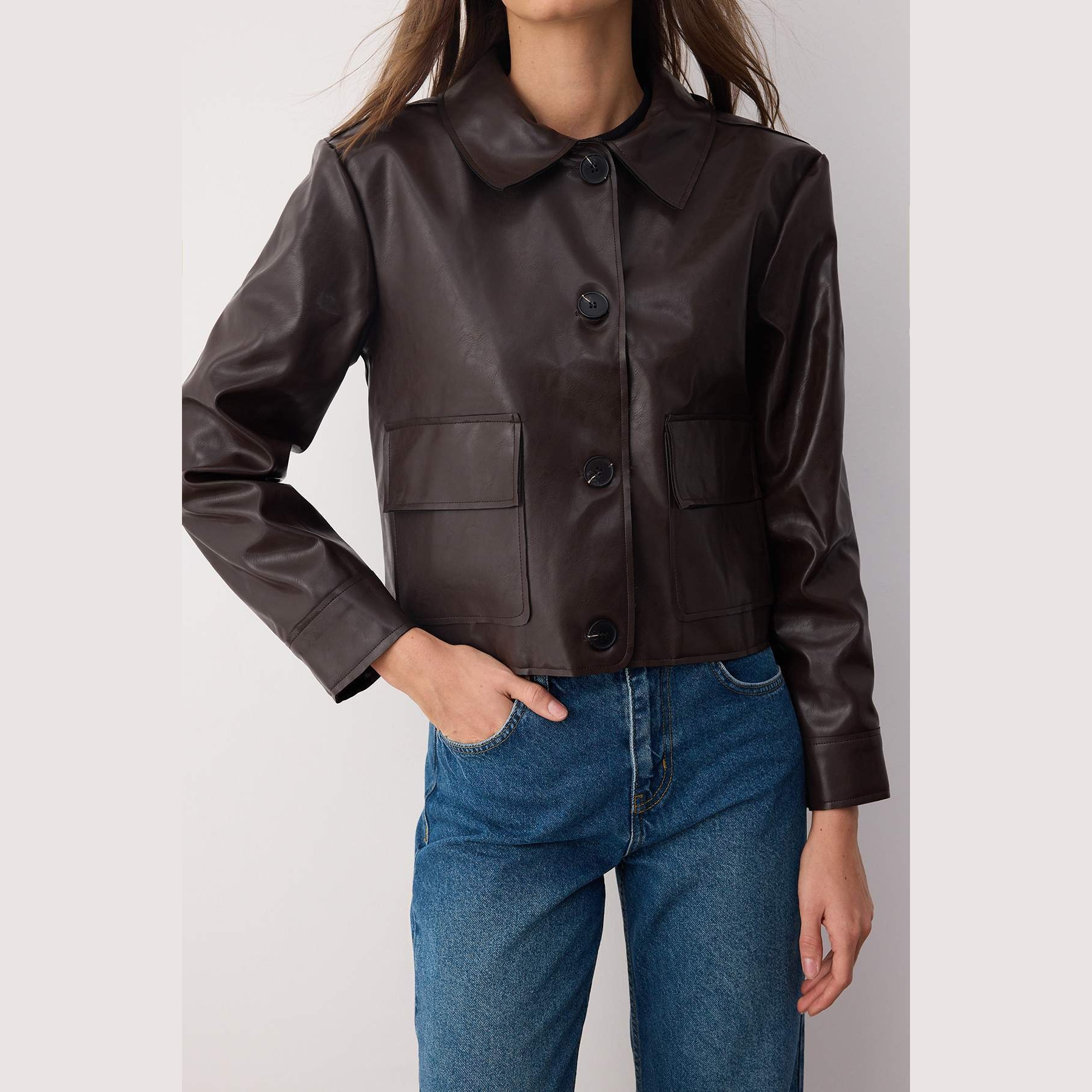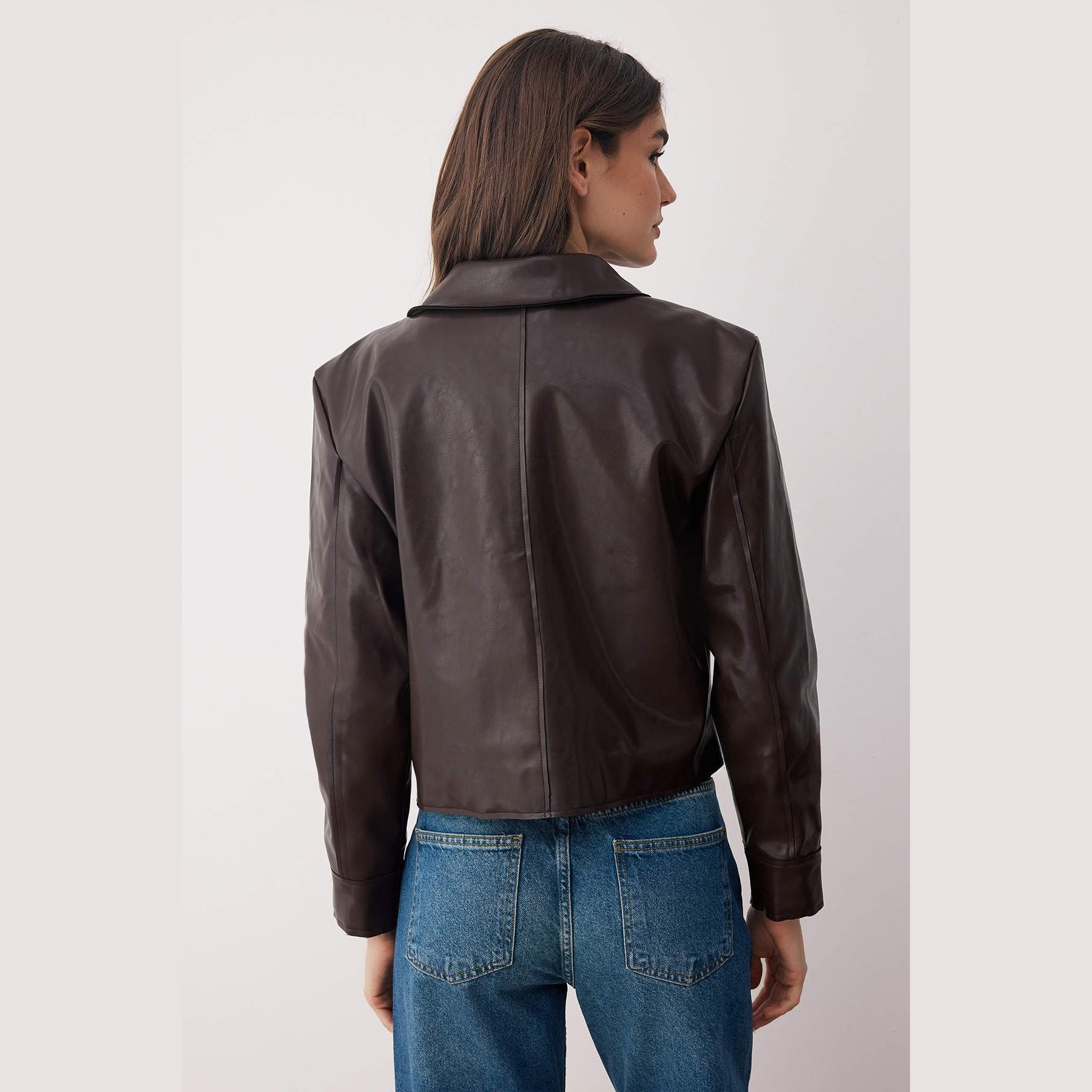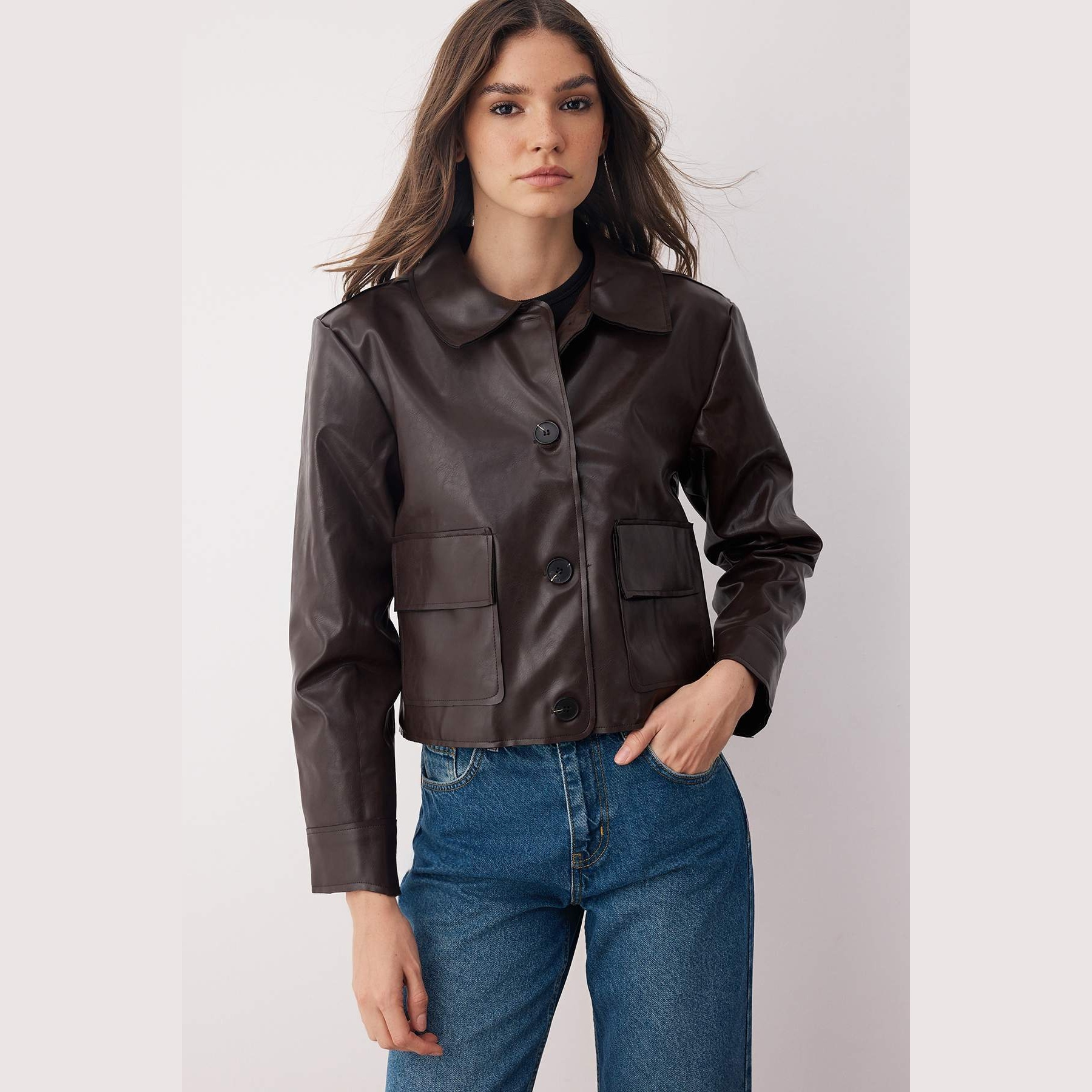 جاكيت نسائي – بني داكن من الجلد الصناعي بياقة قميص من خامة محاكة (أناقة شتوية بلمسة عصرية)