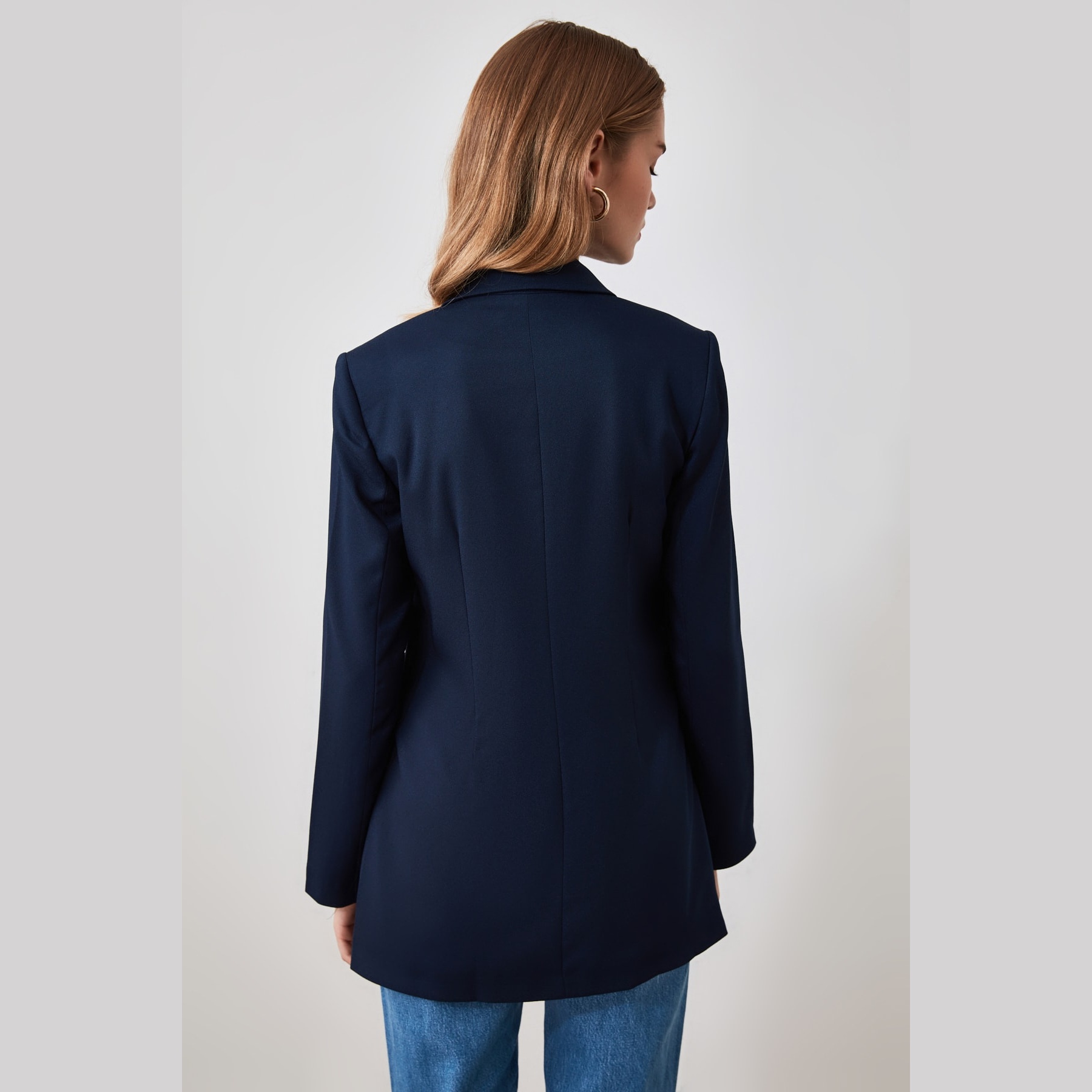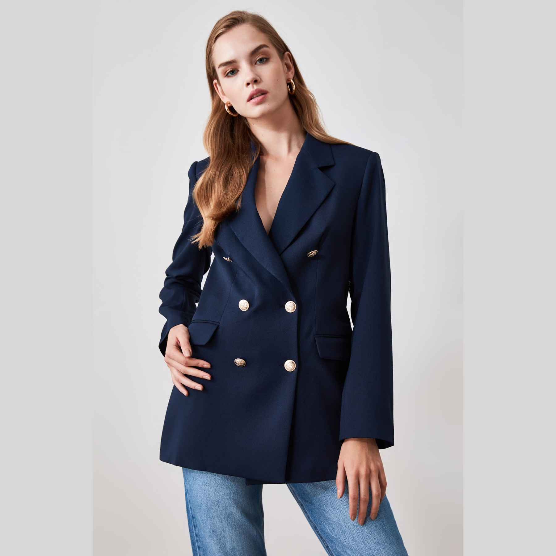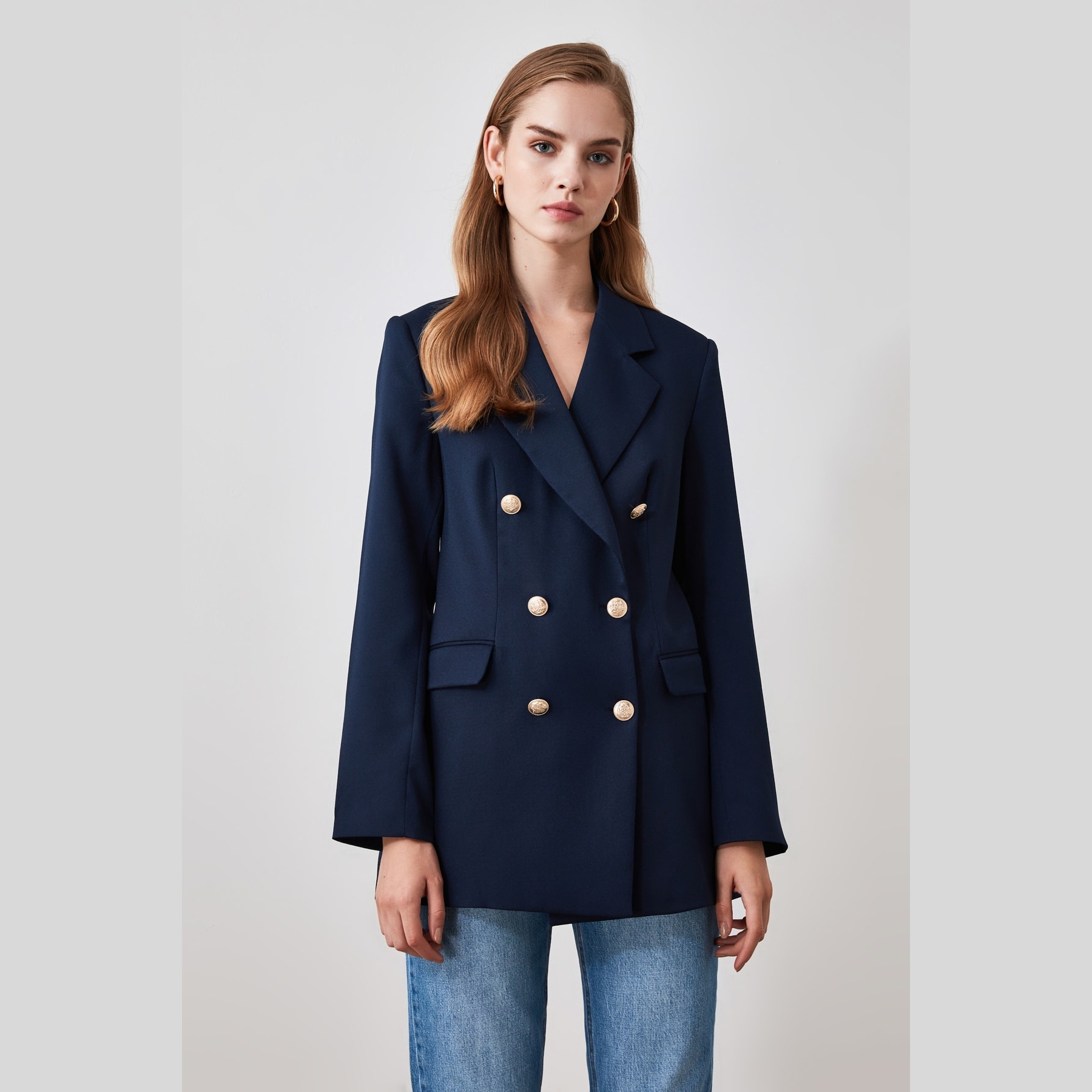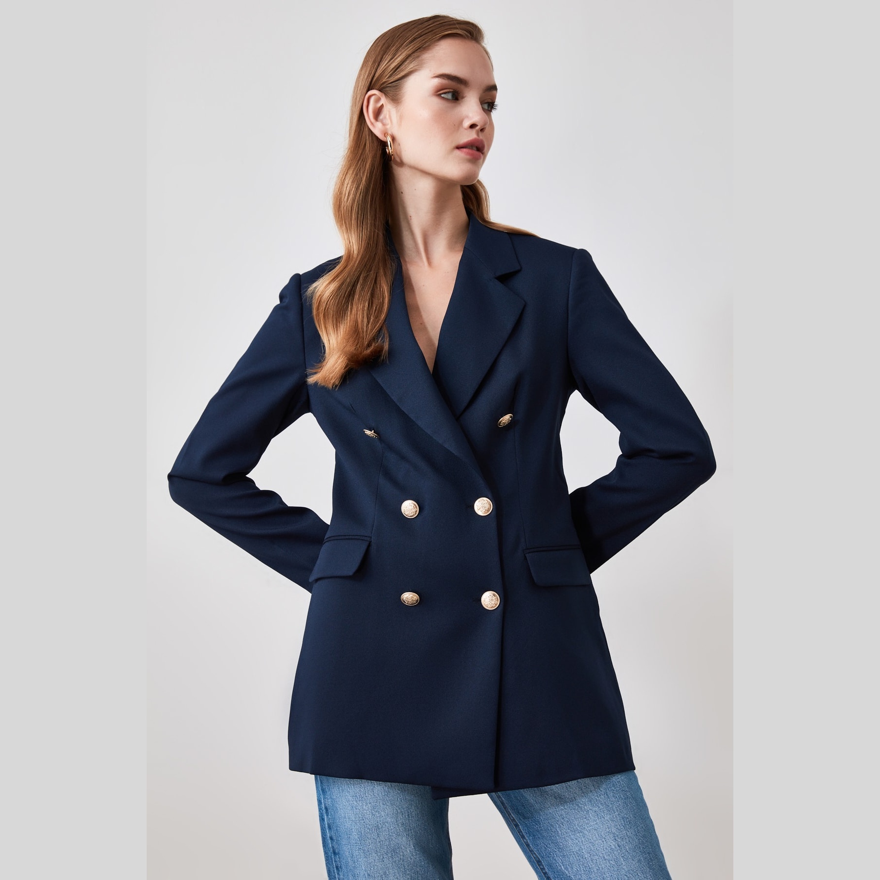 بليزر أنيق بلون كحلي داكن، يتميز بقصة واسعة (Oversize) تمنحك مظهرًا عصريًا مريحًا، مع إغلاق أمامي كروڤاز وزر مزدوج. مصنوع من خامة محاكة متينة ومبطّن بالكامل، ما يجعله مثاليًا للإطلالات الرسمية أو العملية في المواسم المعتدلة.