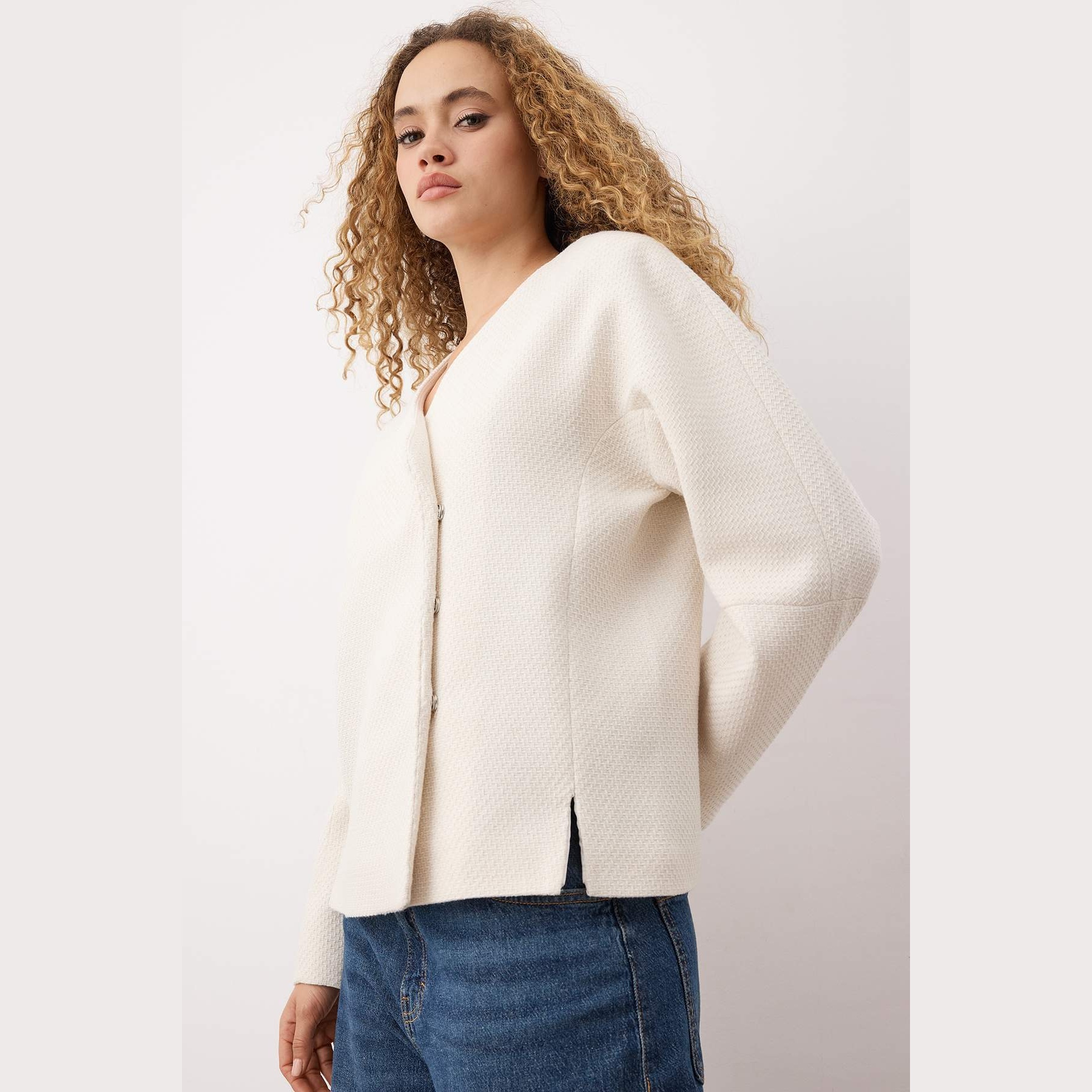 جاكيت أنيق بلون إكرو ناعم، مصنوع من خامة تويد محاكة بتركيبة متعددة الألياف تمنحك ملمسًا دافئًا ومظهرًا راقيًا. يتميز بإغلاق كروڤاز أمامي وزر مزدوج، مع قصة منتظمة (Regular) وياقة V وأكمام طويلة، ما يجعله مثاليًا للإطلالات الشتوية الرسمية أو العملية.