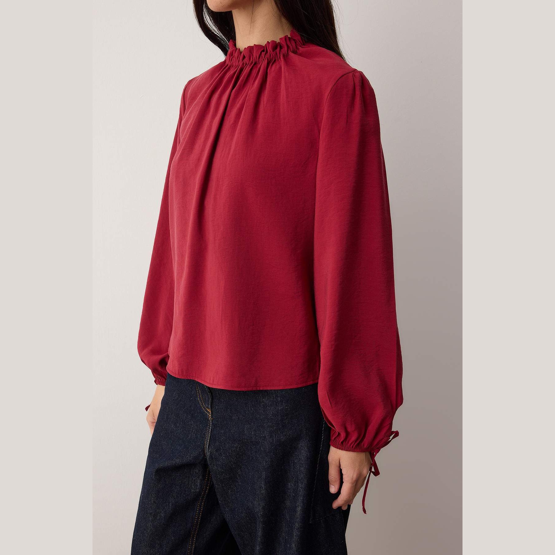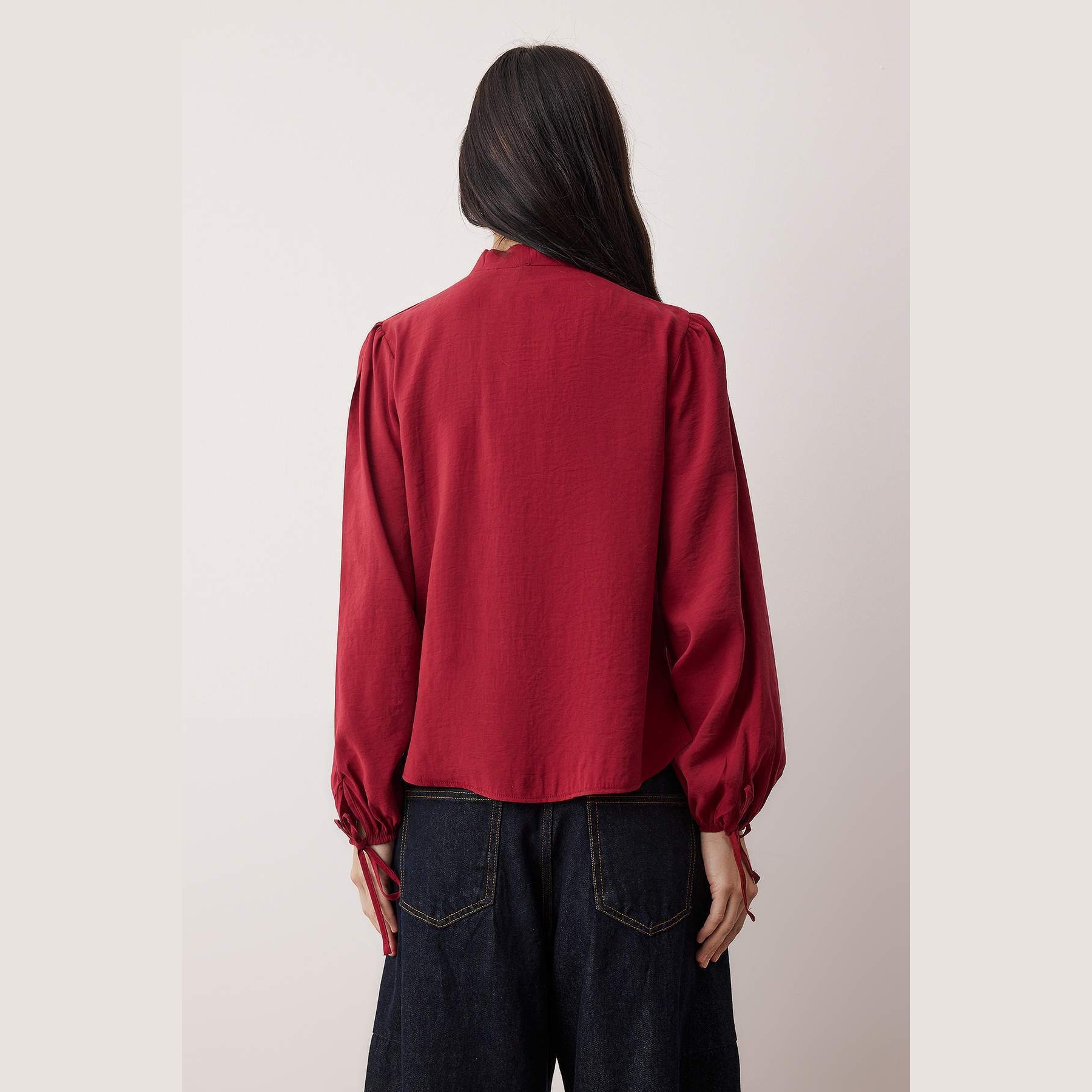بلوزة نسائية – أحمراء بياقة مرتفعة وأكمام منفوخة (إطلالة أنثوية ناعمة بخامة مودال فاخرة)