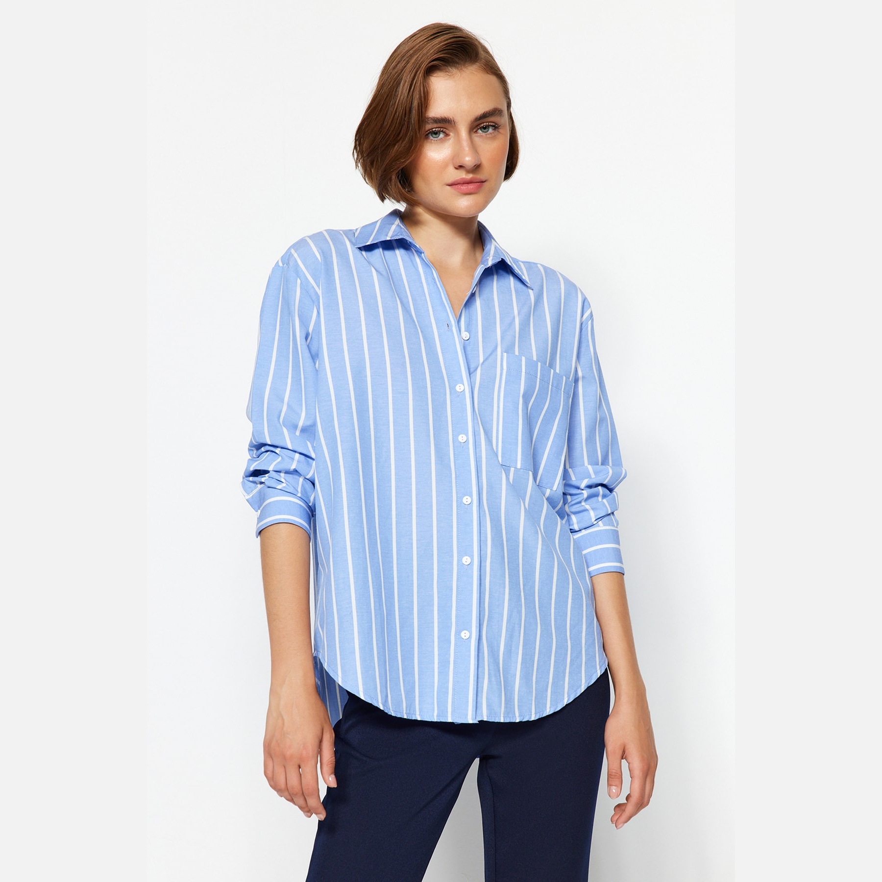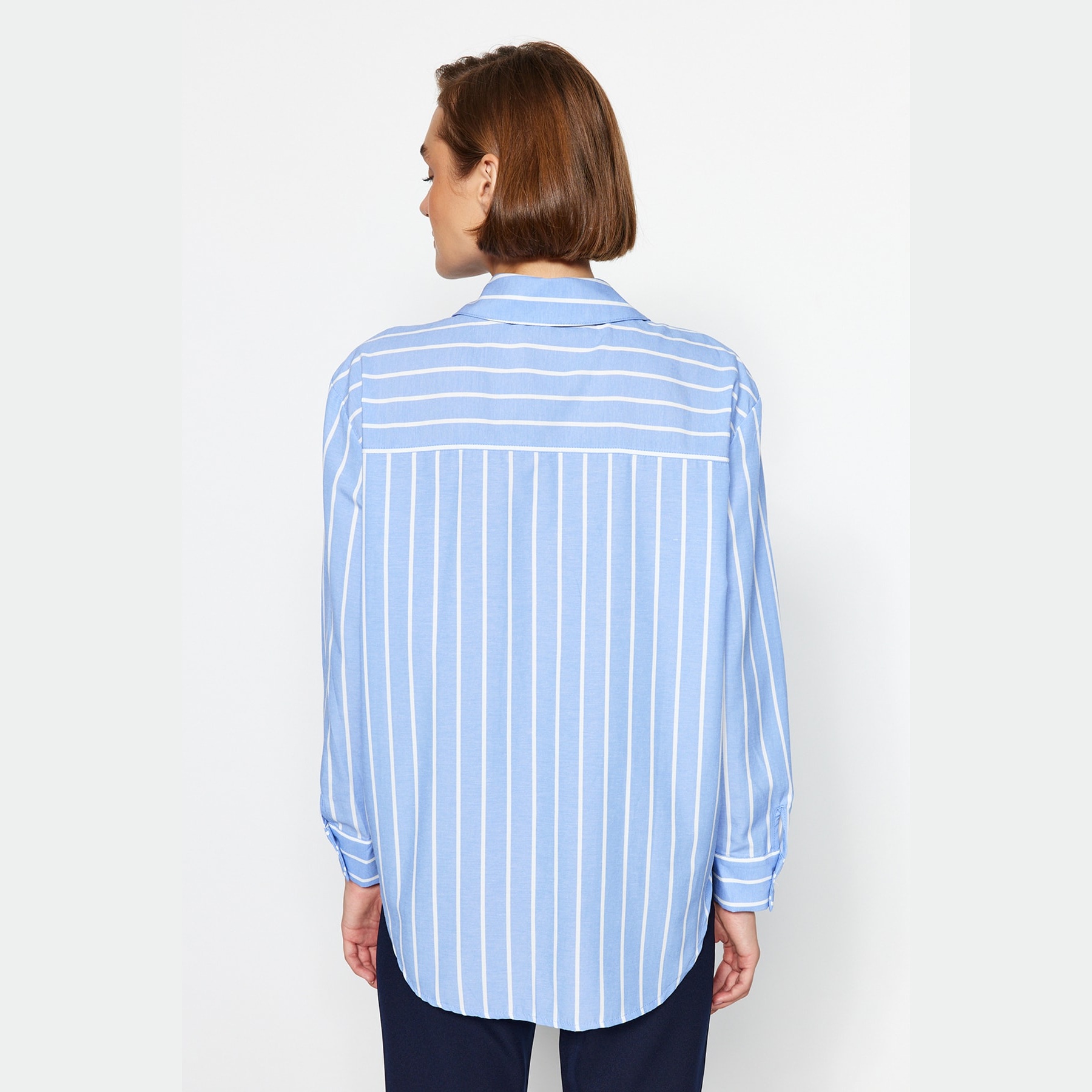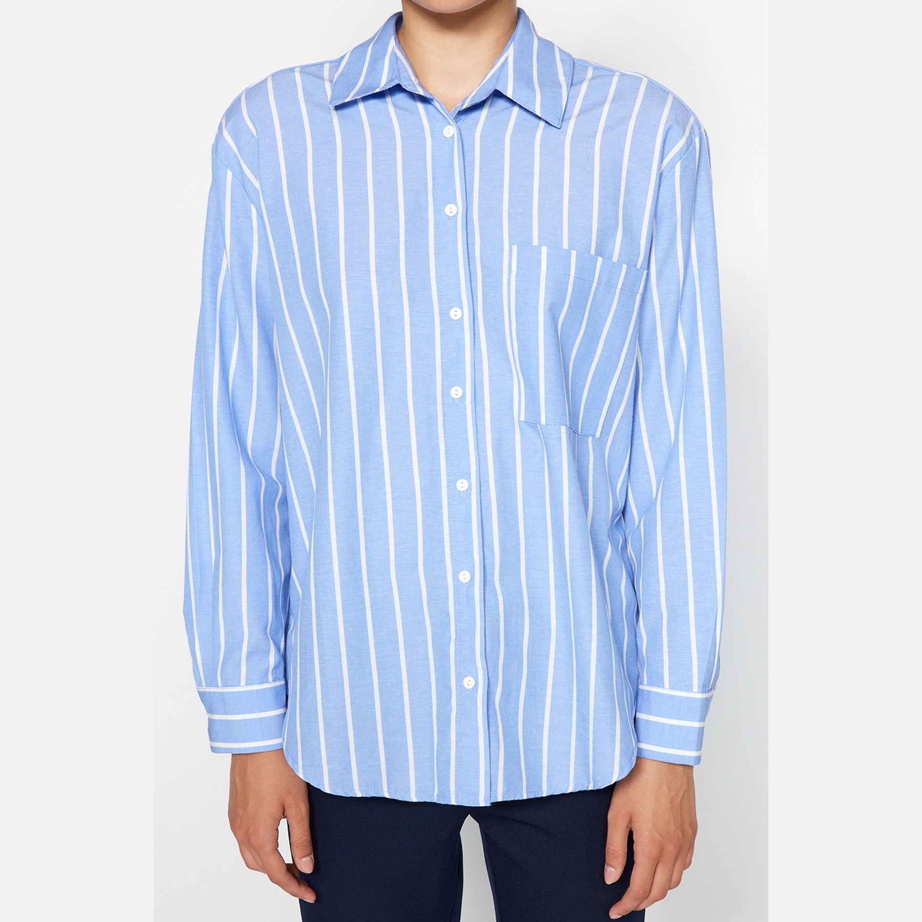 قميص نسائي – أزرق مخطط بقصة واسعة وجيب أمامي (إطلالة يومية مريحة بخامة دوكّوما ناعمة)