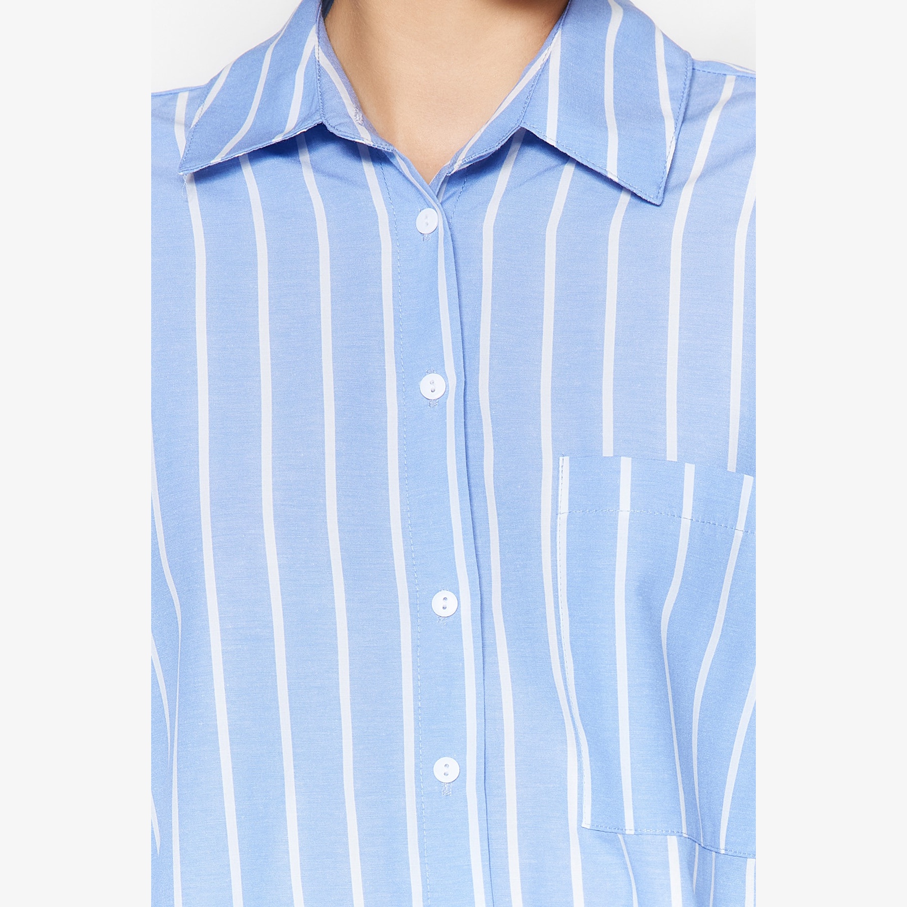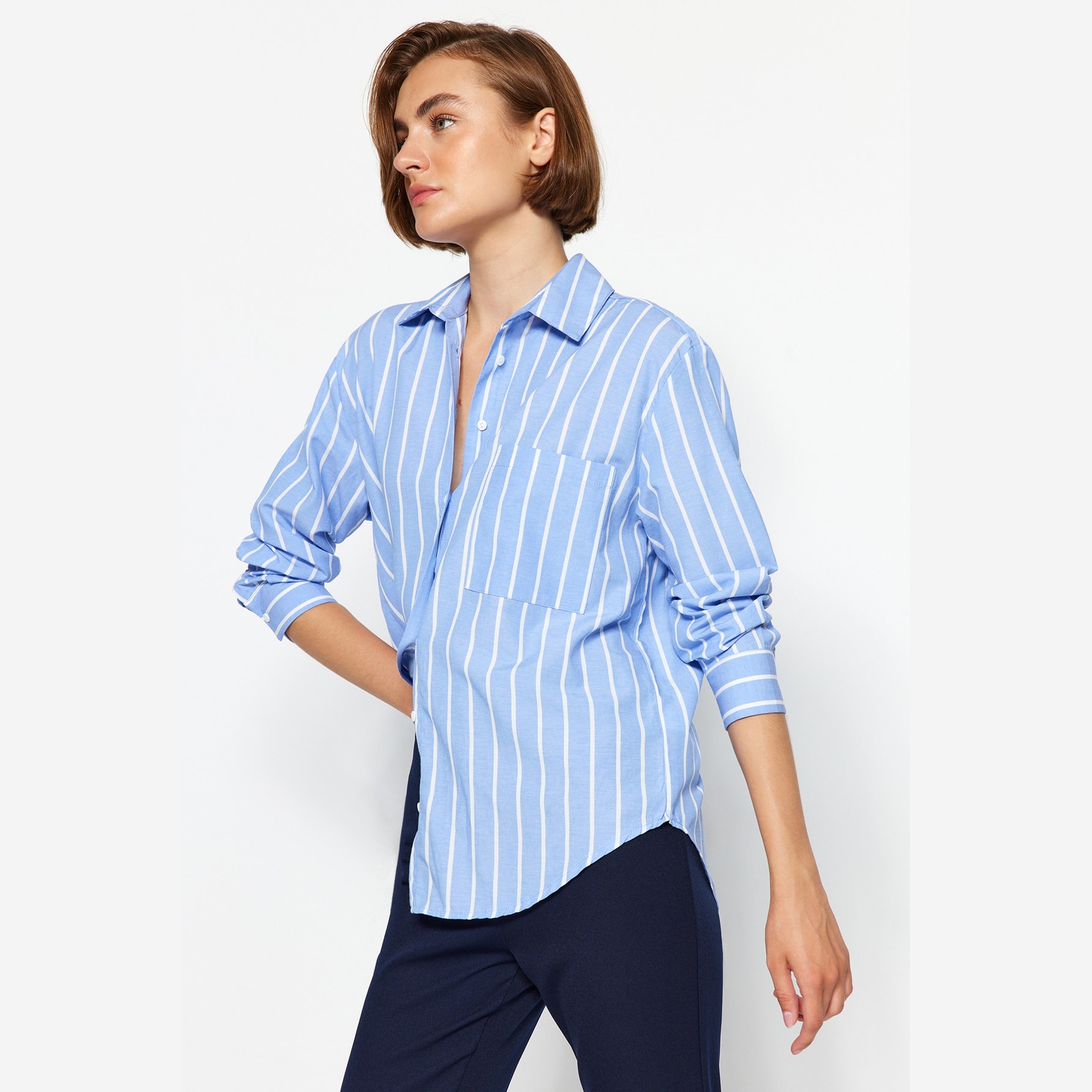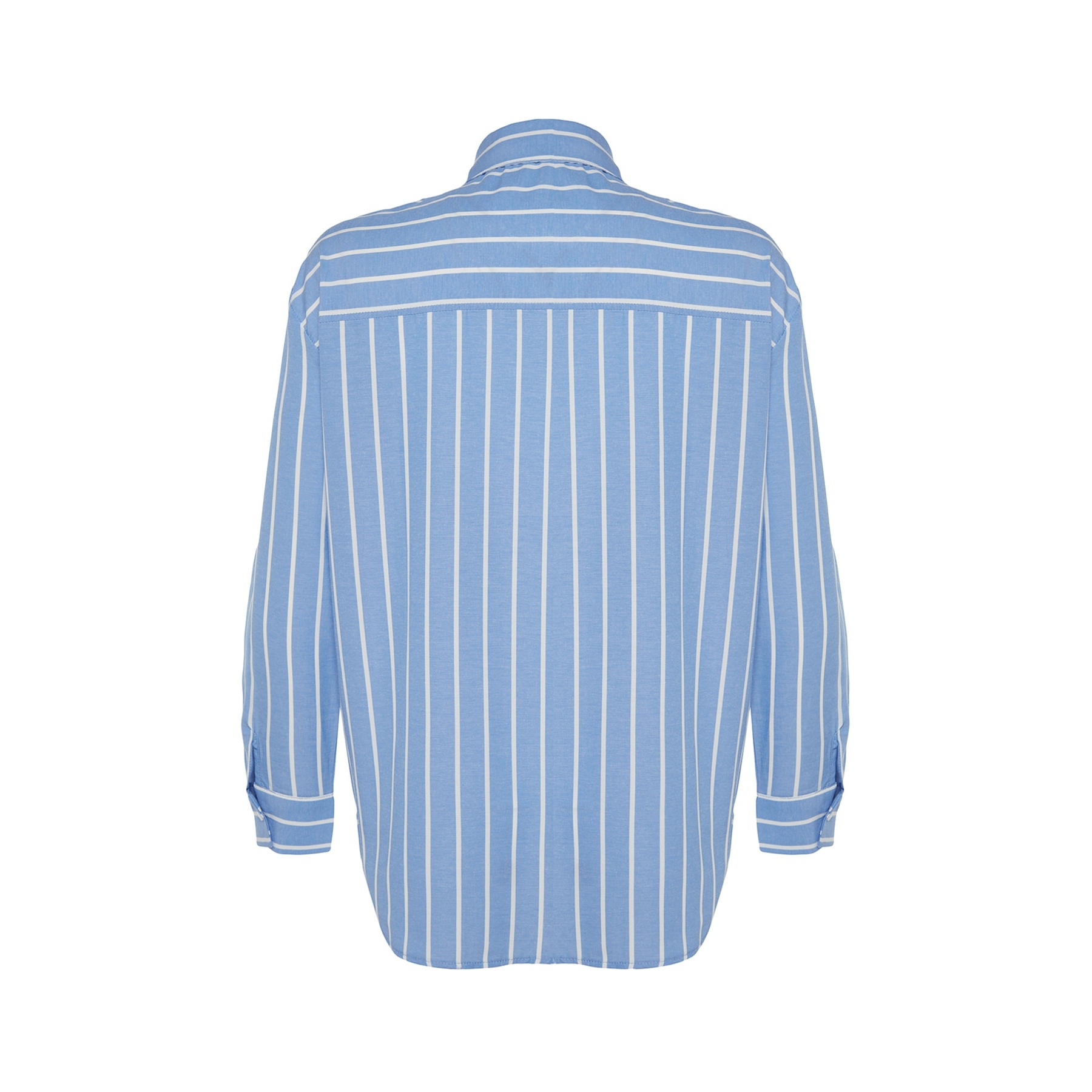 قميص نسائي – أزرق مخطط بقصة واسعة وجيب أمامي (إطلالة يومية مريحة بخامة دوكّوما ناعمة)