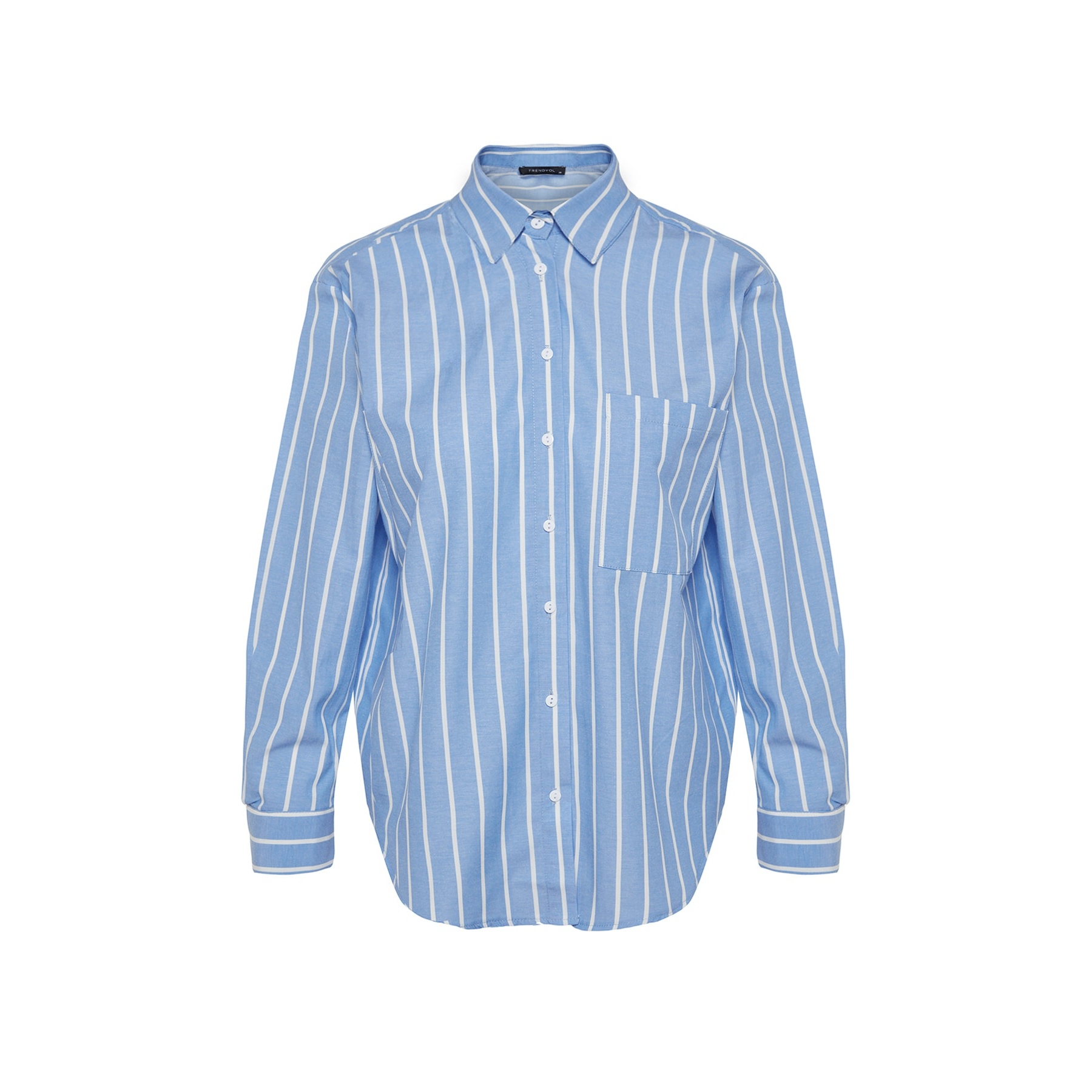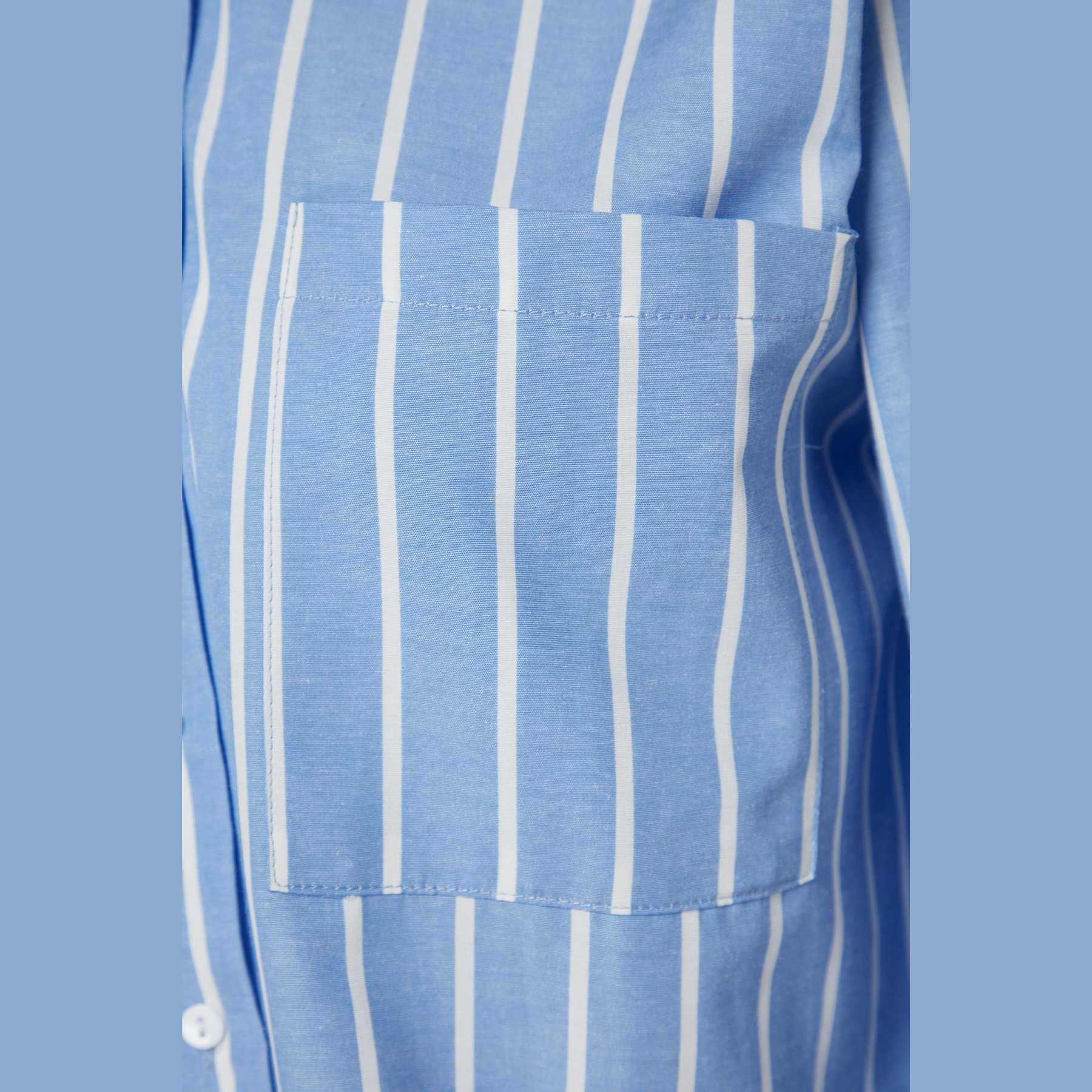 قميص نسائي بلون أزرق مخطط، مصنوع من خامة دوكّوما ناعمة بتركيبة بوليستر وقطن، يمنح ملمسًا مريحًا ومظهرًا عصريًا. يتميز بقصة واسعة، وياقة قميص كلاسيكية، وأكمام طويلة، مع جيب أمامي عملي يضفي لمسة كاجوال على الإطلالة.