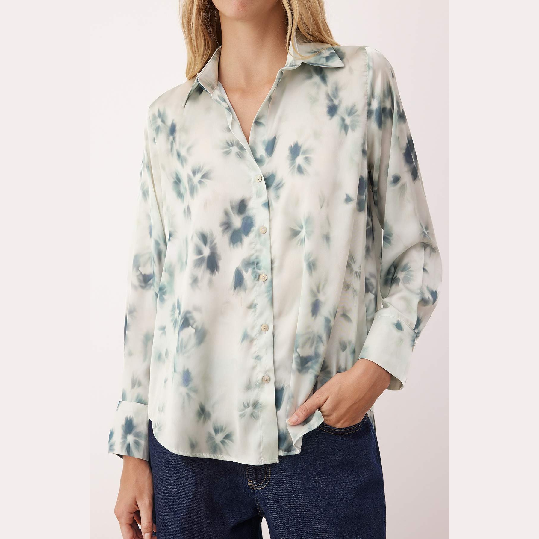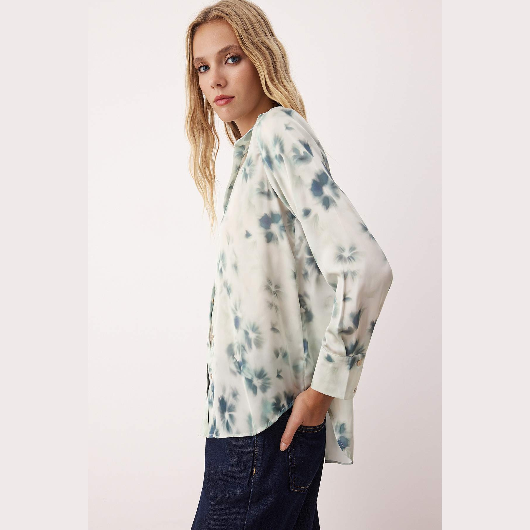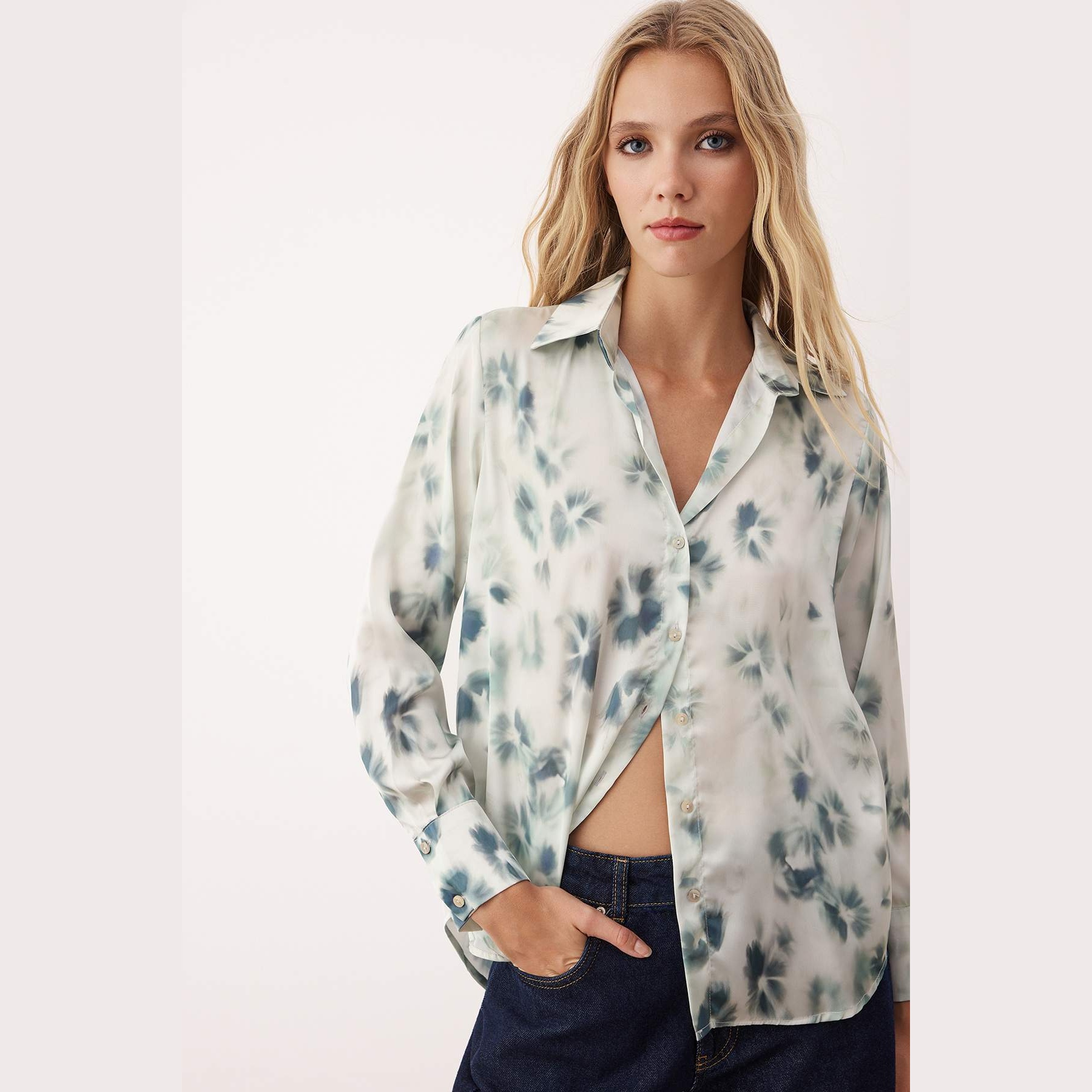 قميص نسائي بلون أخضر مزين بنقشة زهرية، مصنوع من خامة دوكّوما ناعمة بتركيبة بوليستر، يمنح إحساسًا مريحًا ولمسة أنثوية مبهجة. يتميز بياقة قميص كلاسيكية، وأكمام طويلة، وقصة مريحة مناسبة للإطلالات اليومية أو العملية.