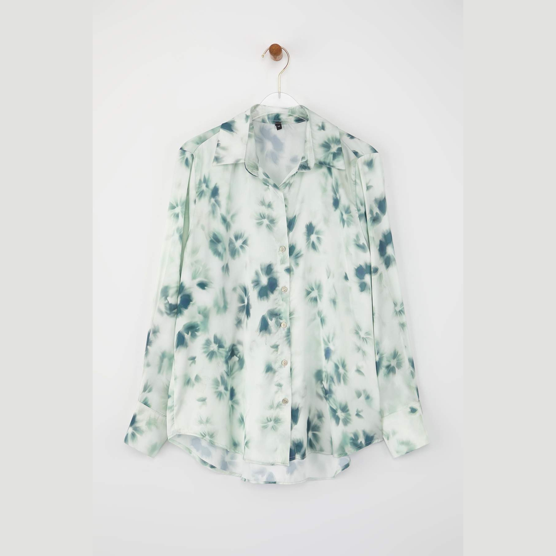 قميص نسائي – أخضر بنقشة زهرية وقصة مريحة (إطلالة أنثوية مفعمة بالحيوية بخامة دوكّوما)