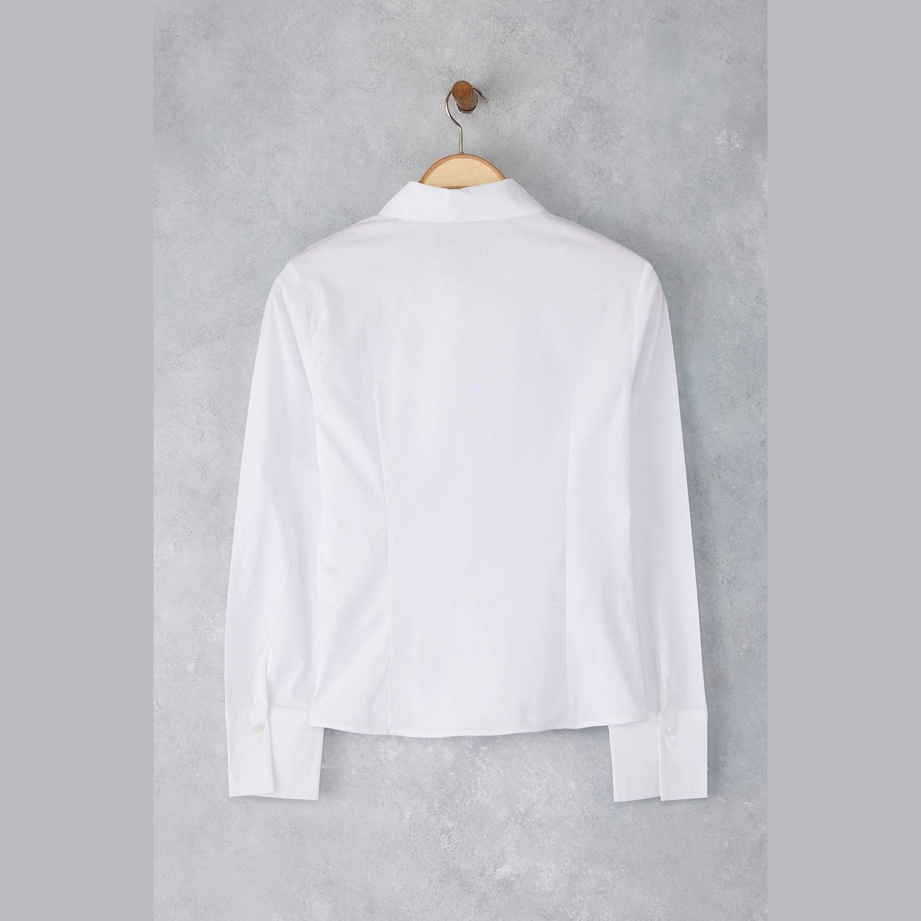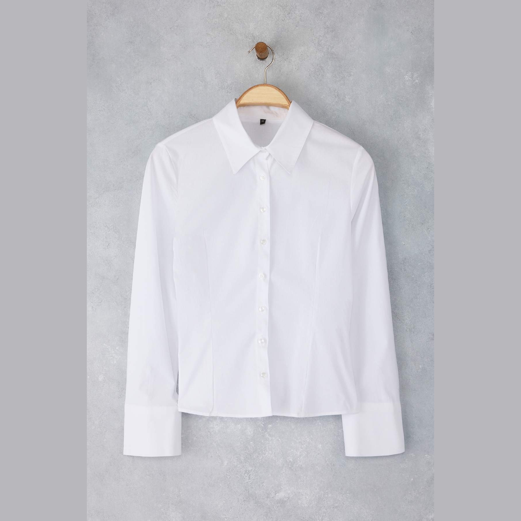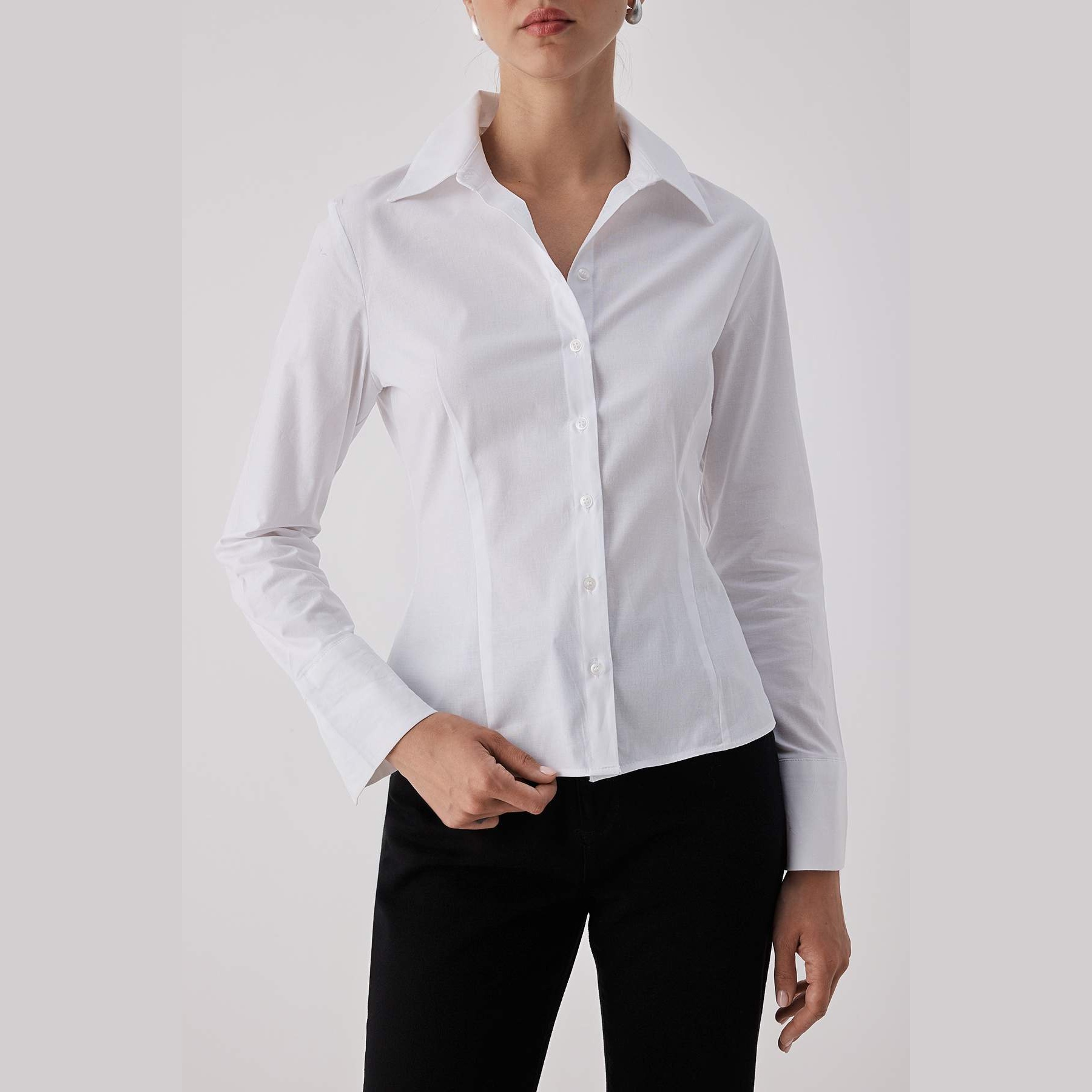 قميص نسائي بلون أبيض، مصنوع من خامة دوكّوما ناعمة بتركيبة قطنية مع نسبة خفيفة من الإيلاستان، يمنح راحة مثالية وملمسًا طبيعيًا على البشرة. يتميز بياقة قميص كلاسيكية، وأكمام طويلة، وقصة ضيقة خفيفة تبرز الخصر بانسيابية أنيقة، مما يجعله قطعة أساسية مثالية للإطلالات العملية والرسمية.