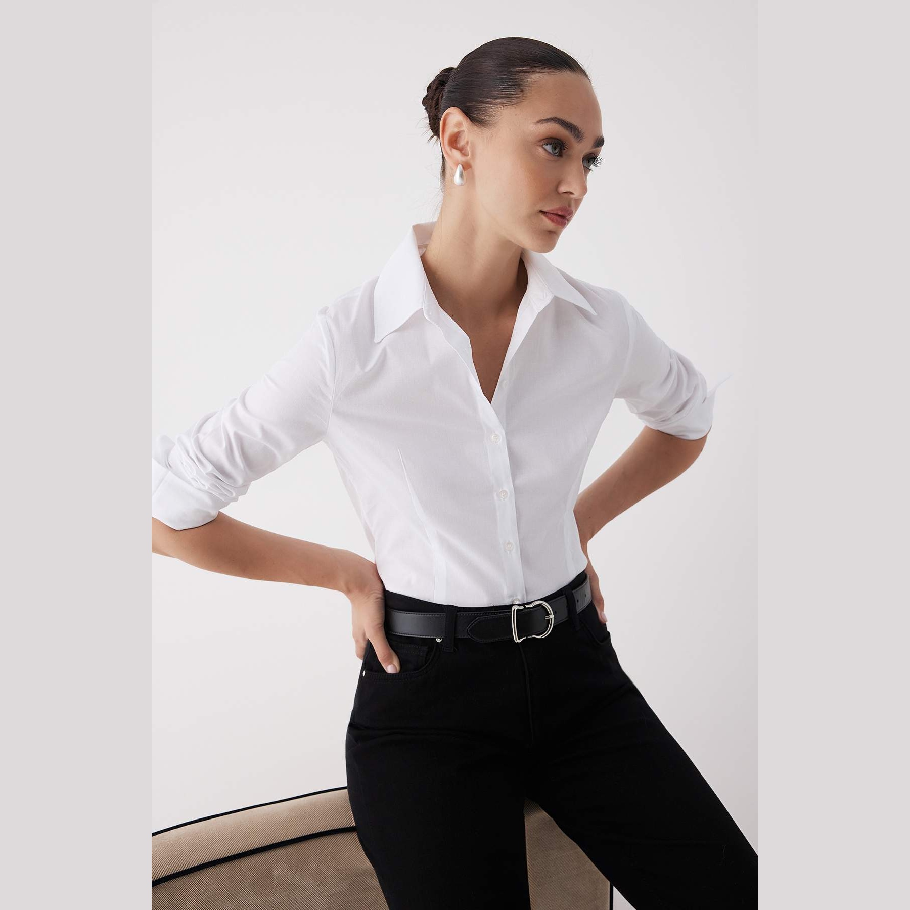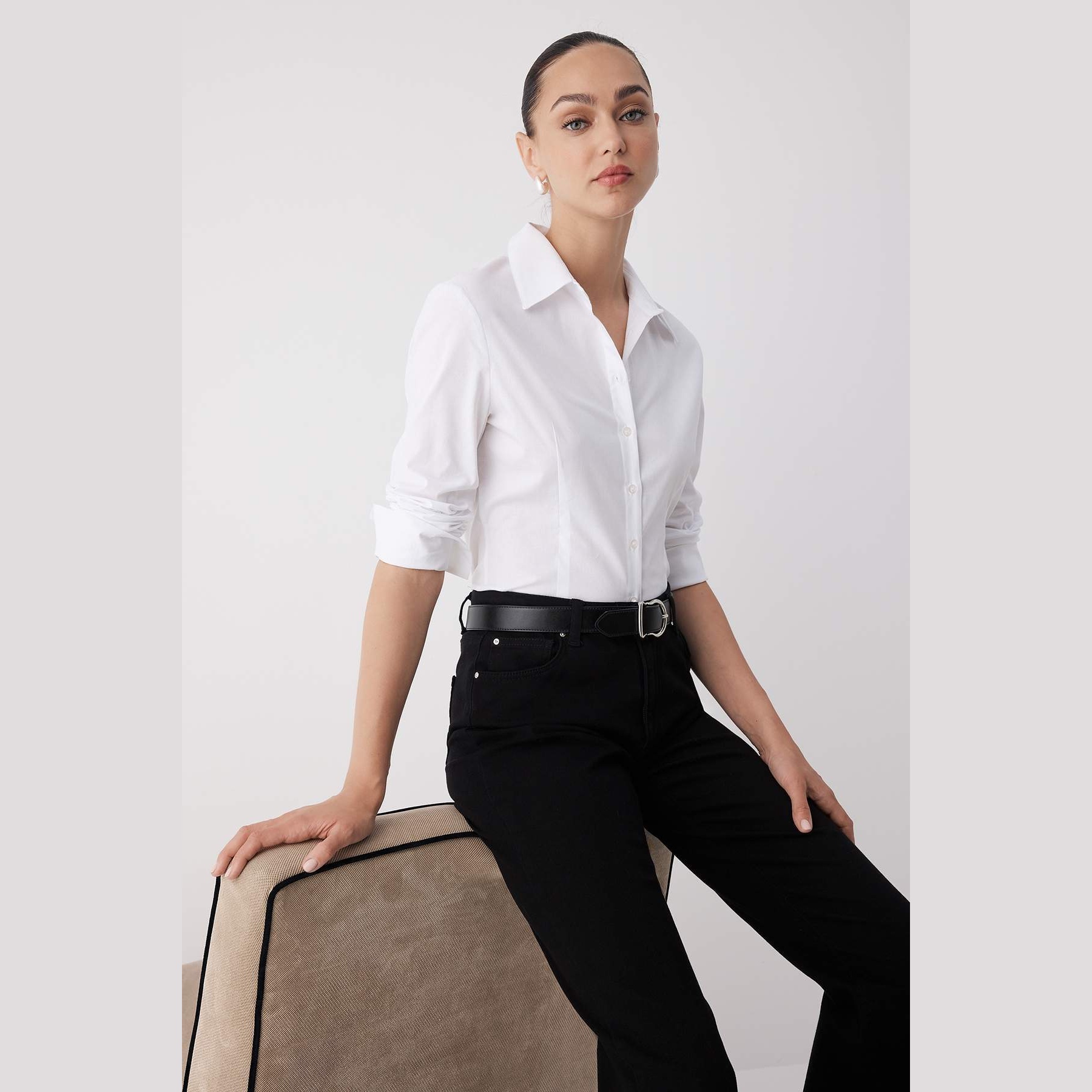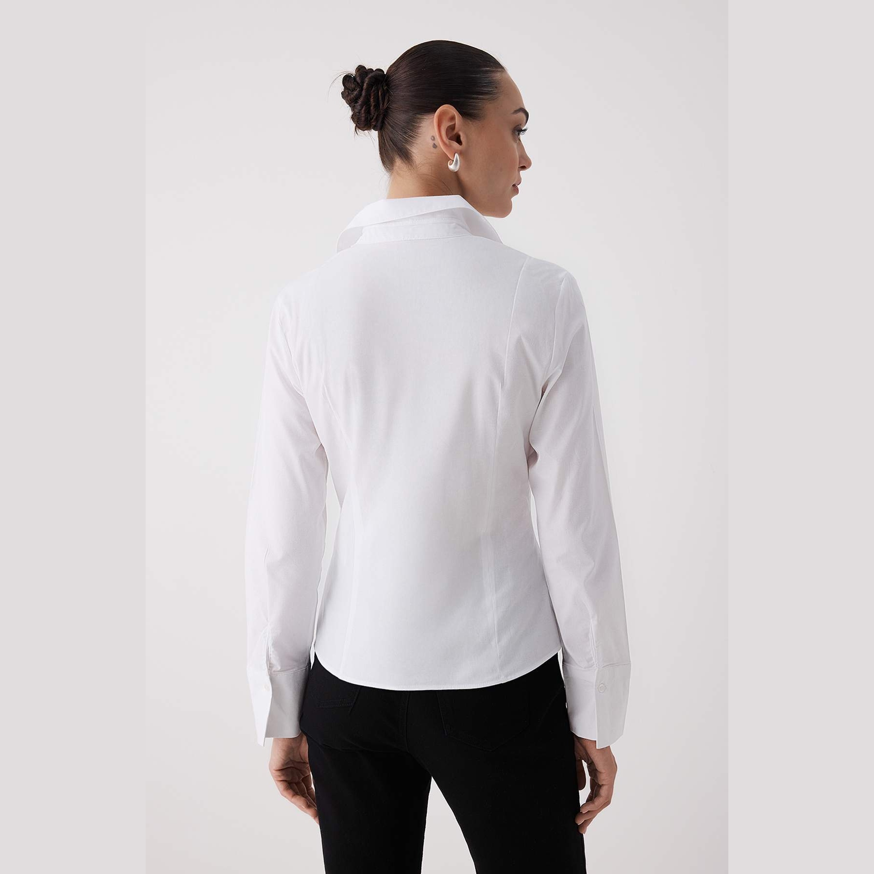 قميص نسائي بلون أبيض، مصنوع من خامة دوكّوما ناعمة بتركيبة قطنية مع نسبة خفيفة من الإيلاستان، يمنح راحة مثالية وملمسًا طبيعيًا على البشرة. يتميز بياقة قميص كلاسيكية، وأكمام طويلة، وقصة ضيقة خفيفة تبرز الخصر بانسيابية أنيقة، مما يجعله قطعة أساسية مثالية للإطلالات العملية والرسمية.