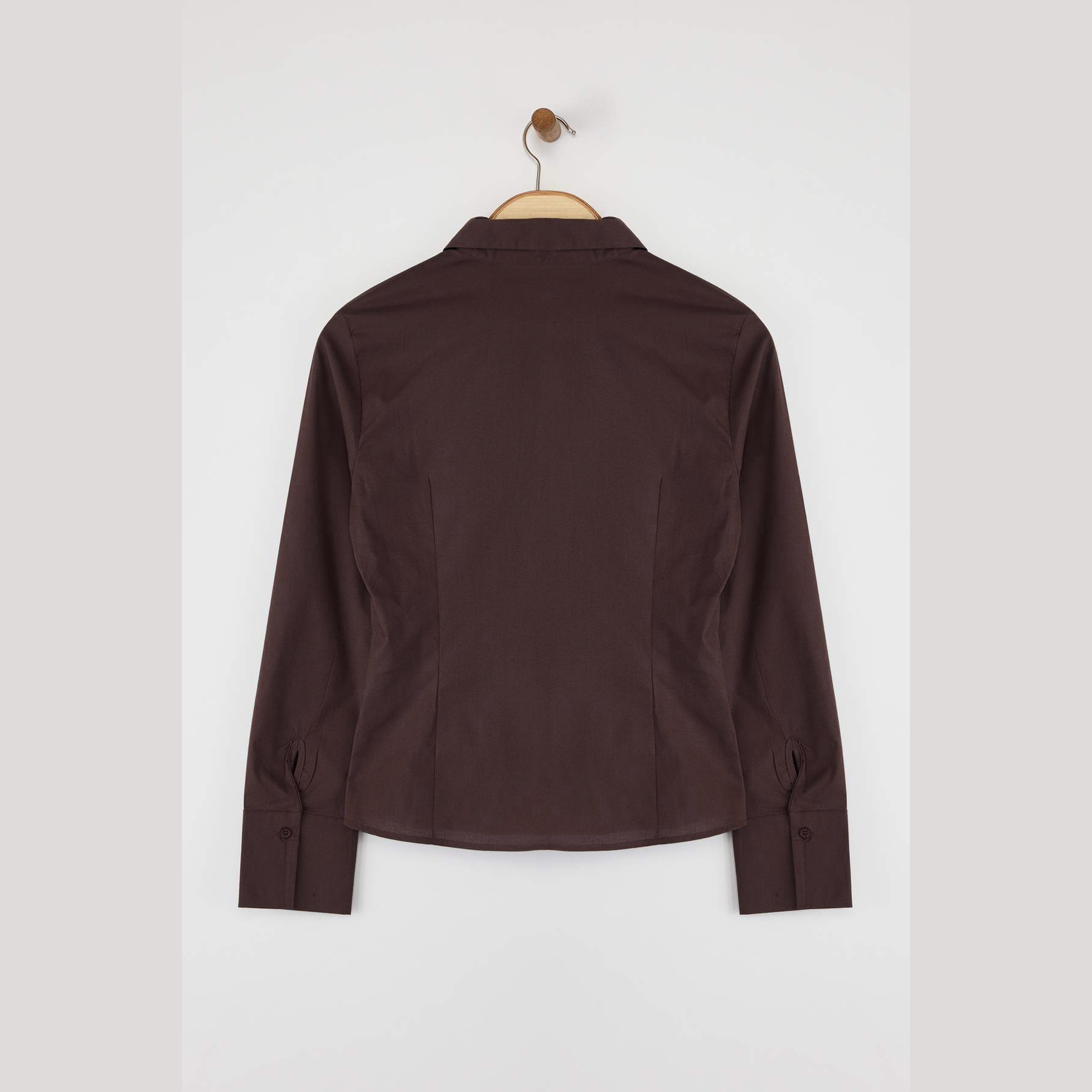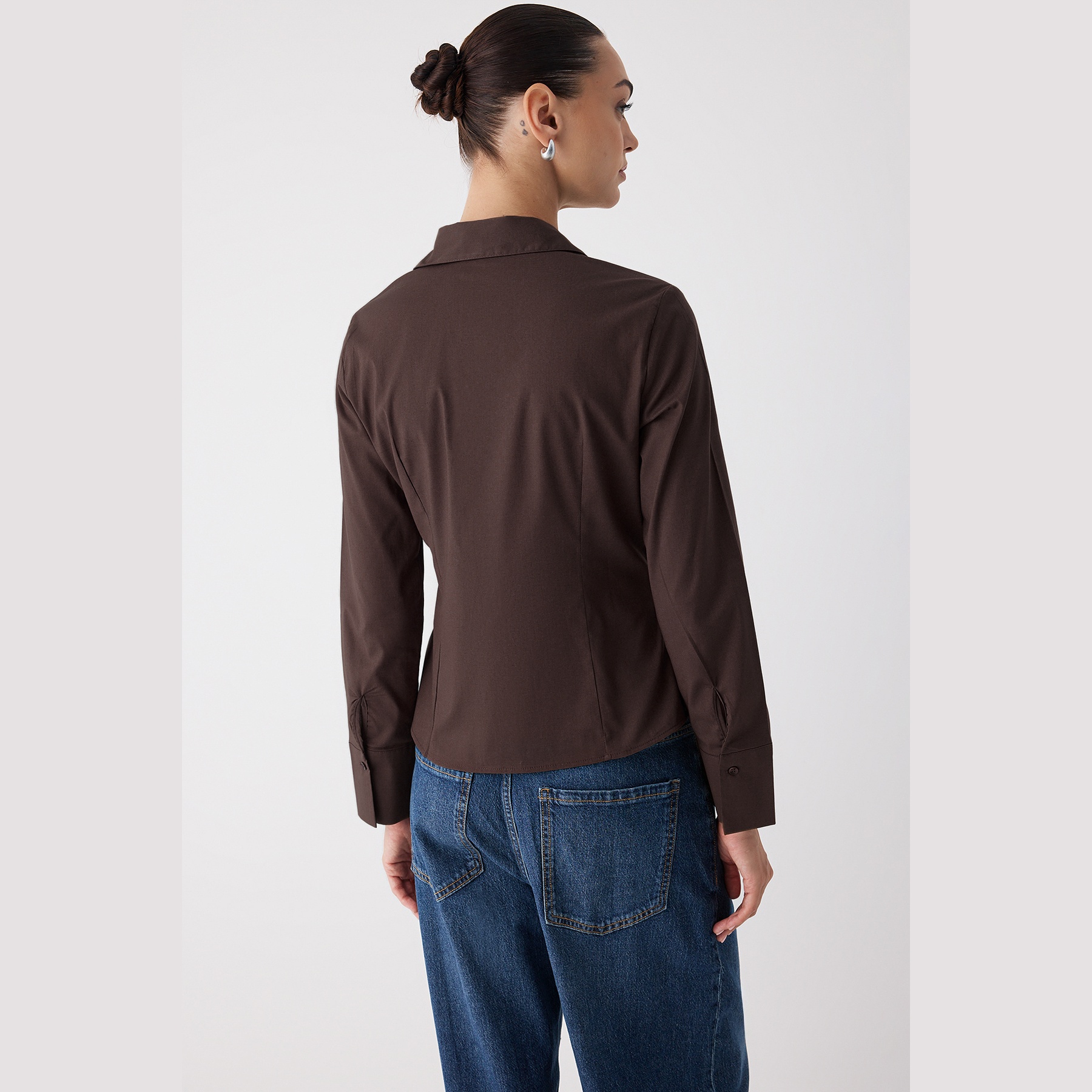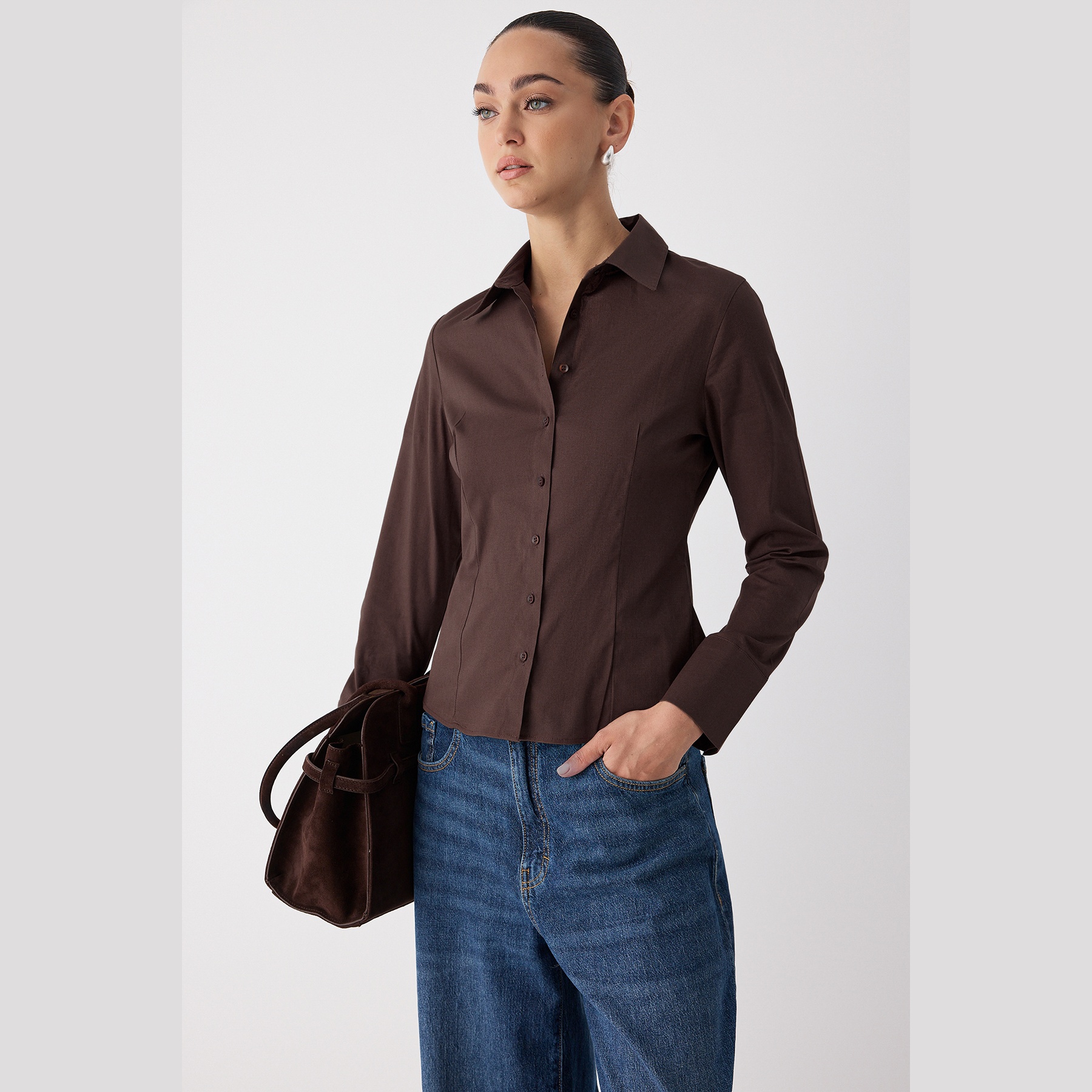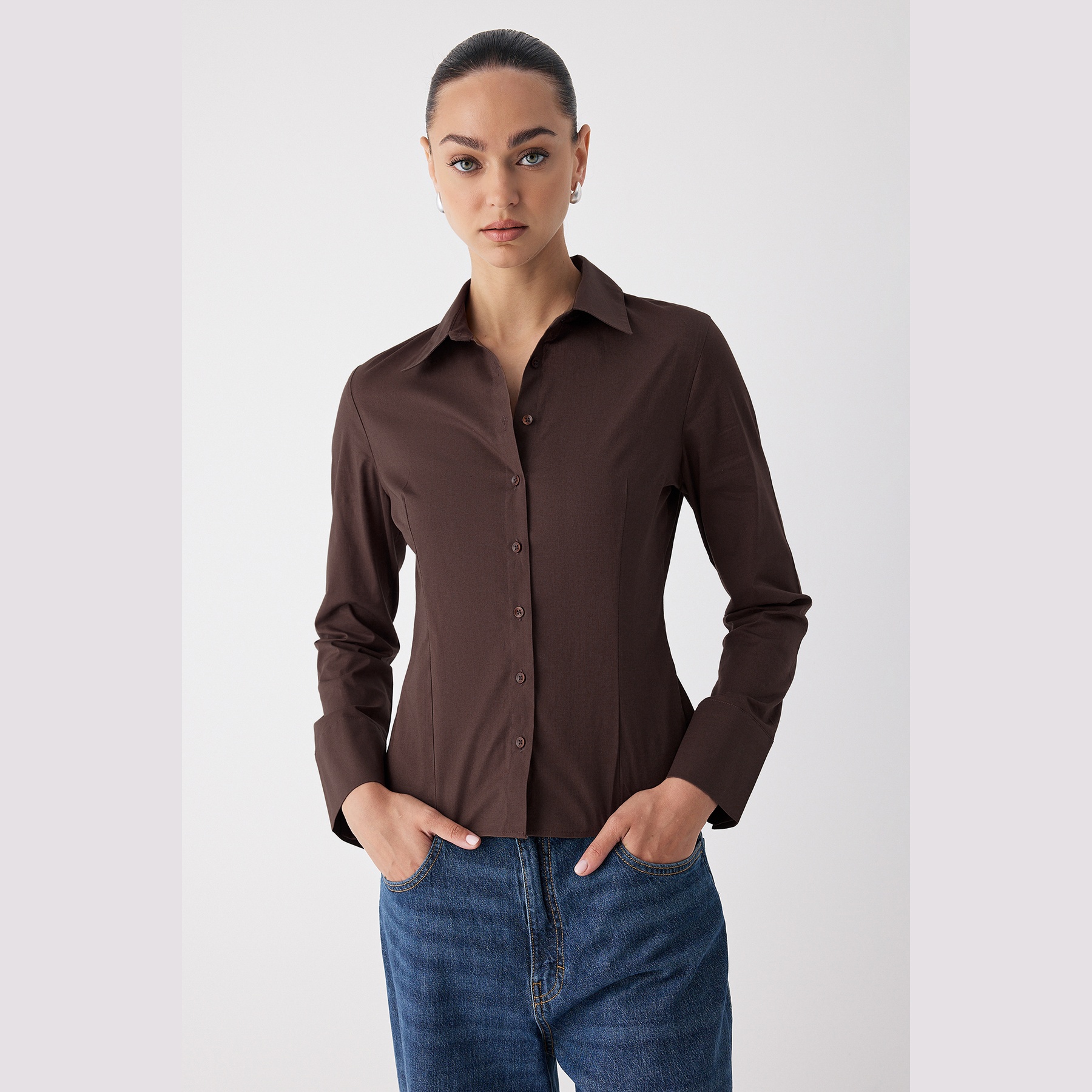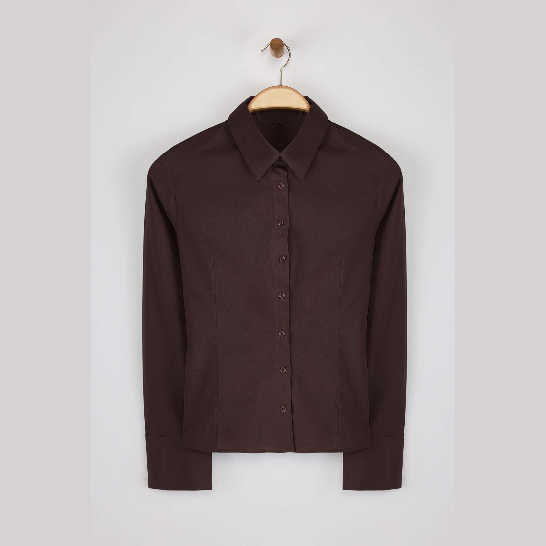 قميص نسائي بلون كُحلي داكن، مصنوع من خامة دوكّوما ناعمة بتركيبة قطنية مع نسبة خفيفة من الإيلاستان، يمنح راحة مثالية وملمسًا طبيعيًا على البشرة. يتميز بياقة قميص كلاسيكية، وأكمام طويلة، وقصة ضيقة خفيفة تبرز الخصر بانسيابية أنيقة، مما يجعله قطعة أساسية مثالية للإطلالات العملية والرسمية.