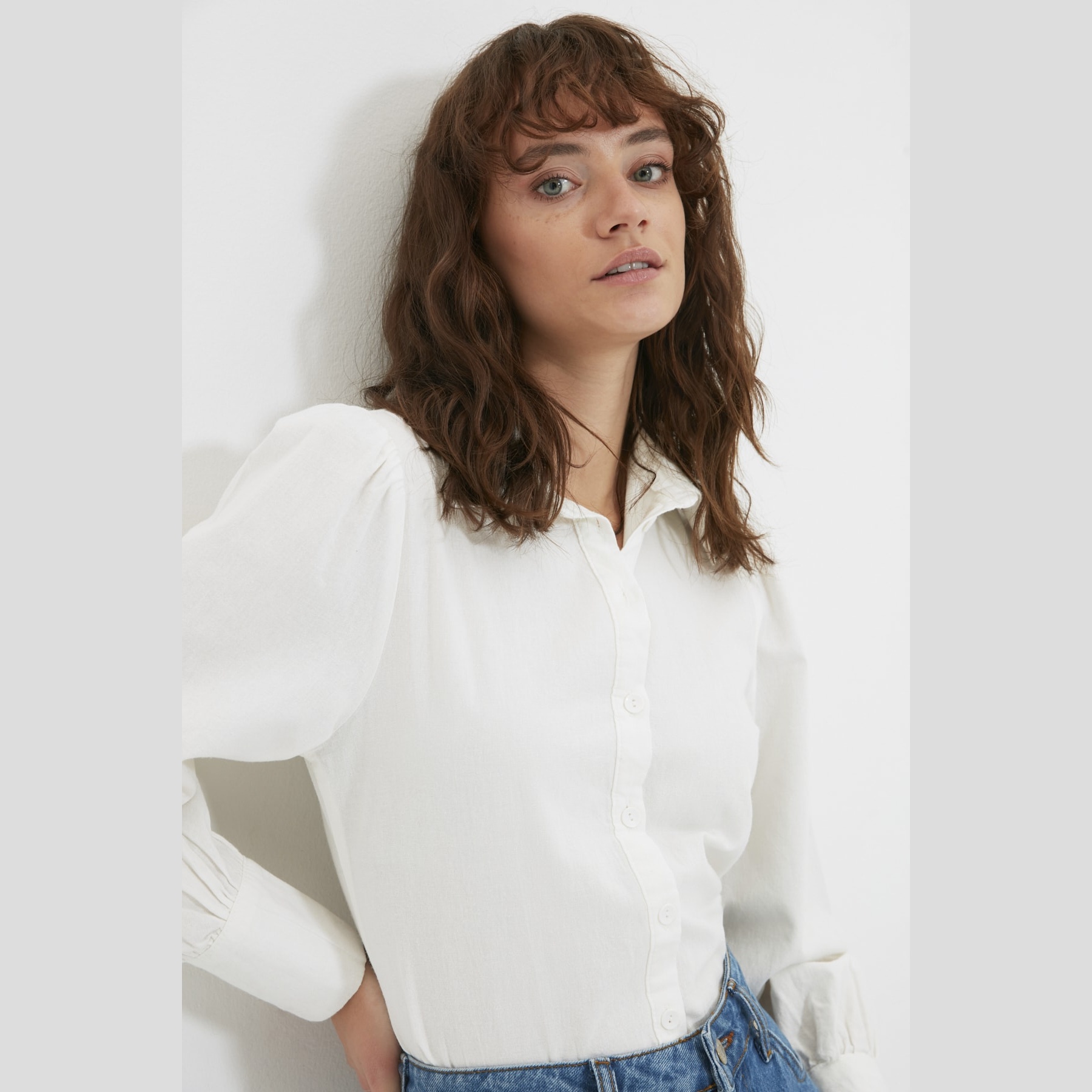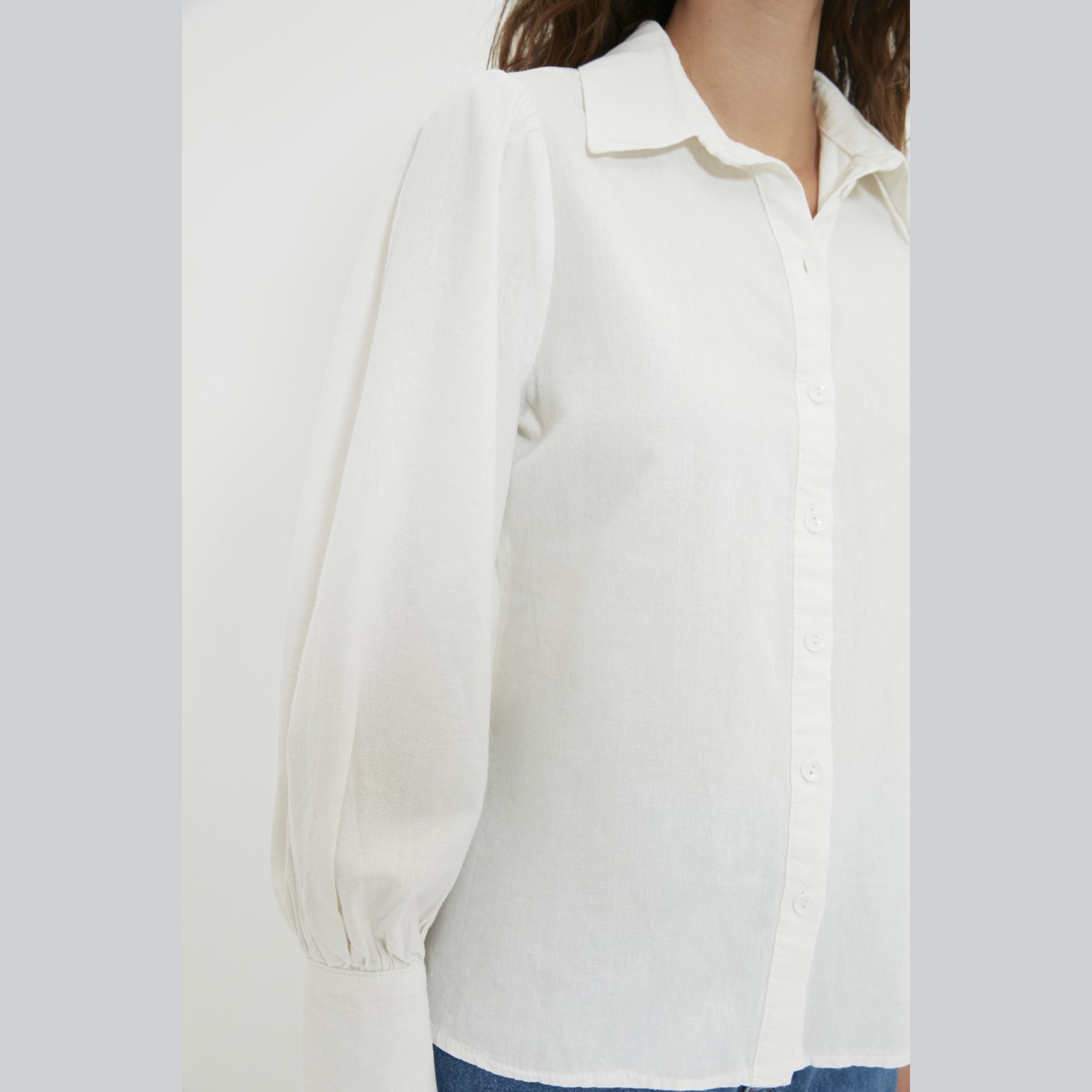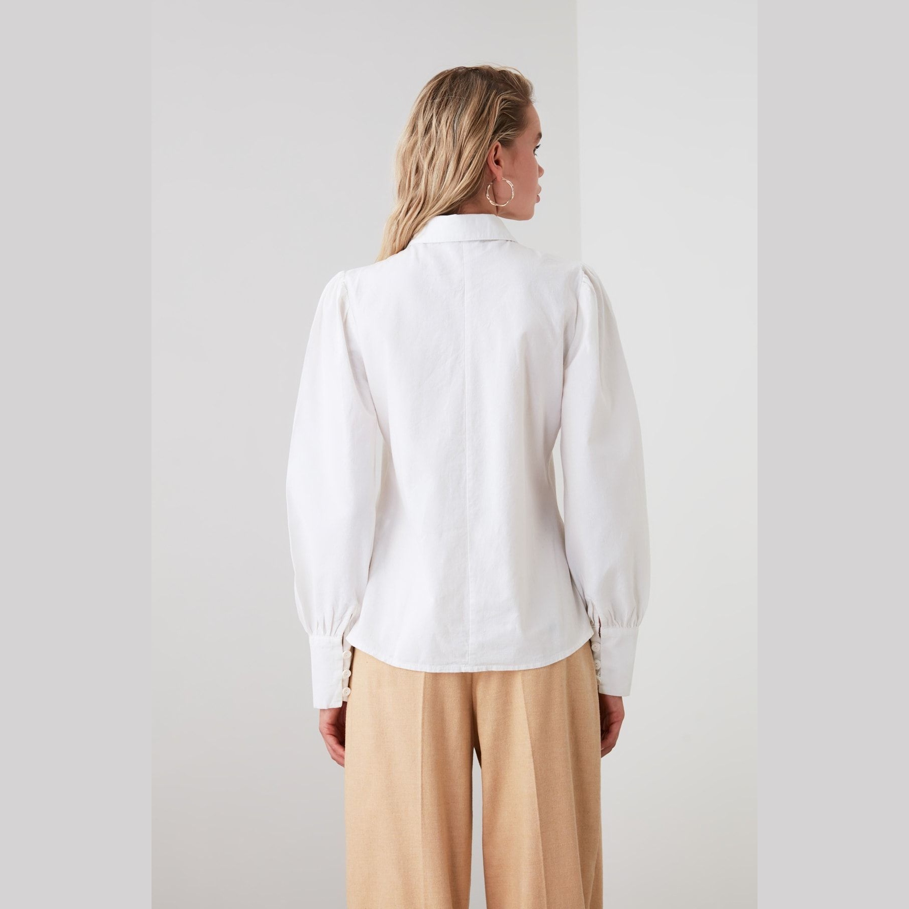 قميص نسائي – أبيض بأكمام بالون وخامة قطنية (إطلالة كلاسيكية مريحة بخامة دوكّوما طبيعية)
