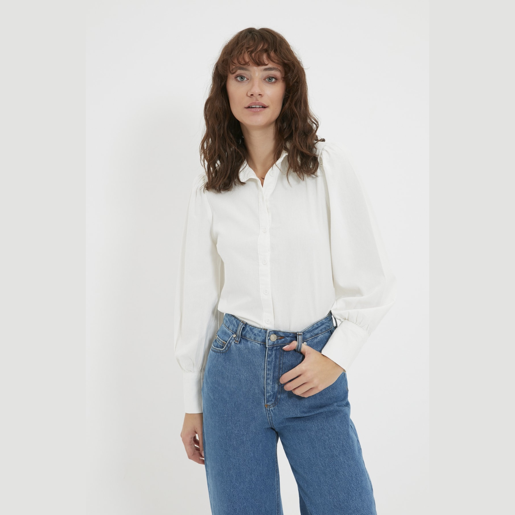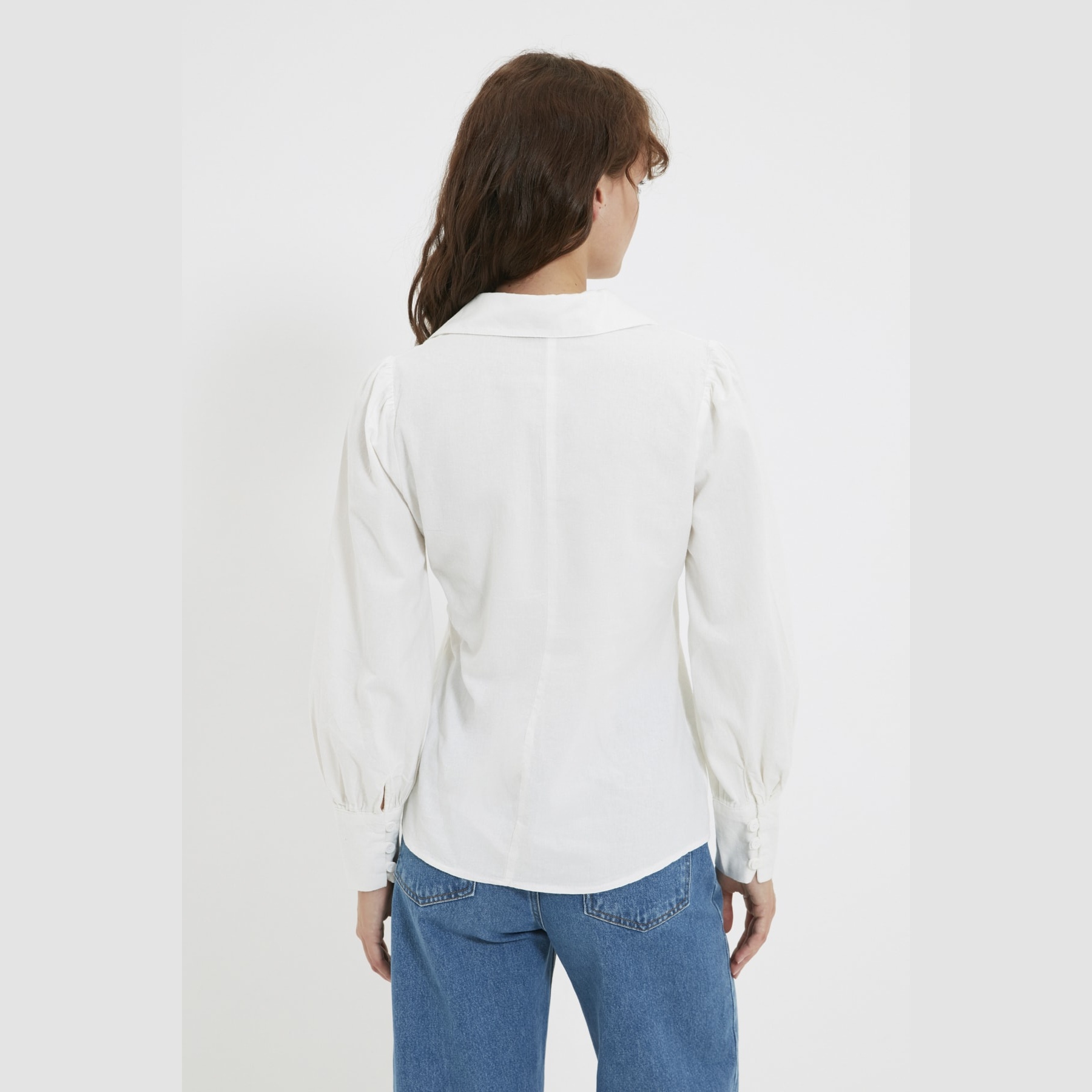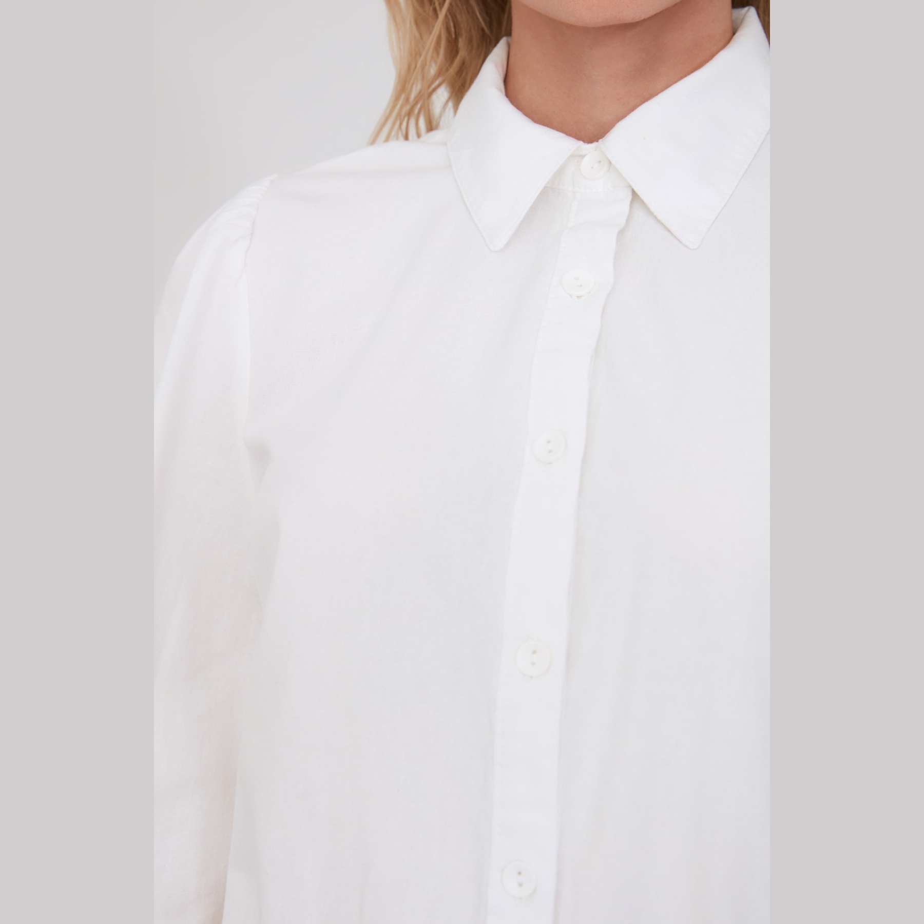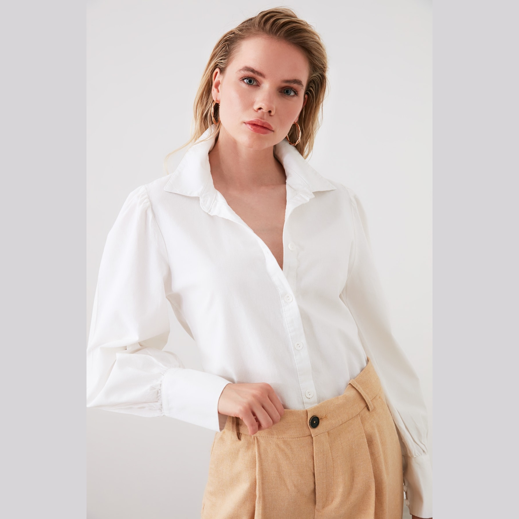 قميص نسائي – أبيض بأكمام بالون وخامة قطنية (إطلالة كلاسيكية مريحة بخامة دوكّوما طبيعية)