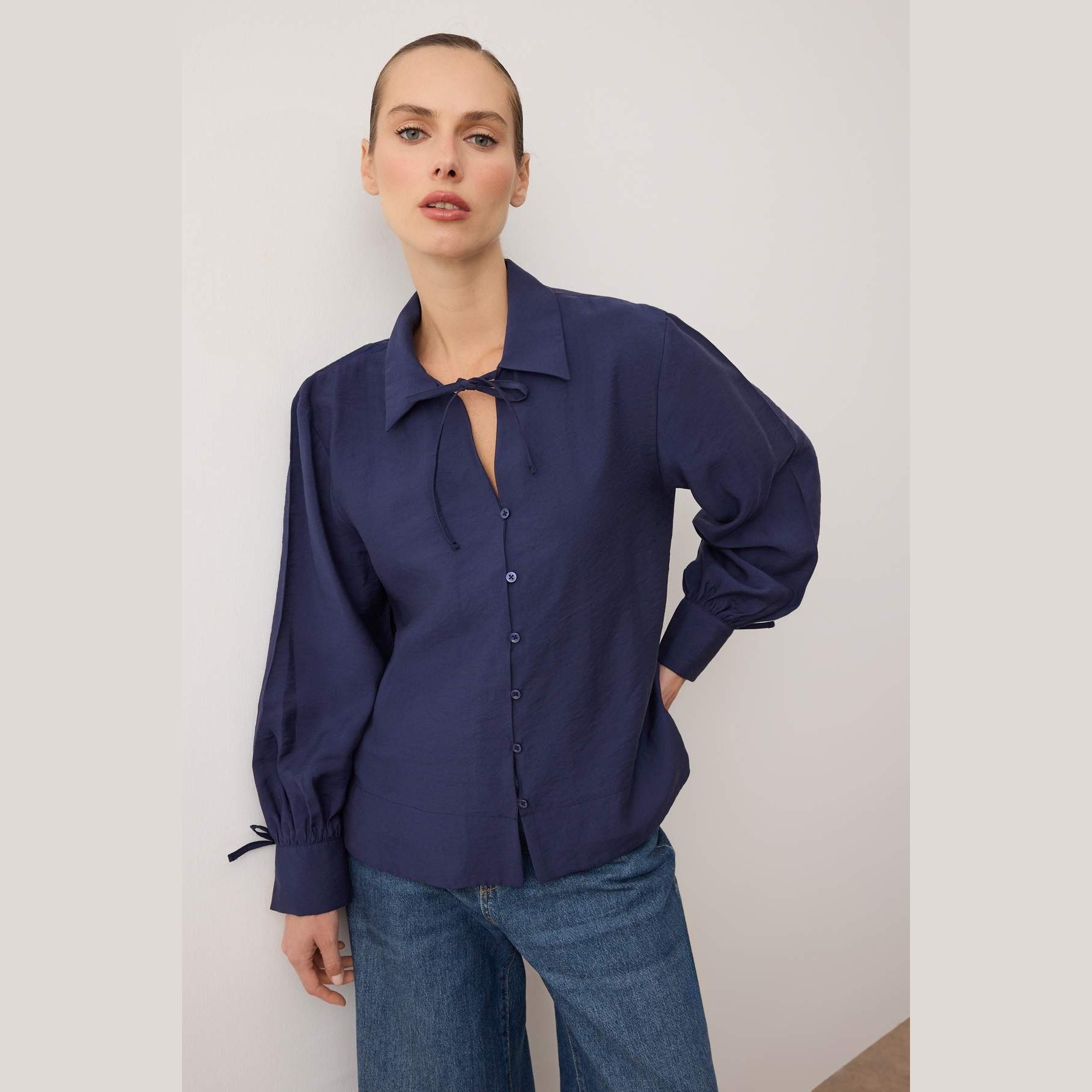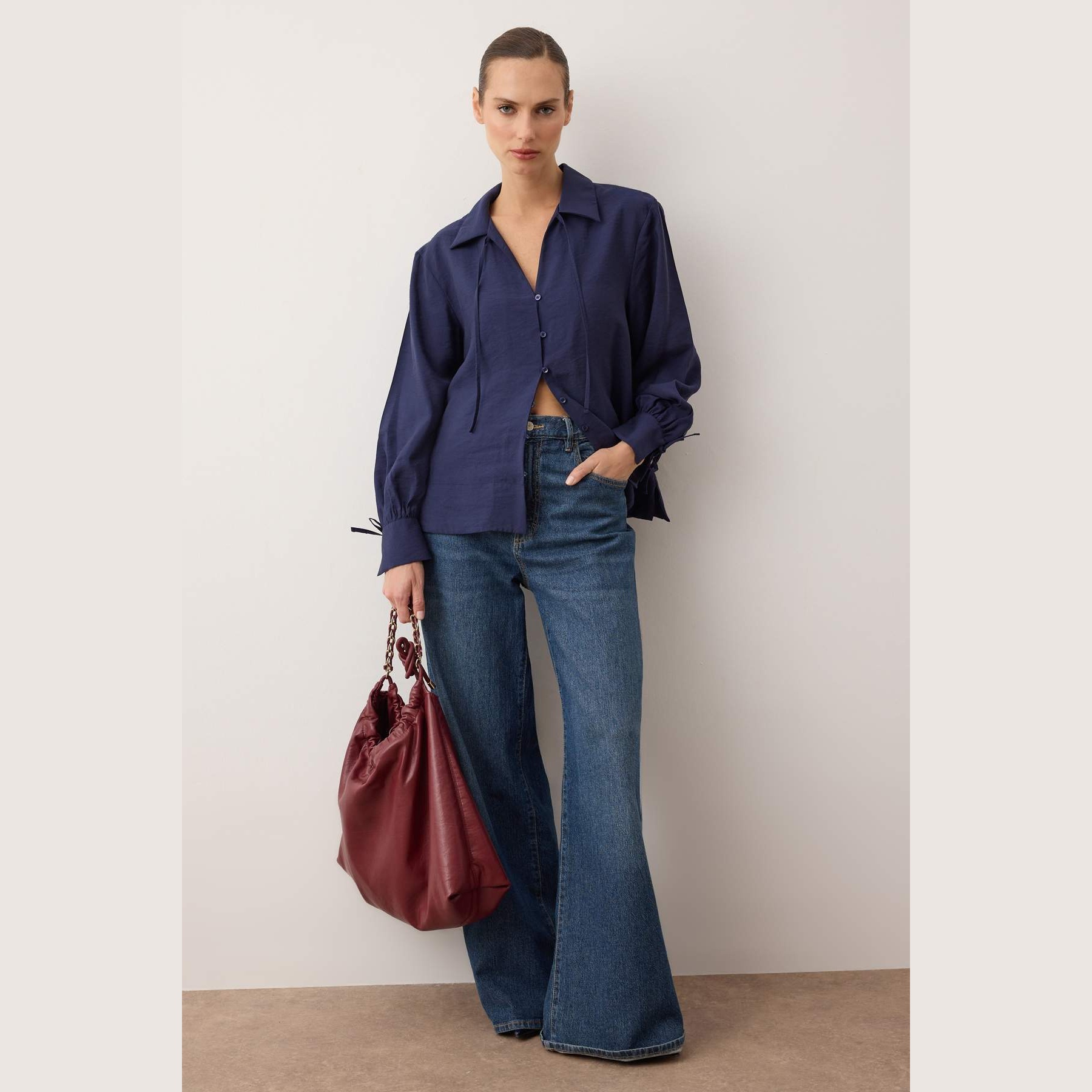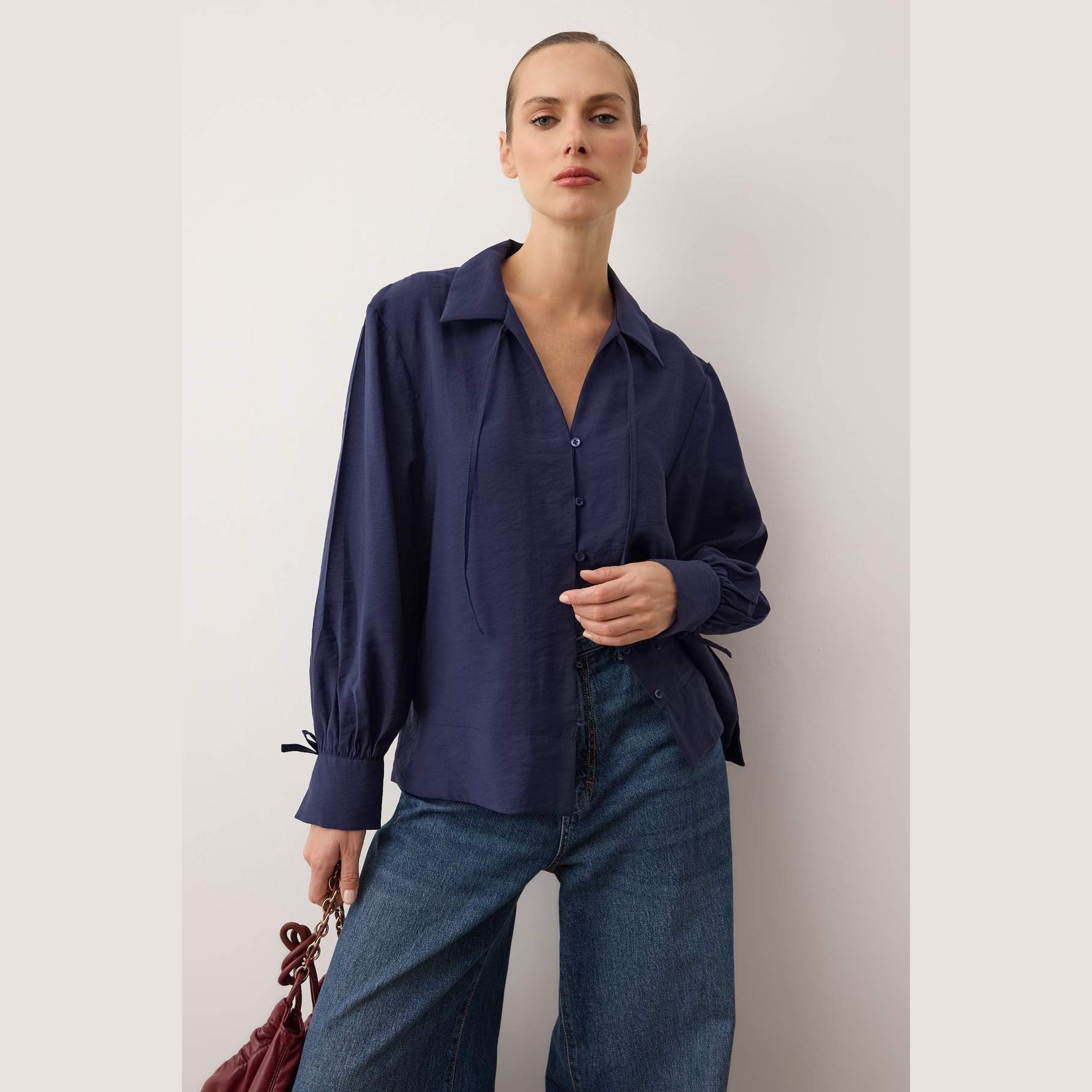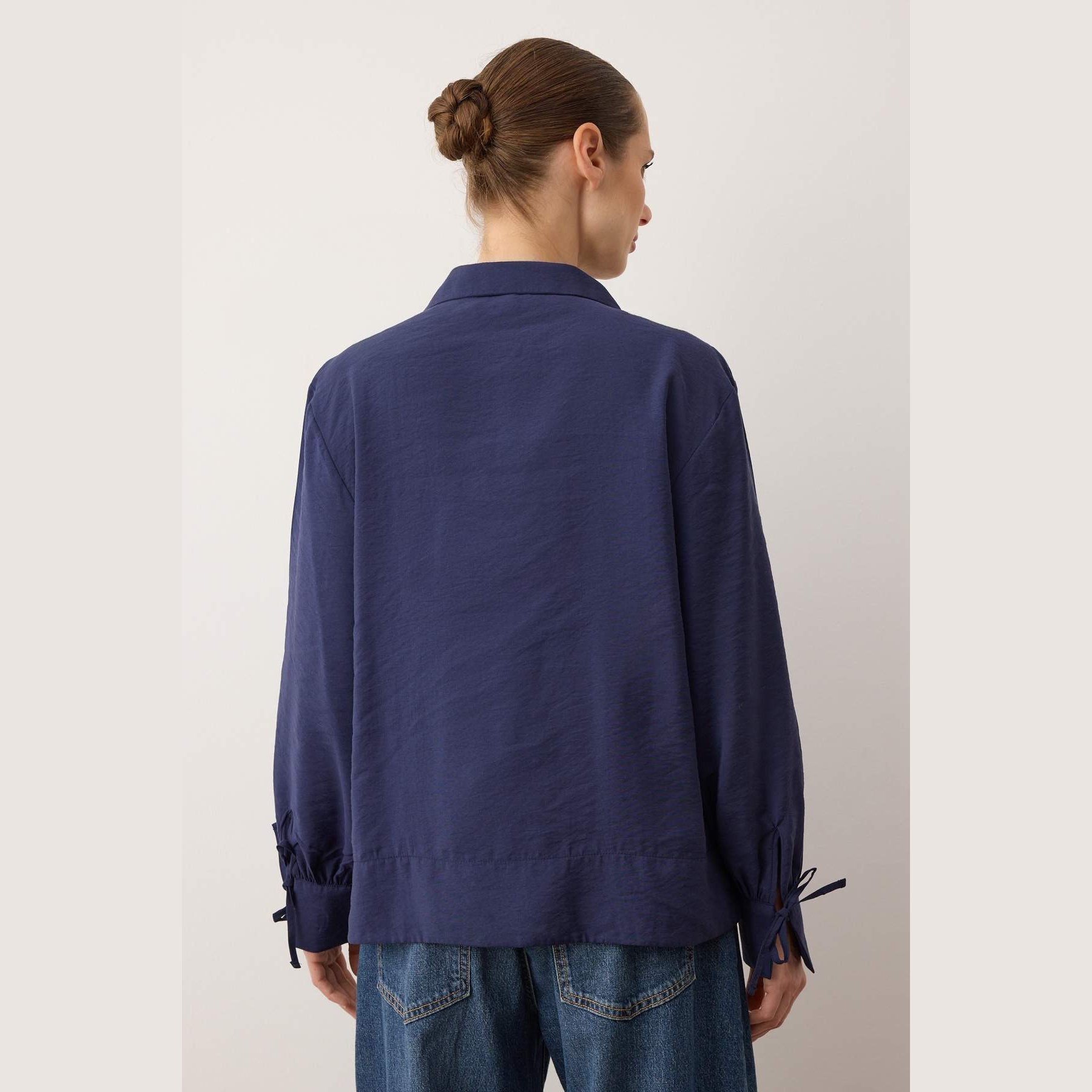 قميص نسائي بلون كُحلي داكن، مصنوع من خامة مودال ناعمة بتركيبة مستدامة، يمنح إحساسًا مريحًا وتهوية مثالية. يتميز بياقة قميص كلاسيكية، وأكمام طويلة، وقصة واسعة (Oversize) تضيف حرية في الحركة، مع تفصيل ربطة أمامية تضفي لمسة بوهو أنثوية مثالية للإطلالات اليومية.