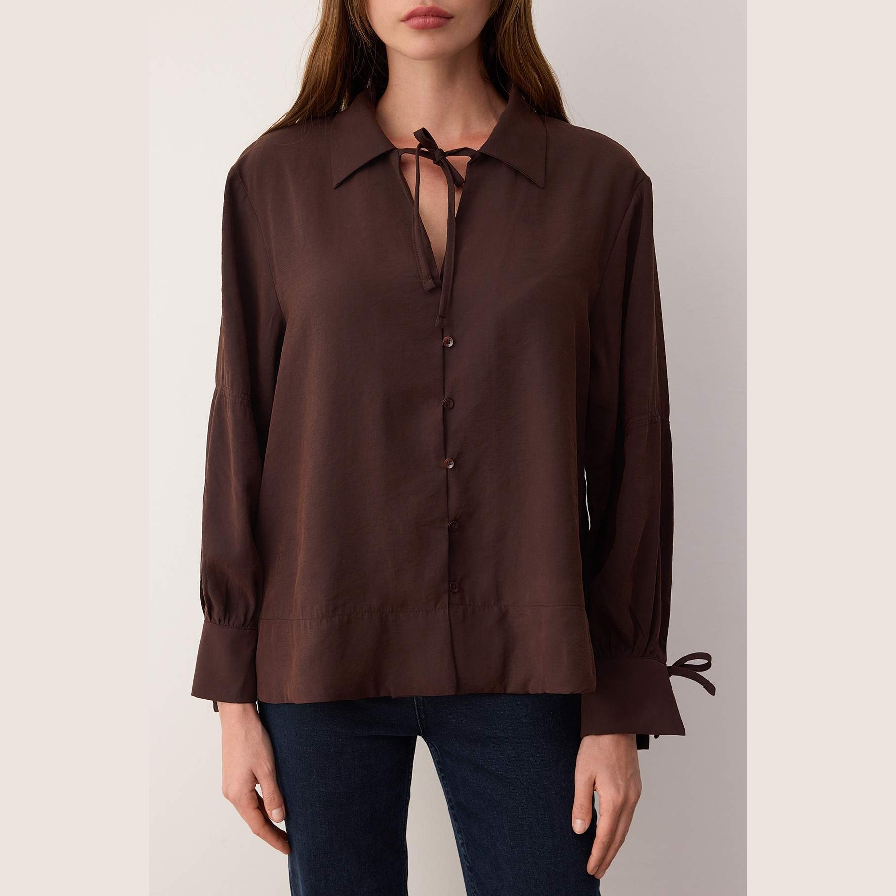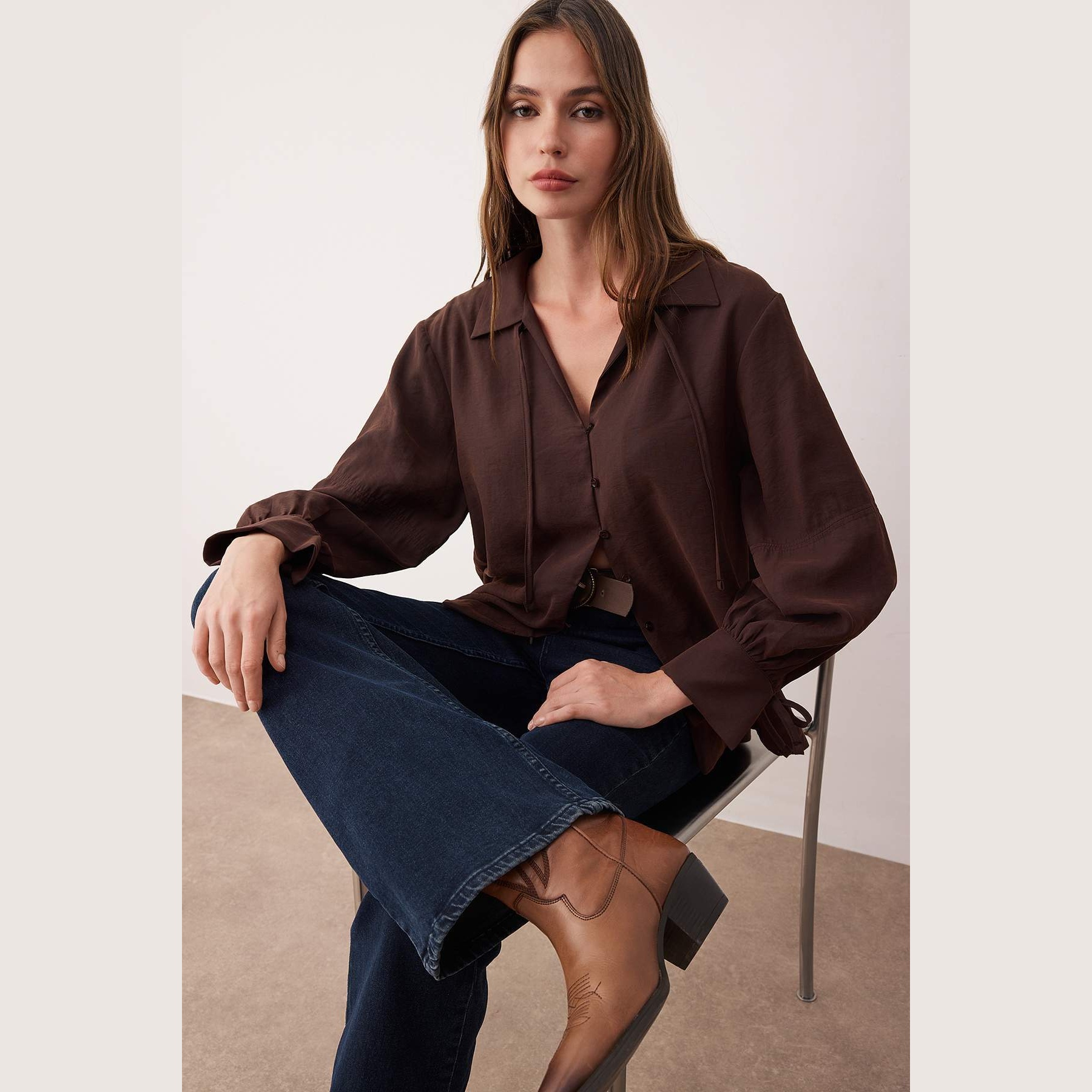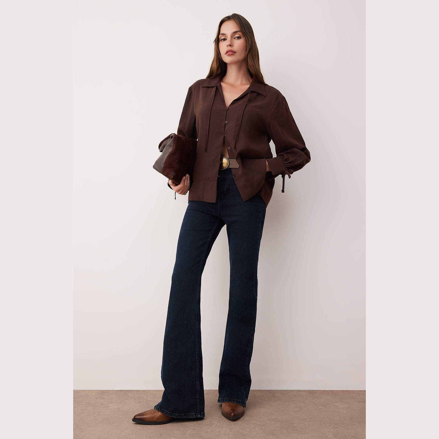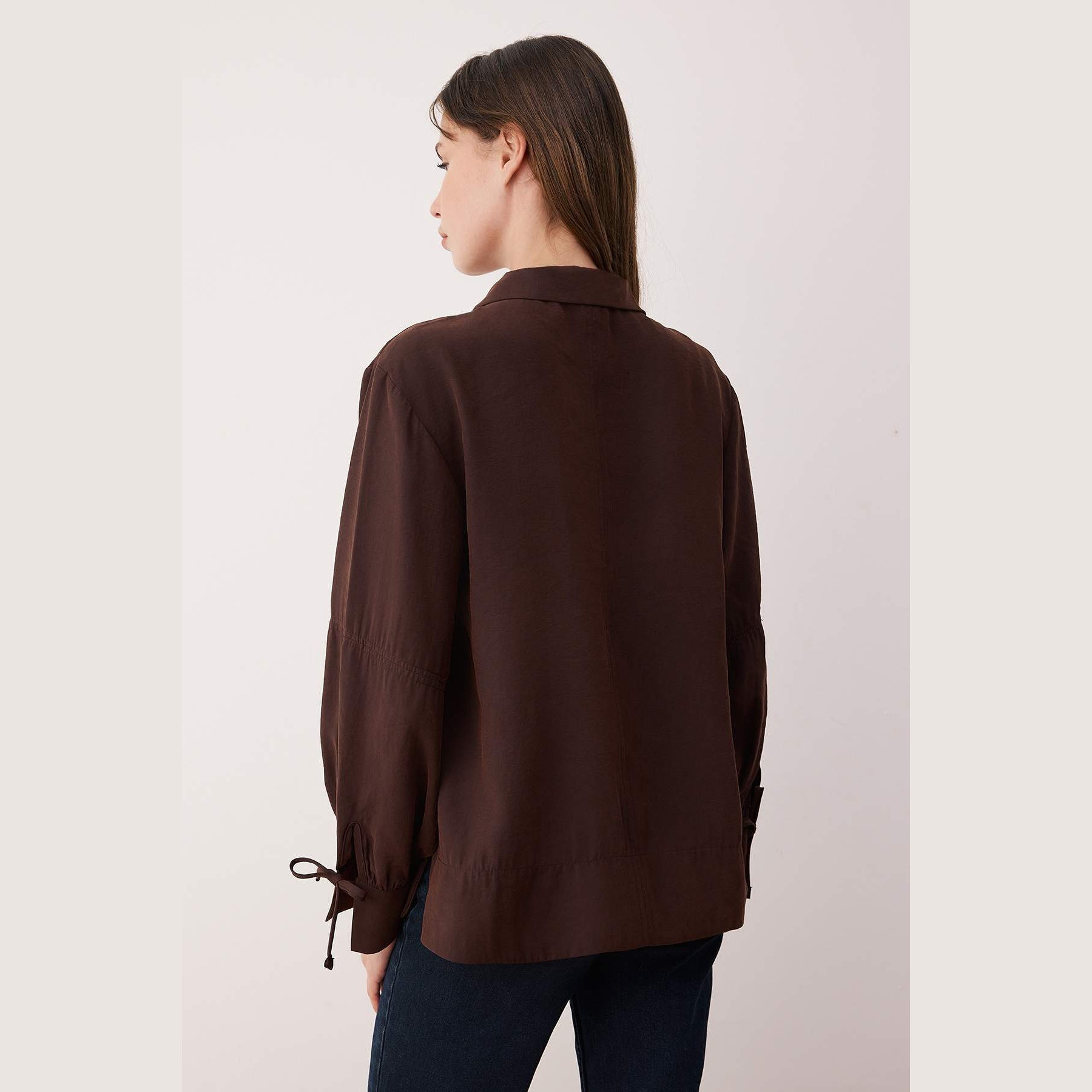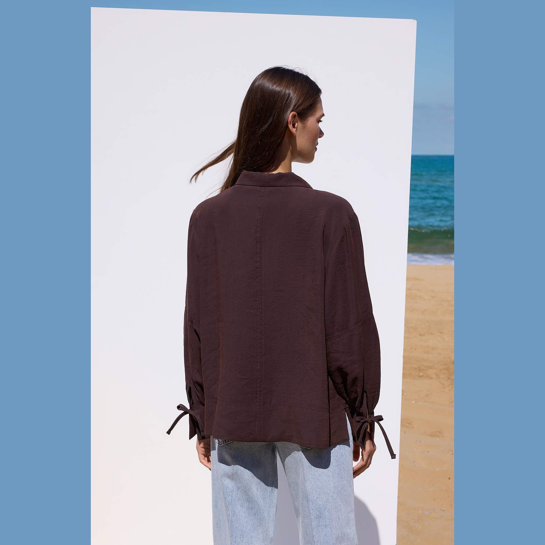 قميص نسائي بلون كُحلي داكن جدًا، مصنوع من خامة مودال ناعمة بتركيبة مستدامة، يمنح إحساسًا مريحًا وتهوية مثالية. يتميز بياقة قميص كلاسيكية، وأكمام طويلة، وقصة واسعة (Oversize) تضيف حرية في الحركة، مع تفصيل ربطة أمامية تضفي لمسة بوهو أنثوية مثالية للإطلالات اليومية.