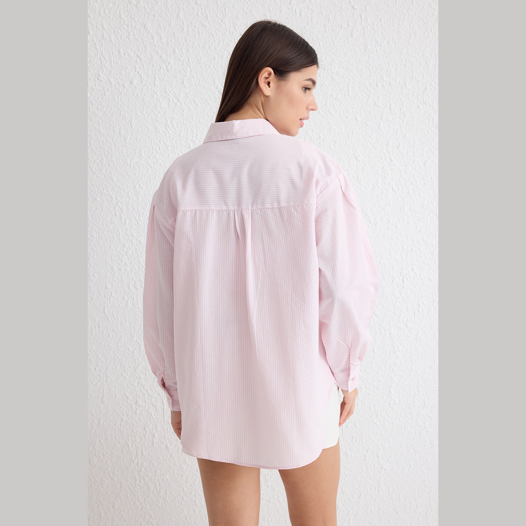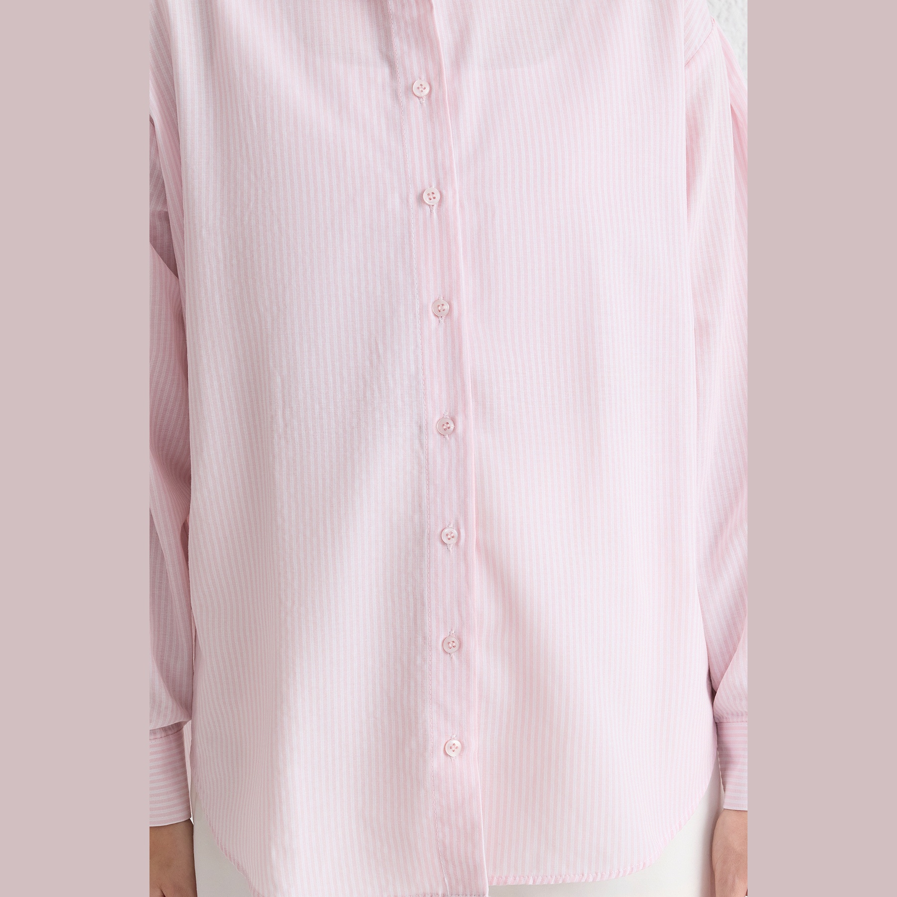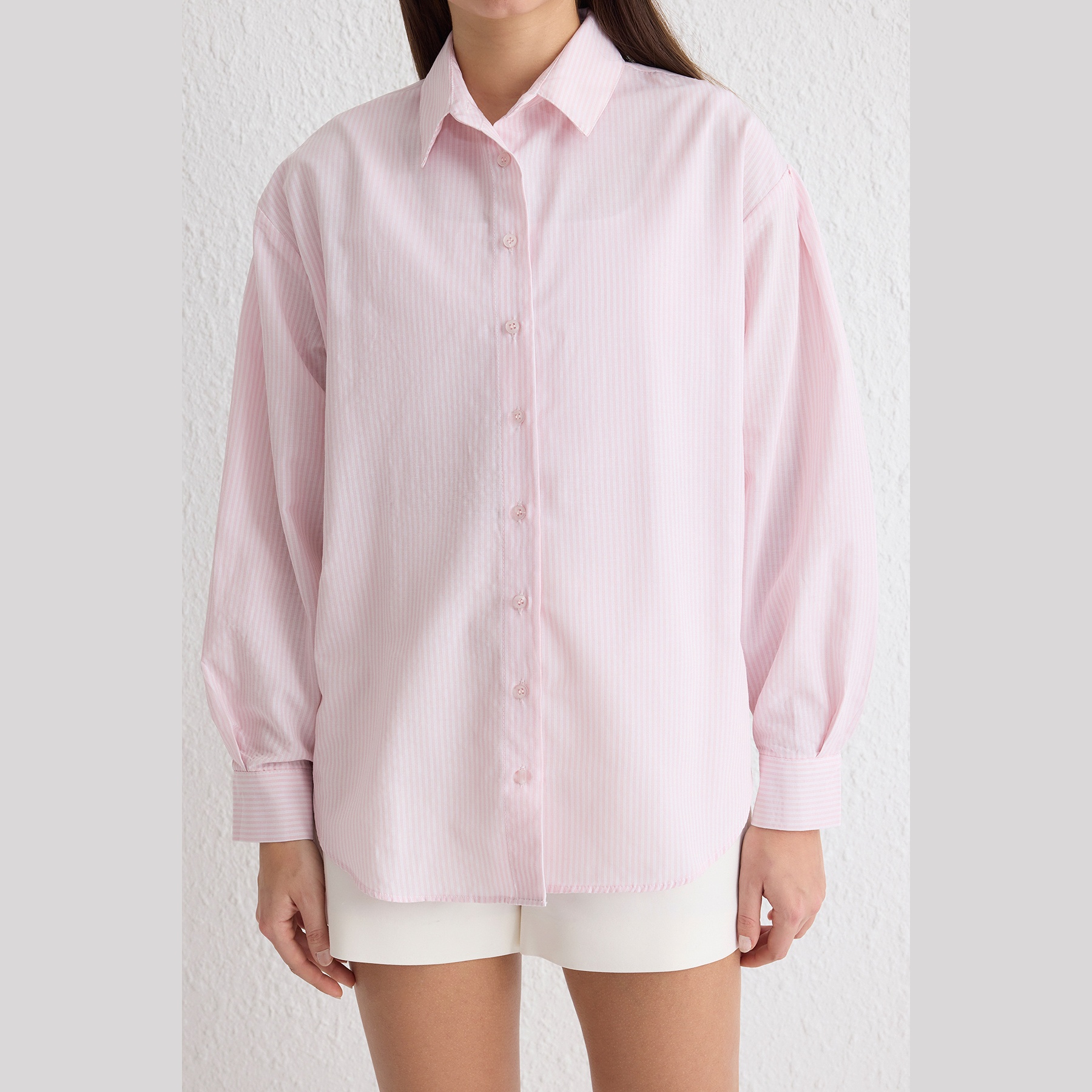 قميص نسائي بلون وردي فاتح مخطط، مصنوع من خامة دوكّوما بتركيبة قطن وبوليستر، يمنح ملمسًا ناعمًا وراحة مثالية. يتميز بياقة قميص كلاسيكية، وأكمام طويلة، وقصة واسعة (Oversize) تضيف حرية في الحركة، مما يجعله خيارًا مثاليًا للإطلالات اليومية الكاجوال.
