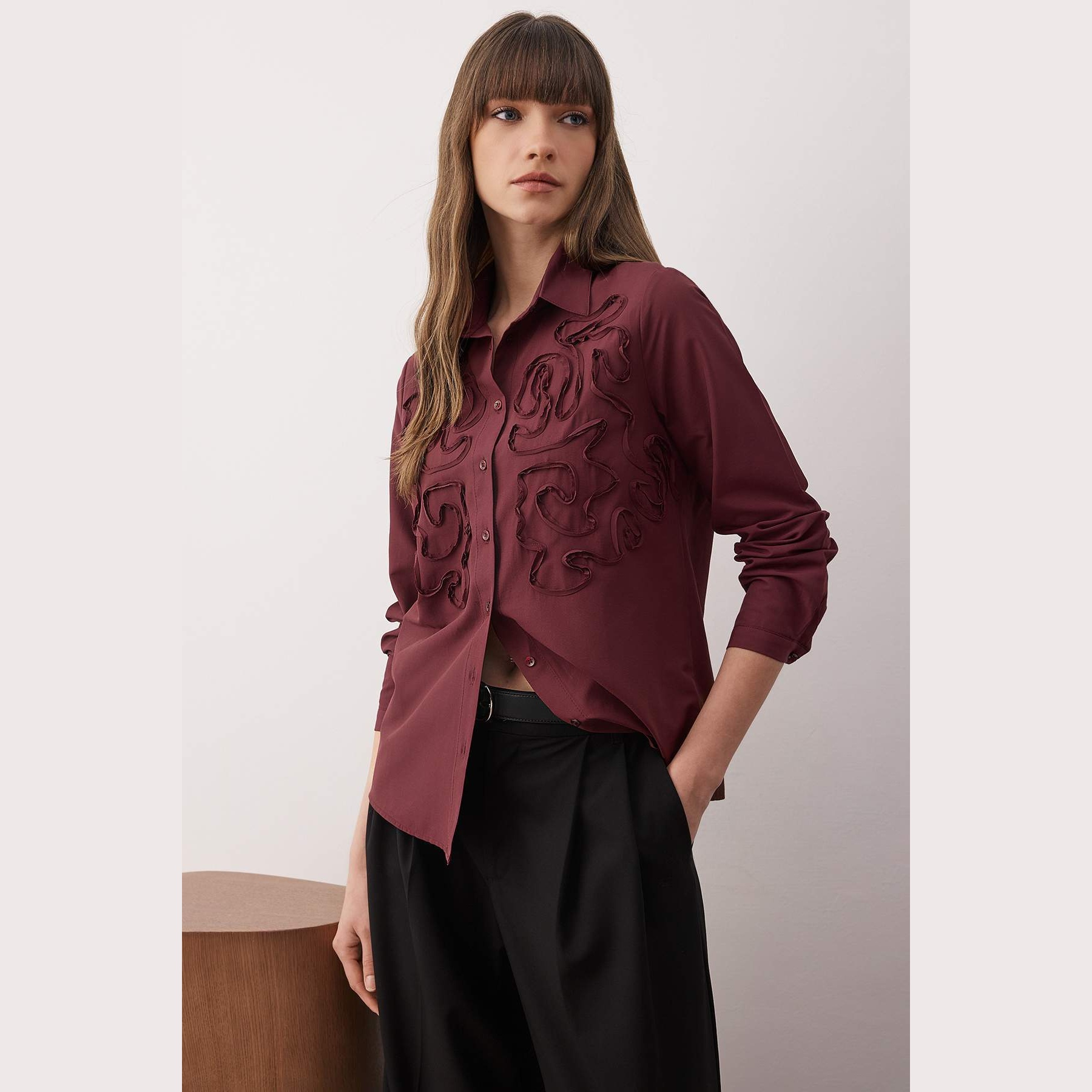 قميص نسائي – بوردو بقصة واسعة وخامة دوكّوما (إطلالة عملية مريحة بتصميم أنيق)