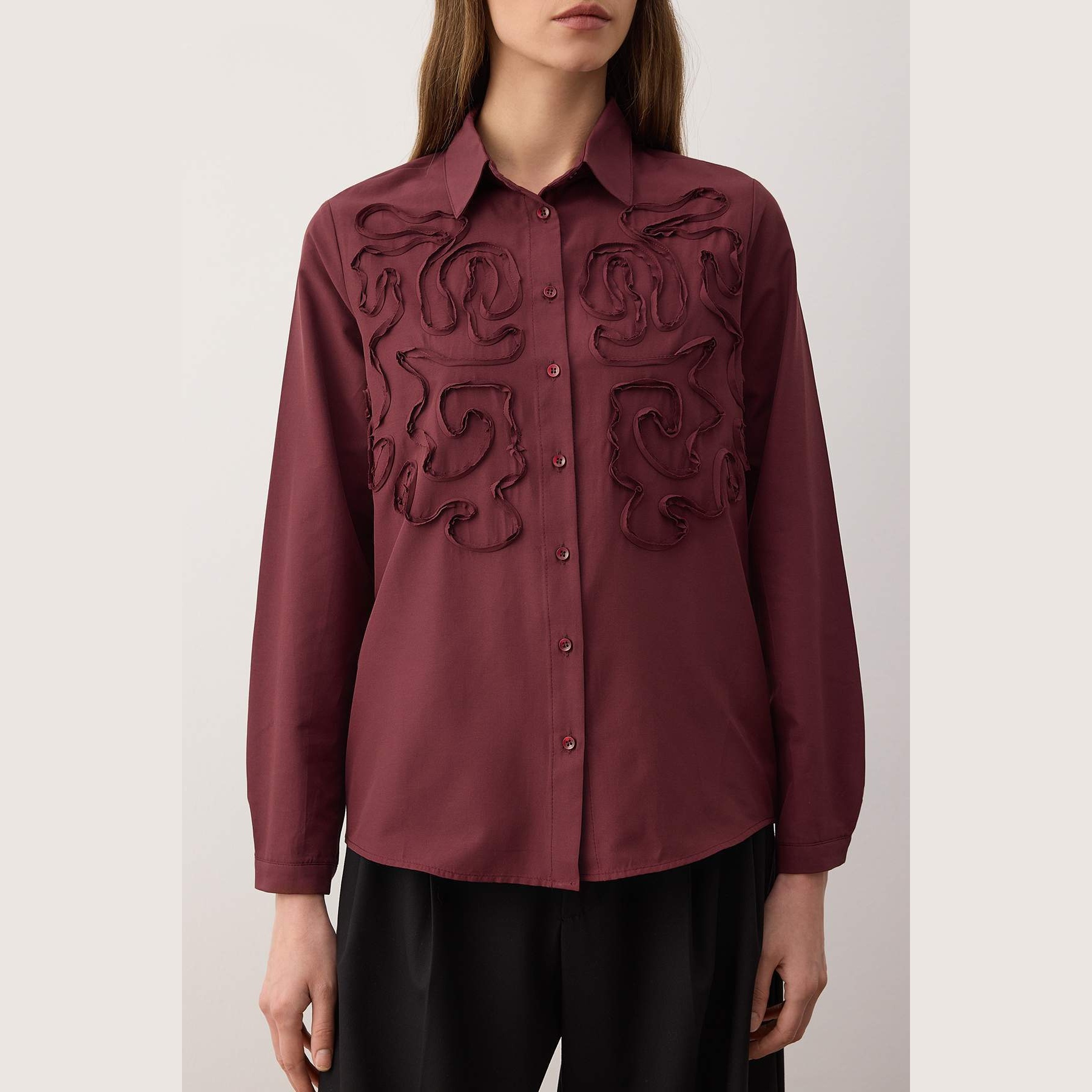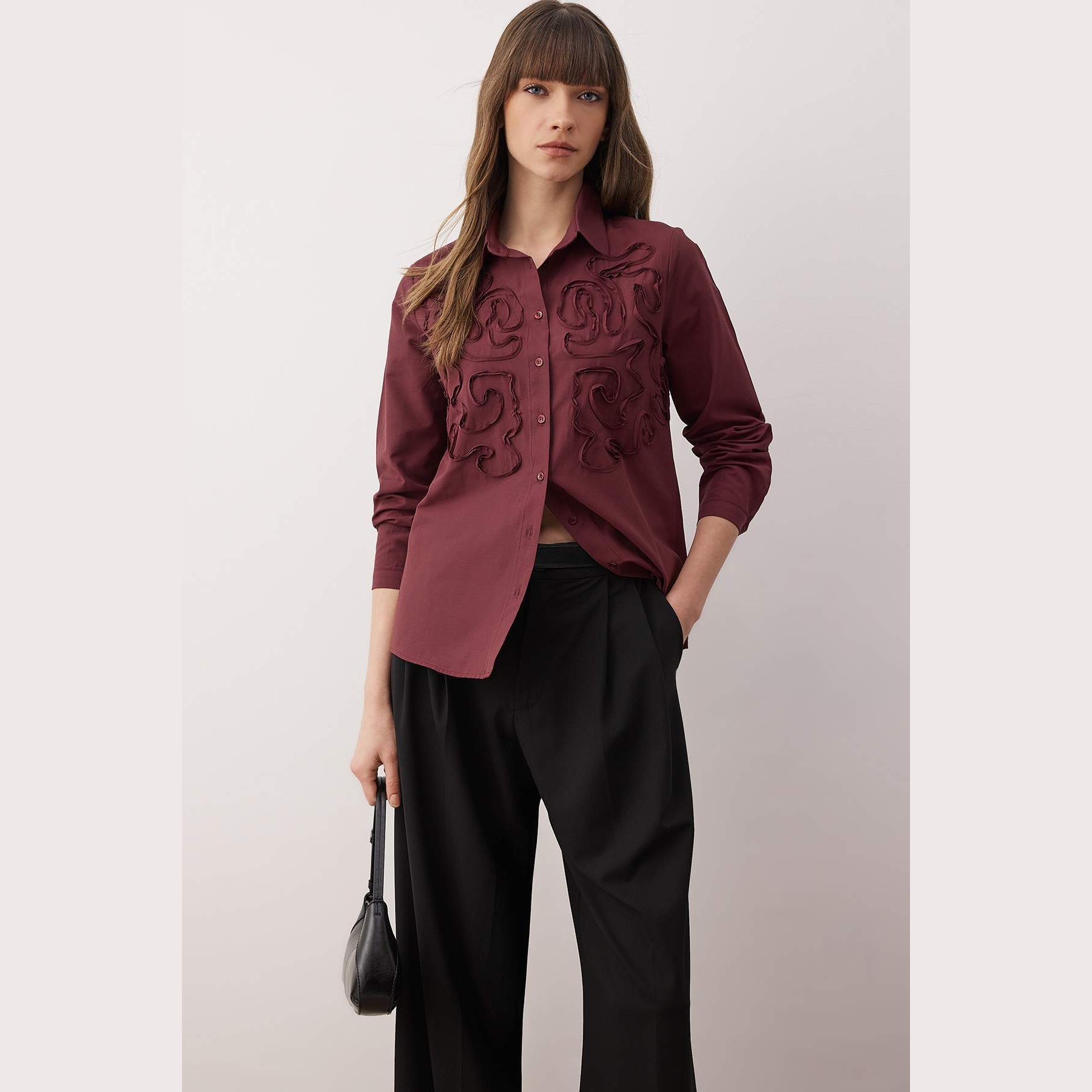 قميص نسائي بلون بوردو، مصنوع من خامة دوكّوما ناعمة بتركيبة قطن وبوليستر، يمنح ملمسًا مريحًا ومظهرًا أنيقًا. يتميز بياقة قميص كلاسيكية، وأكمام طويلة، وقصة واسعة (Oversize) تضيف حرية في الحركة، مما يجعله خيارًا مثاليًا للإطلالات اليومية أو العملية.