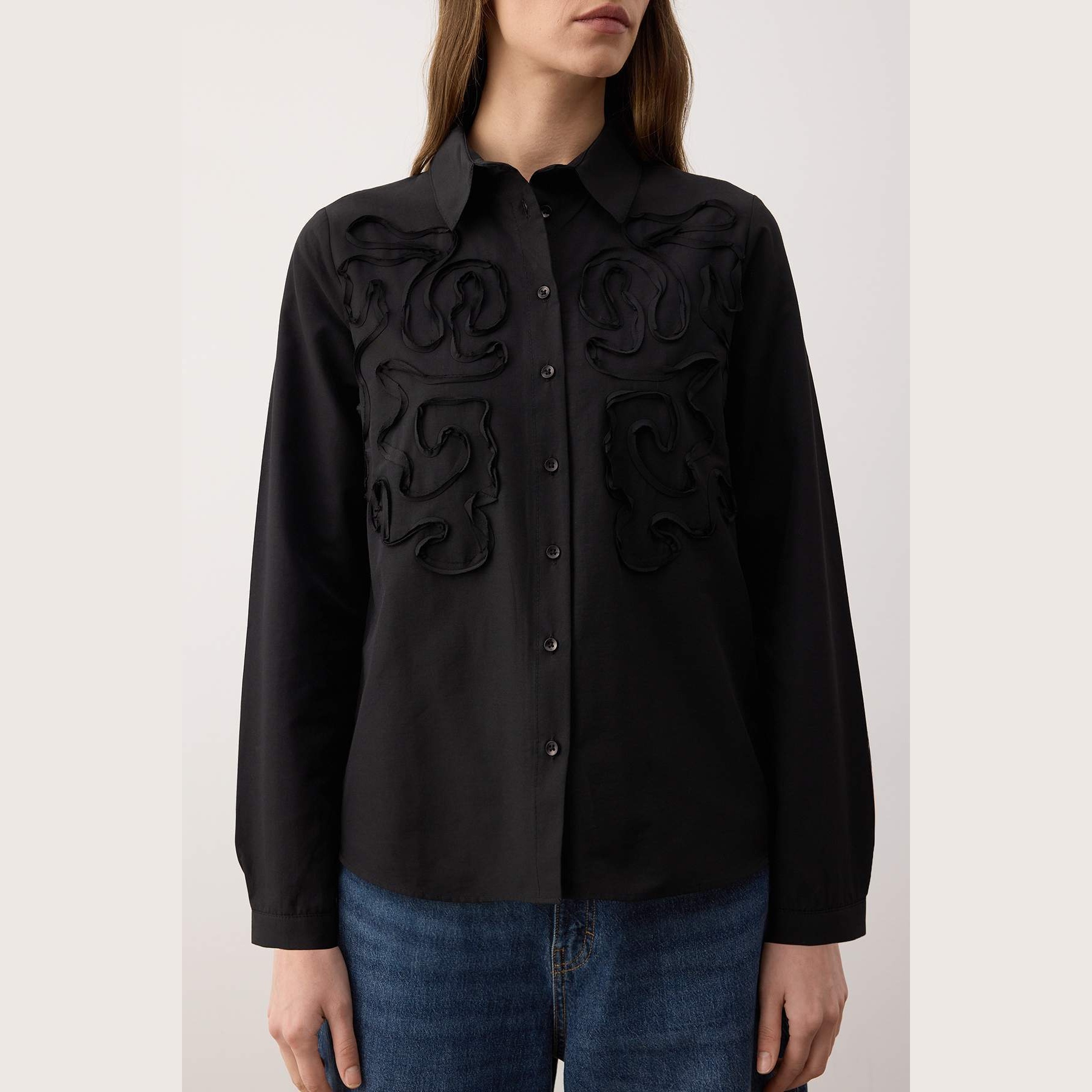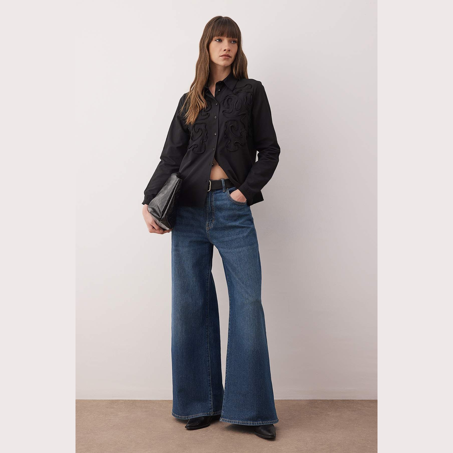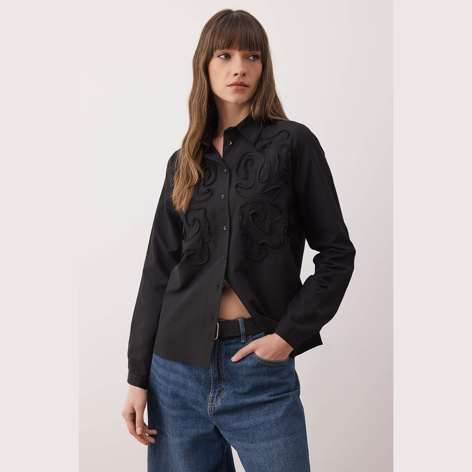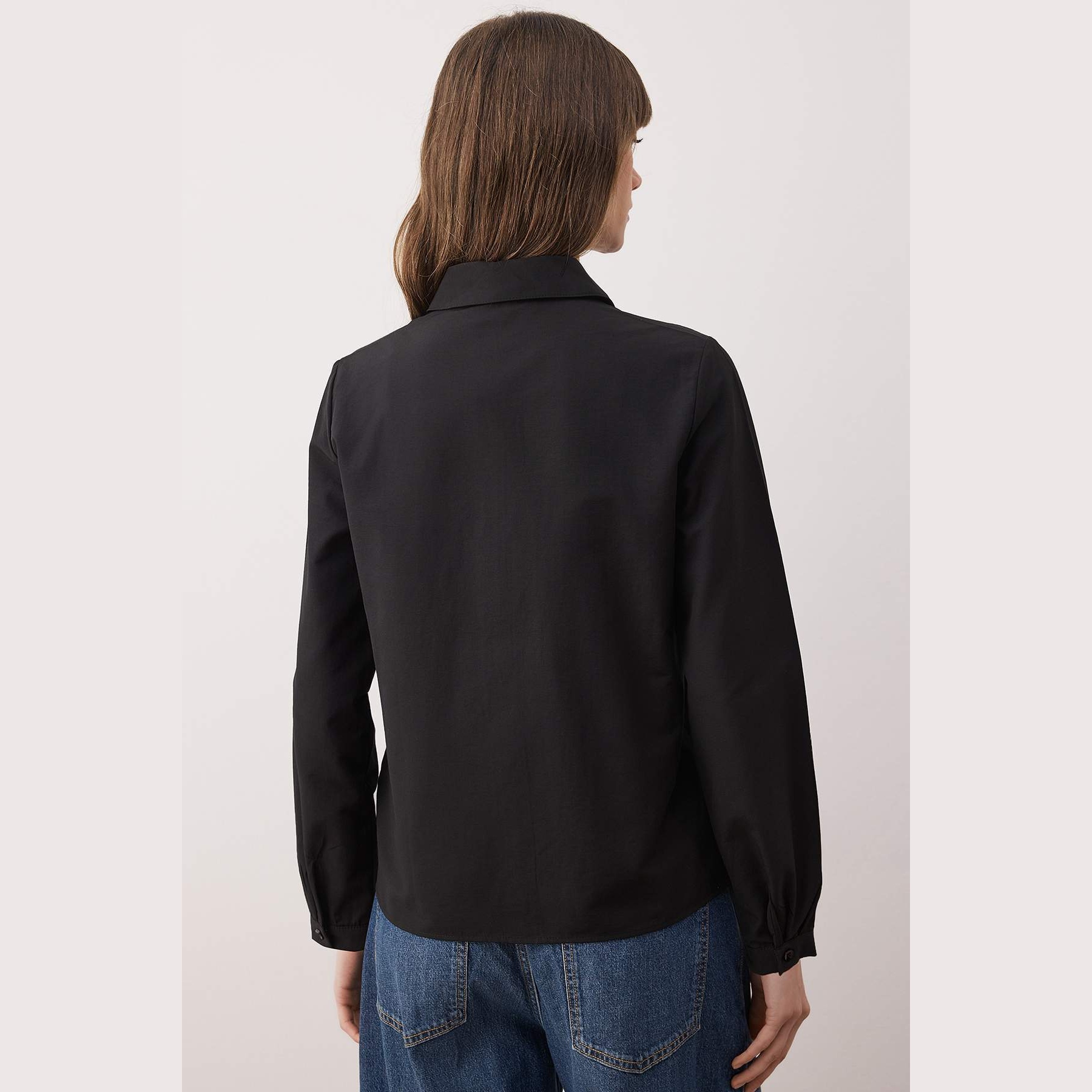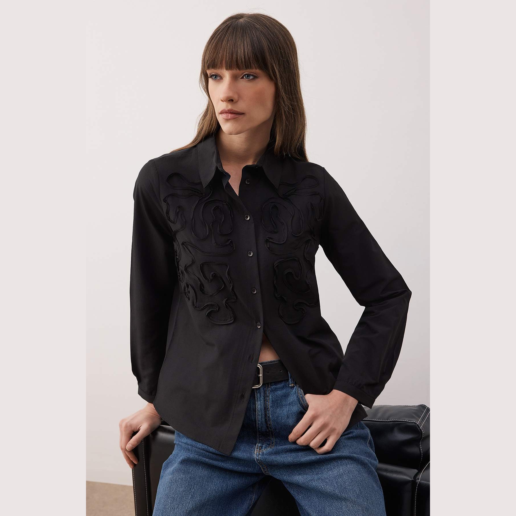 قميص نسائي بلون أسود، مصنوع من خامة دوكّوما ناعمة بتركيبة قطن وبوليستر، يمنح ملمسًا مريحًا ومظهرًا أنيقًا. يتميز بياقة قميص كلاسيكية، وأكمام طويلة، وقصة واسعة (Oversize) تضيف حرية في الحركة، مما يجعله خيارًا مثاليًا للإطلالات اليومية أو العملية.