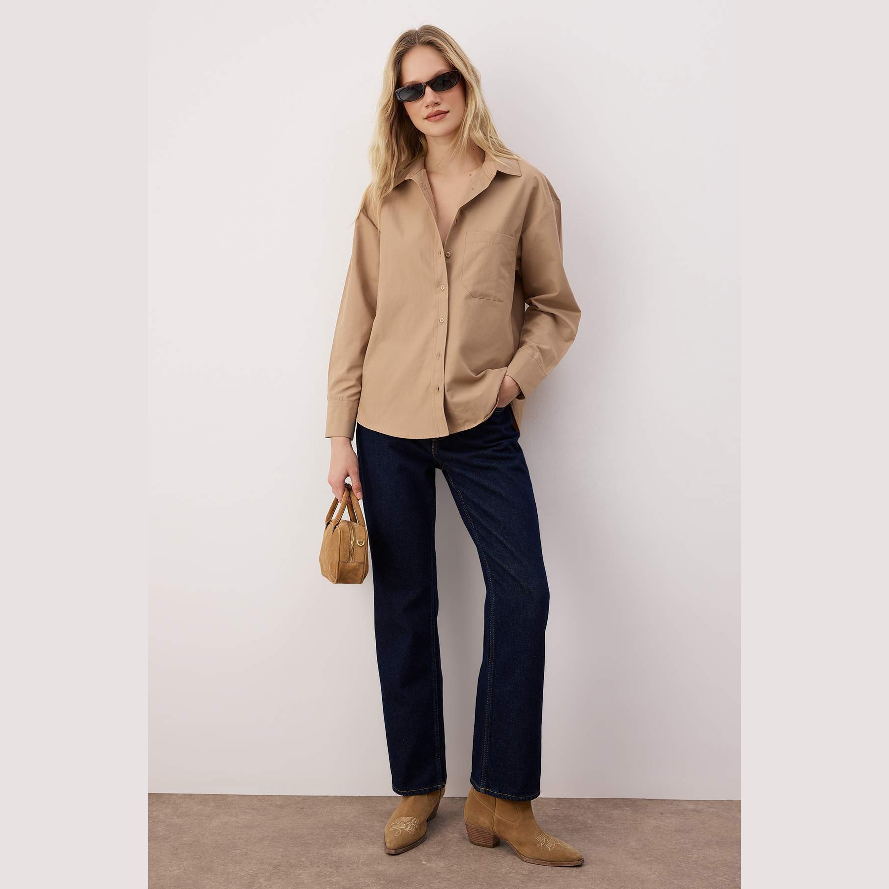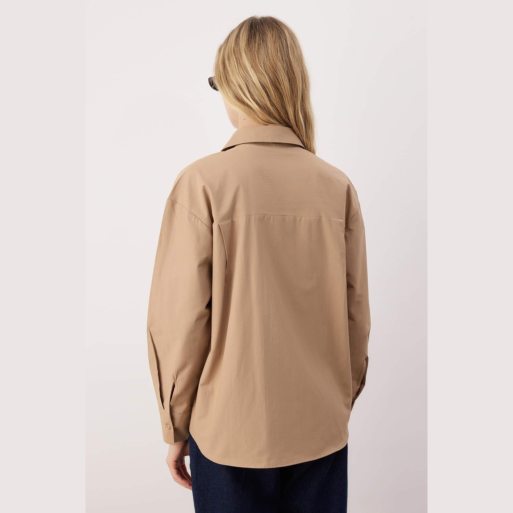قميص نسائي – بيج رملي بقصة Boyfriend وجيب أمامي (إطلالة كاجوال واسعة بخامة دوكّوما مريحة)