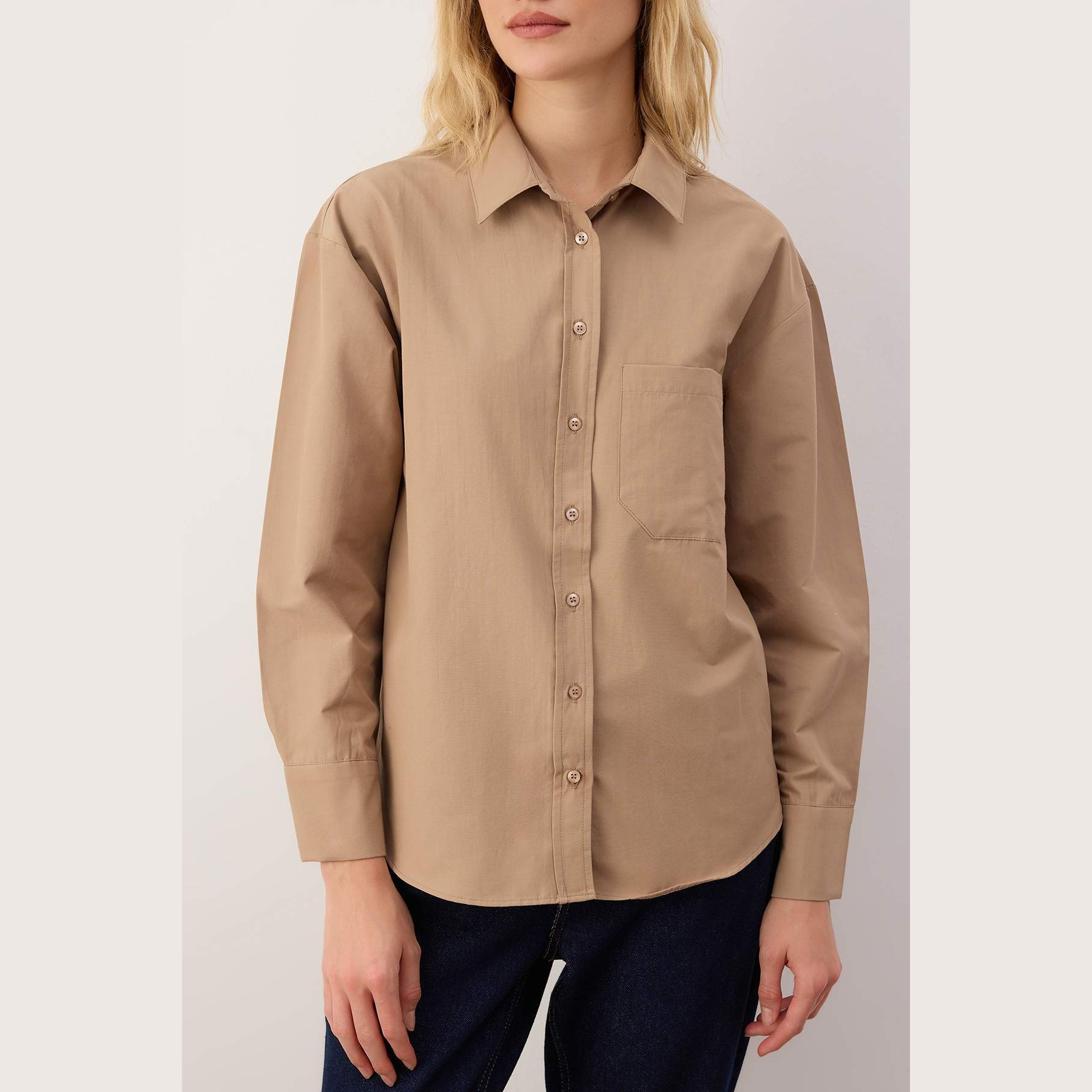 قميص نسائي بلون بيج رملي، مصنوع من خامة دوكّوما ناعمة بتركيبة قطن وبوليستر، يمنح ملمسًا مريحًا ومظهرًا عصريًا. يتميز بياقة قميص كلاسيكية، وأكمام طويلة، وجيب أمامي واحد، مع قصة واسعة (Boyfriend) تضيف لمسة كاجوال مثالية للإطلالات اليومية.