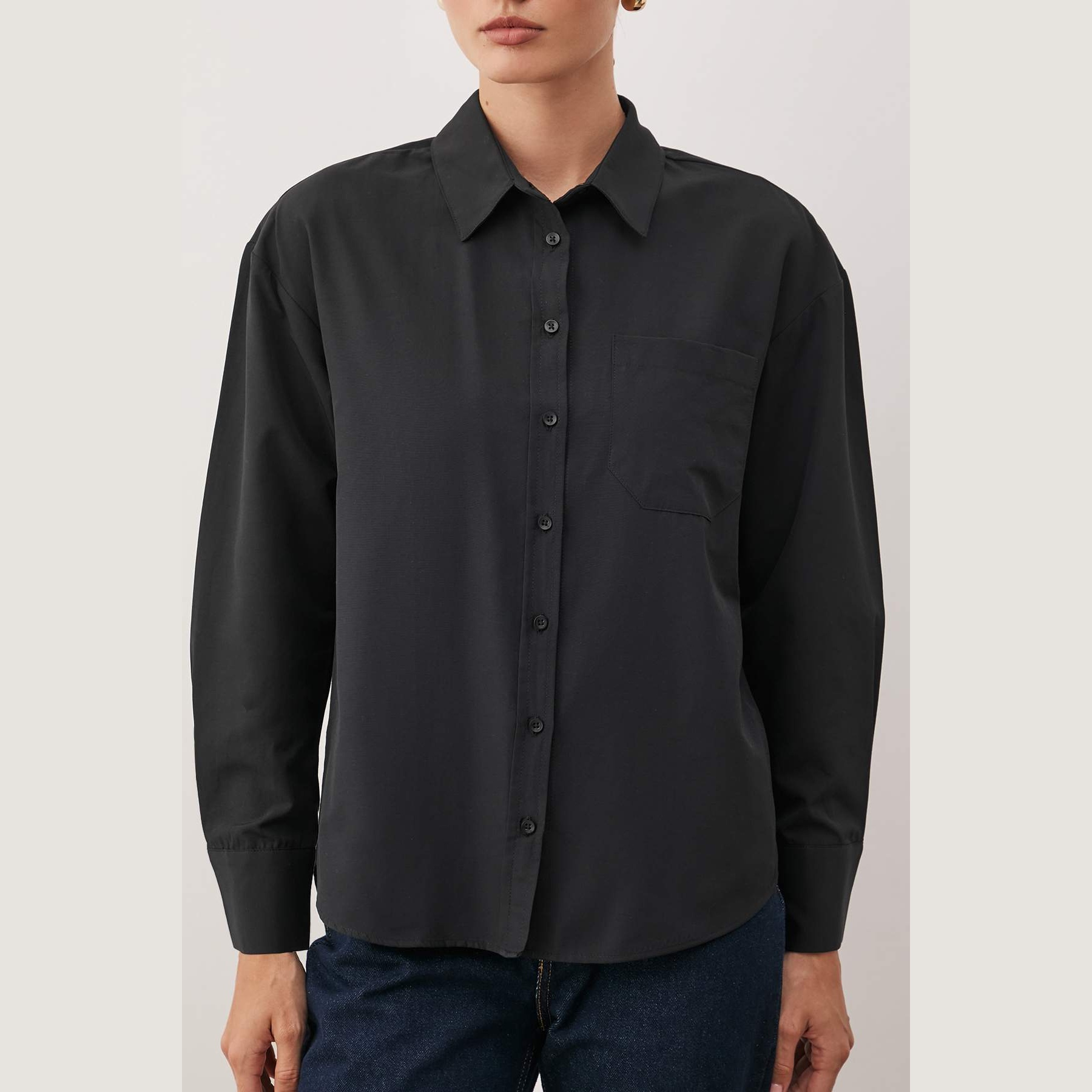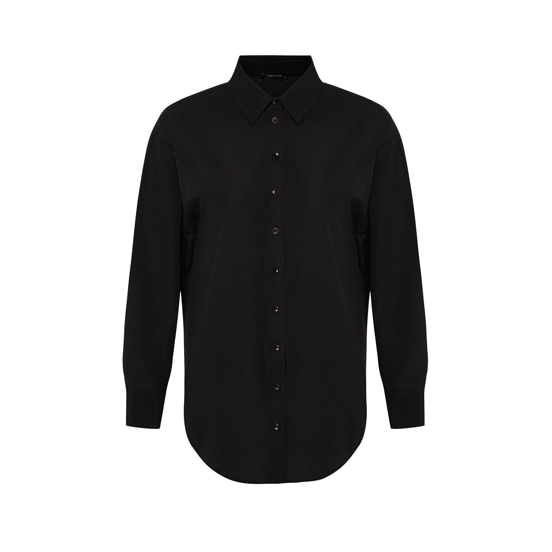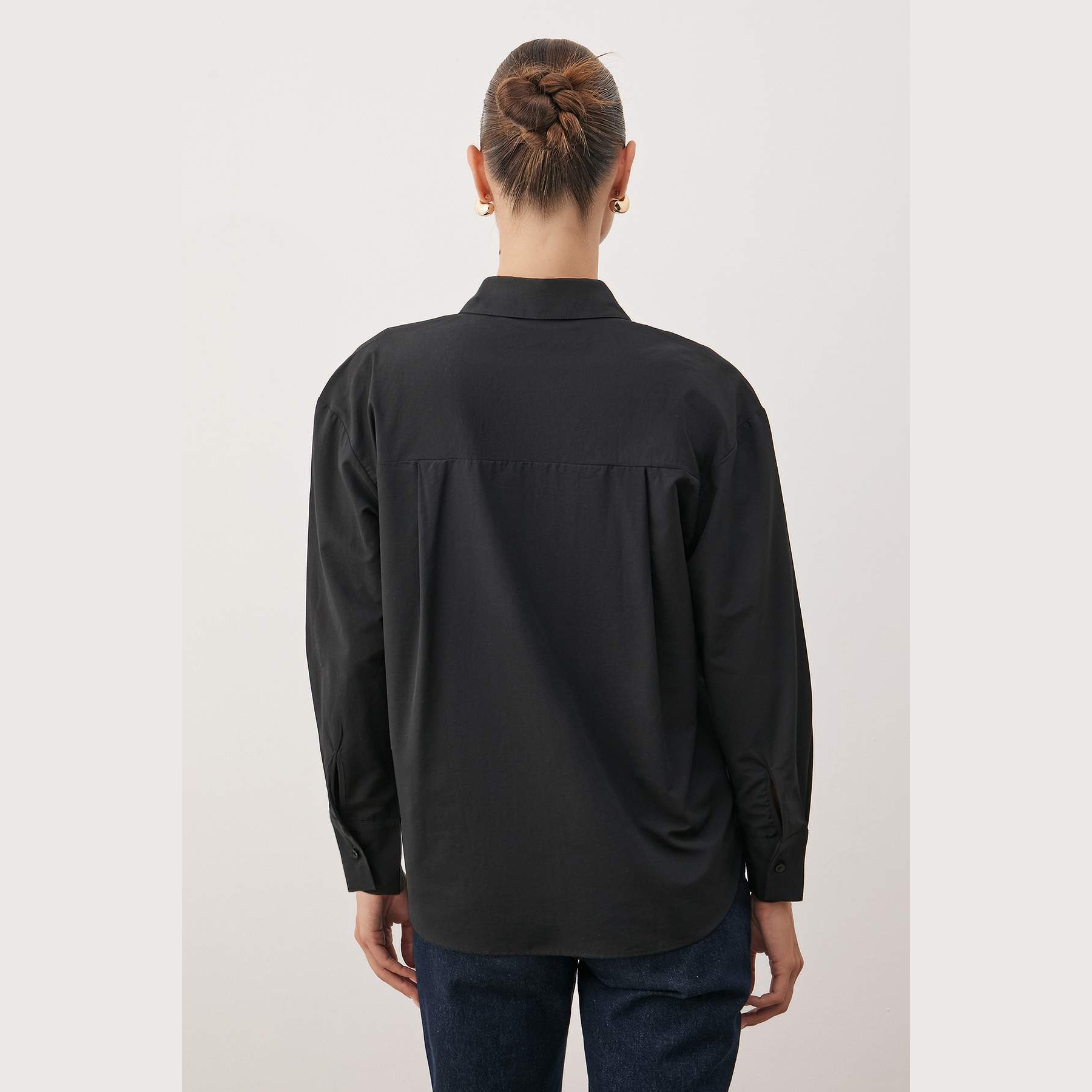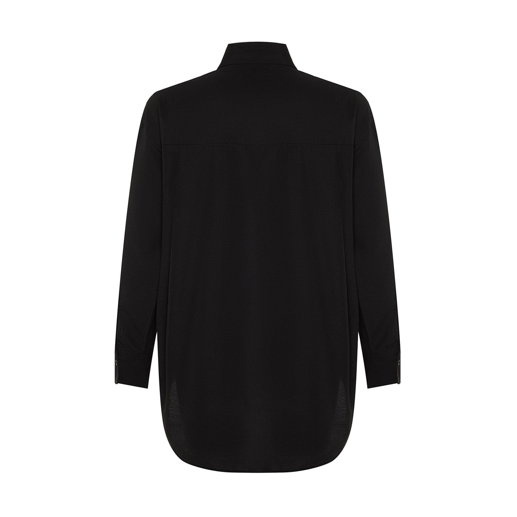 قميص نسائي بلون أسود، مصنوع من خامة دوكّوما ناعمة بتركيبة قطن وبوليستر، يمنح ملمسًا مريحًا ومظهرًا عصريًا. يتميز بياقة قميص كلاسيكية، وأكمام طويلة، وجيب أمامي واحد، مع قصة واسعة (Boyfriend) تضيف لمسة كاجوال مثالية للإطلالات اليومية.