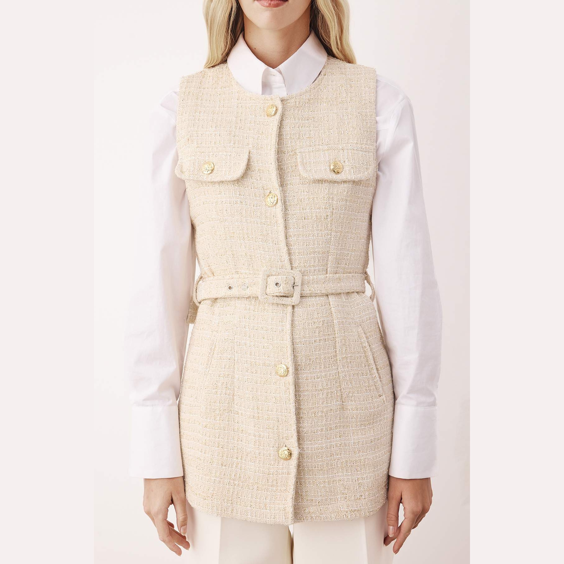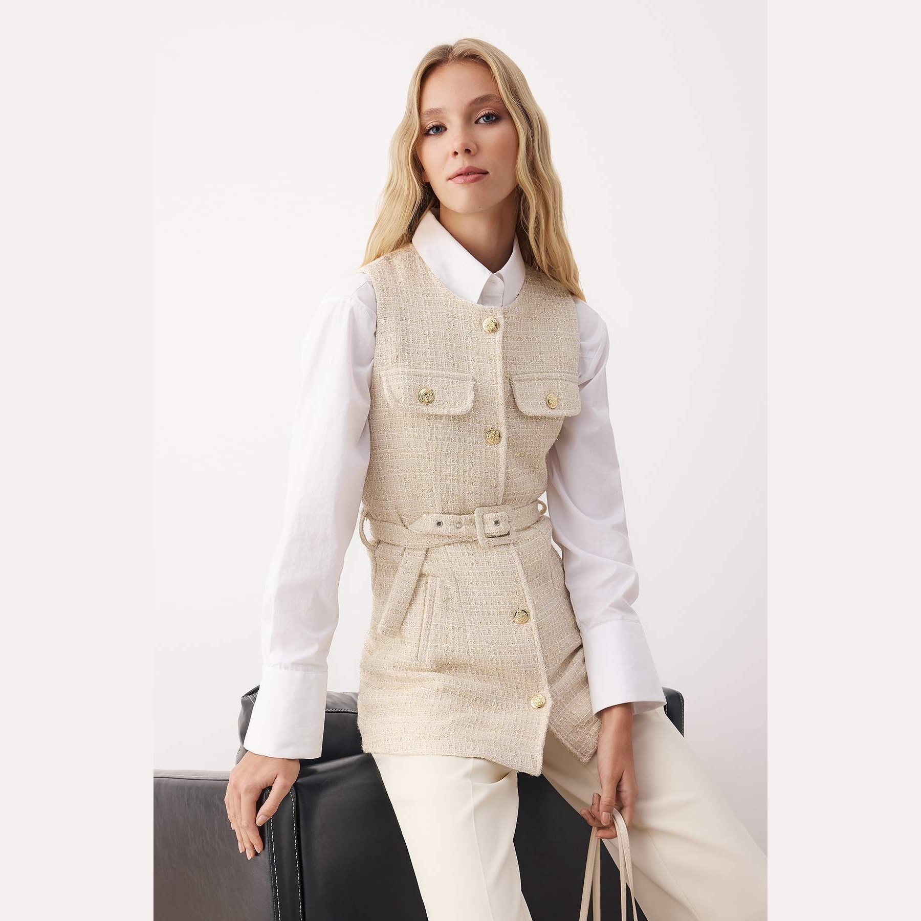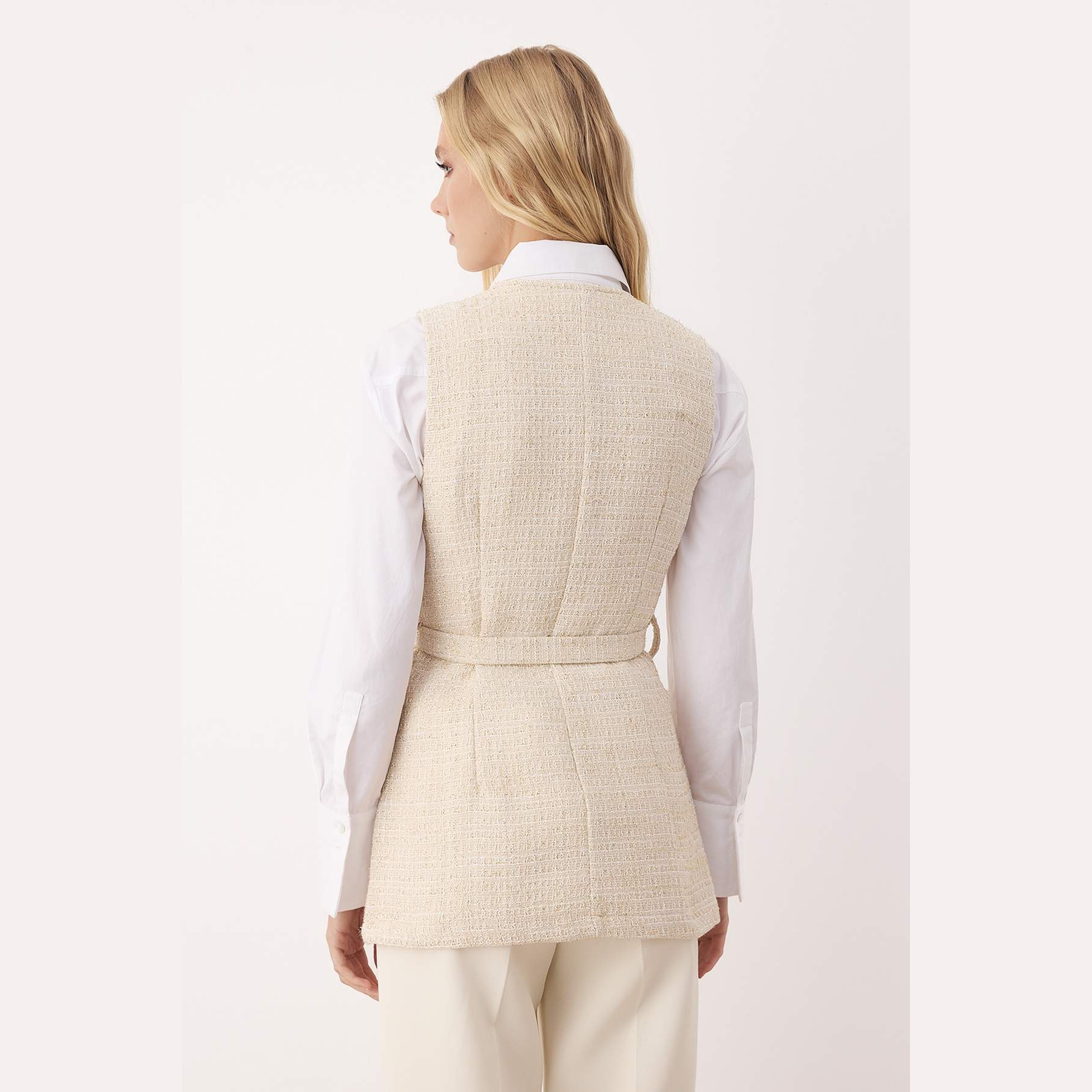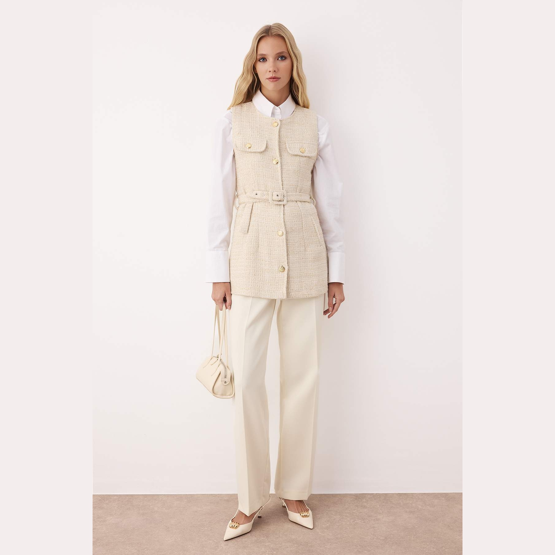 فيست نسائي بلون إكرو، مصنوع من خامة تويد منسوجة بتركيبة متعددة الألياف، يتميز بقصة Fitted ضيقة تبرز القوام، وياقة دائرية ناعمة، مع تصميم بدون بطانة يمنح خفة ومرونة في الارتداء. مثالي للتنسيق مع القمصان أو الفساتين لإطلالة يومية أنيقة وعصرية.