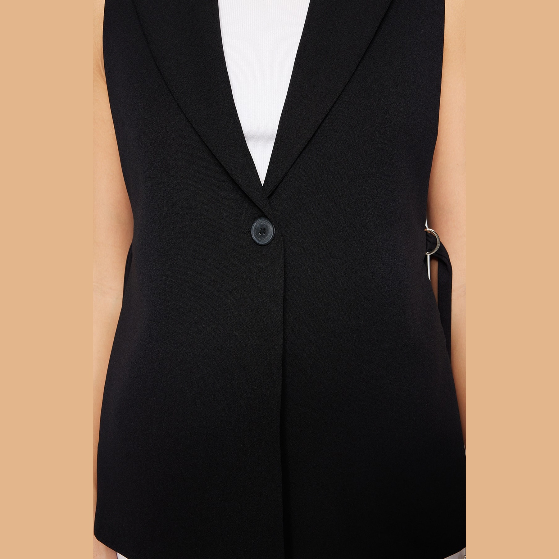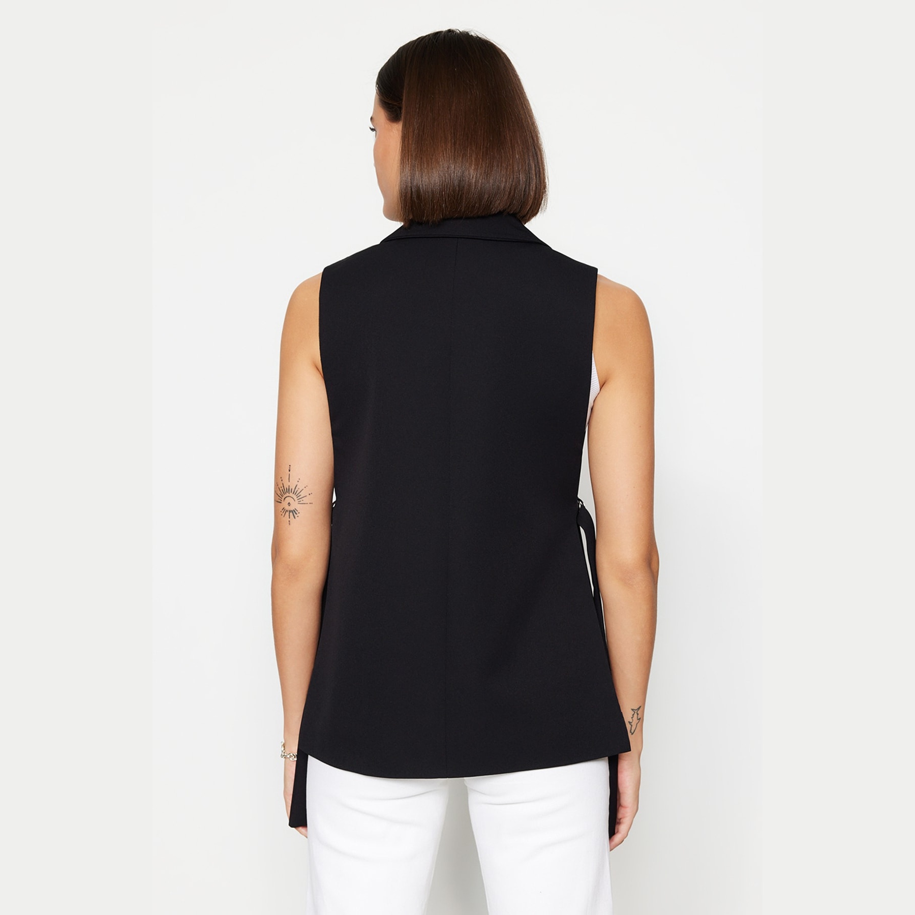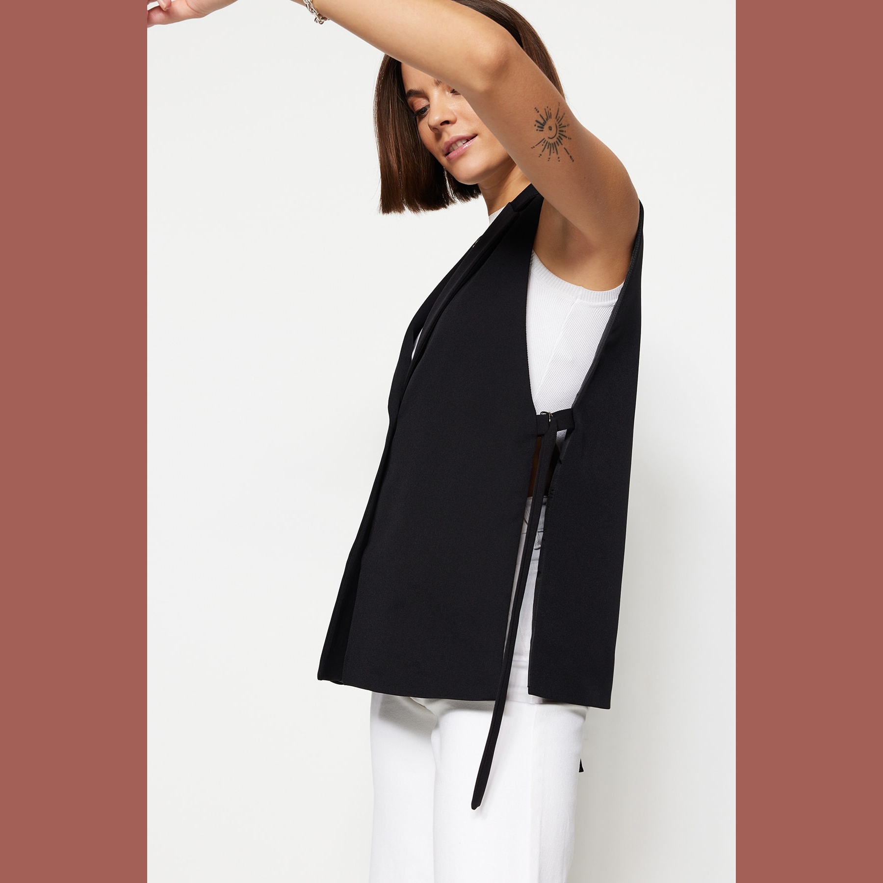 فيست نسائي – أسود بقصة Oversize وإكسسوارات جانبية (تصميم عصري واسع بلمسة جريئة)