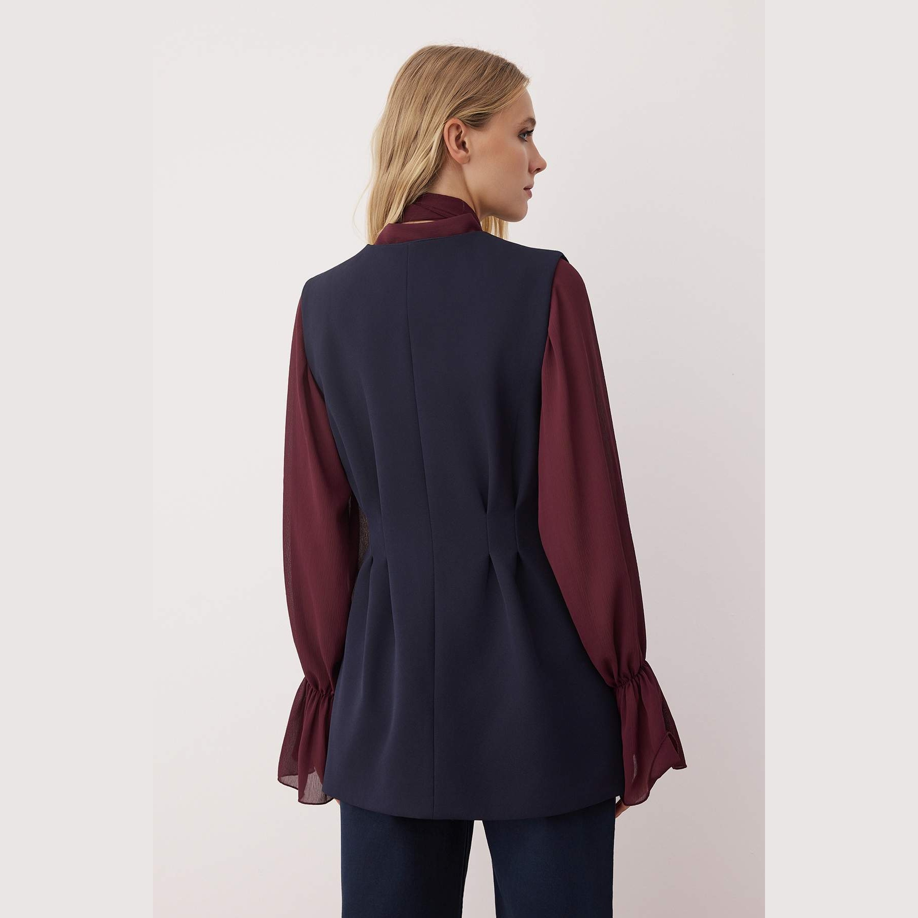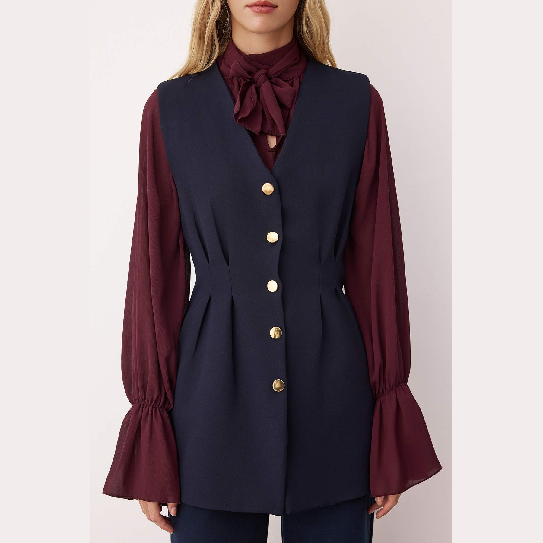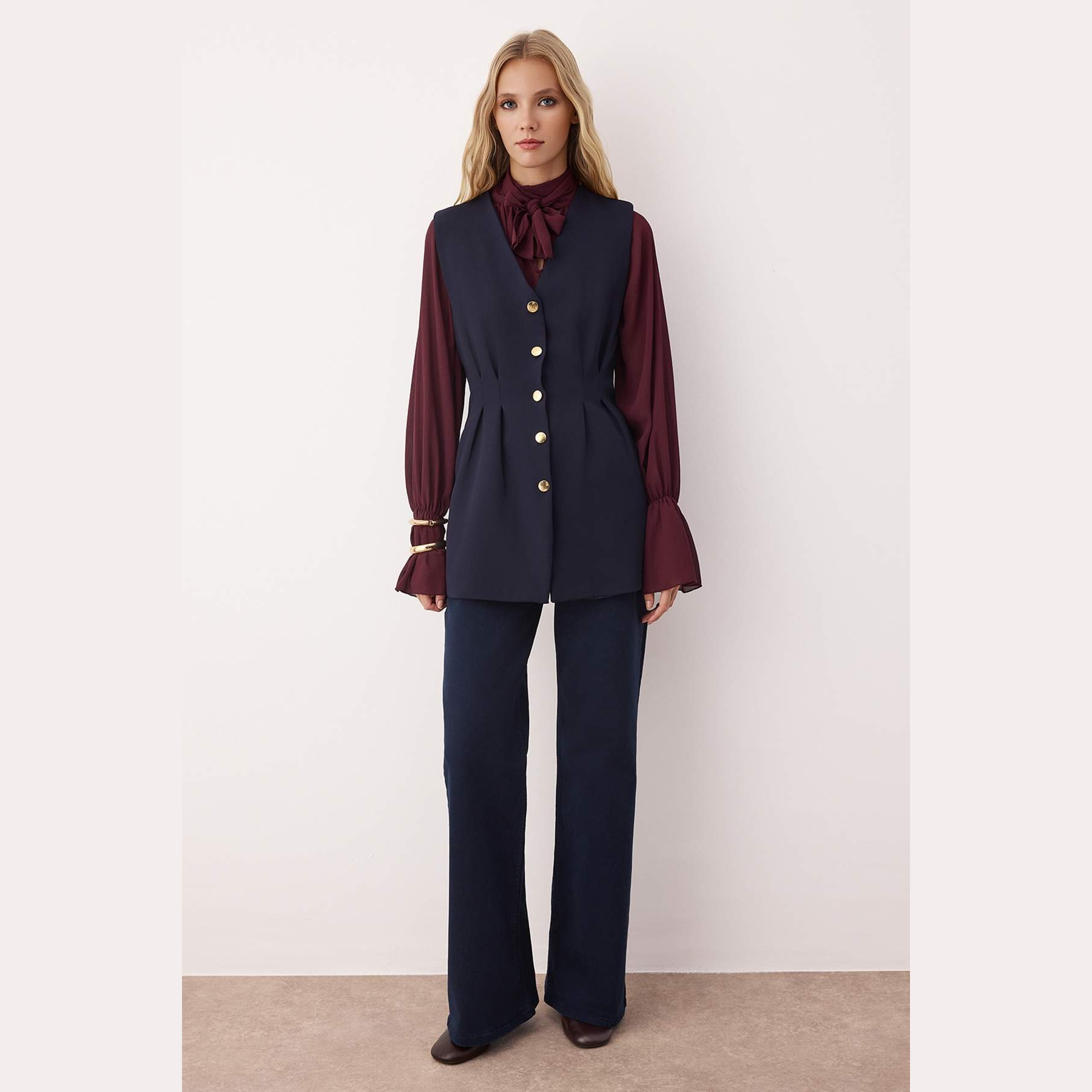 فيست نسائي بلون كحلي، مصنوع من خامة دوكّوما متينة ومبطّن بالكامل، يتميز بقصة Fitted ضيقة تبرز القوام، مع تفاصيل Peplum أنثوية عند الخصر تضيف لمسة تصميمية راقية. يأتي بياقة V أنثوية وإغلاق أمامي بكبّاسات، مما يجعله خيارًا مثاليًا للإطلالات اليومية أو العملية المحتشمة.