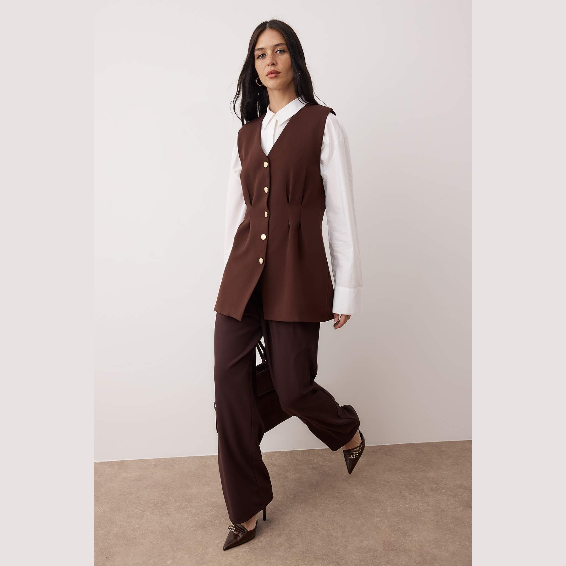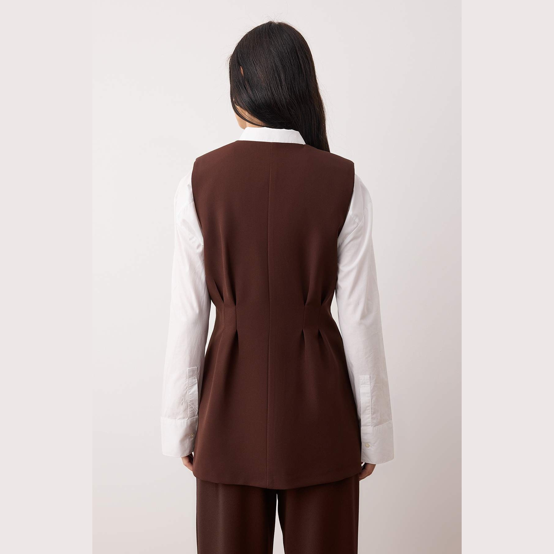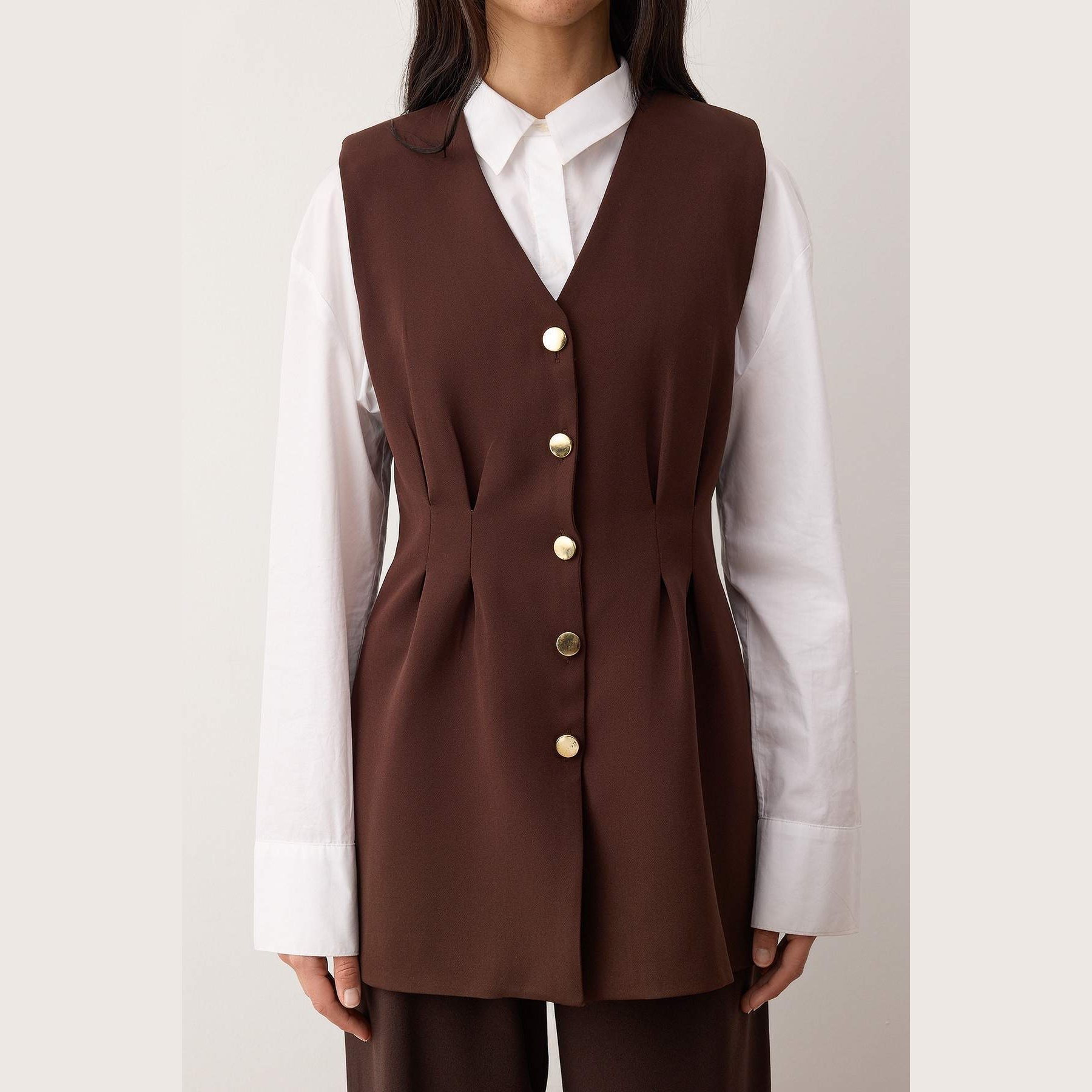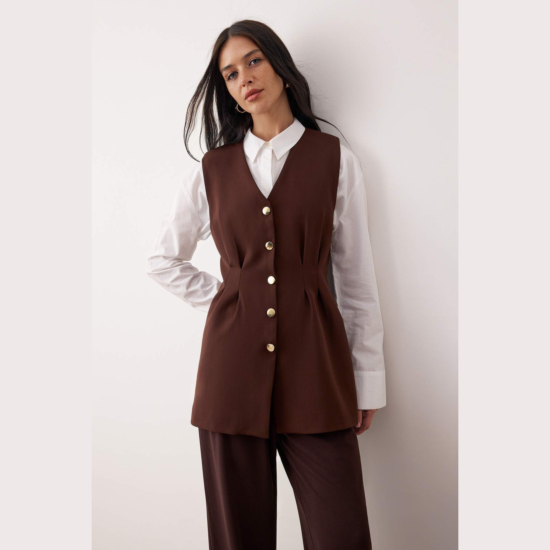 فيست نسائي بلون بني، مصنوع من خامة دوكّوما متينة ومبطّن بالكامل، يتميز بقصة Fitted ضيقة تبرز القوام، مع تفاصيل Peplum أنثوية عند الخصر تضيف لمسة تصميمية راقية. يأتي بياقة V أنثوية وإغلاق أمامي بكبّاسات، مما يجعله خيارًا مثاليًا للإطلالات اليومية أو العملية المحتشمة.