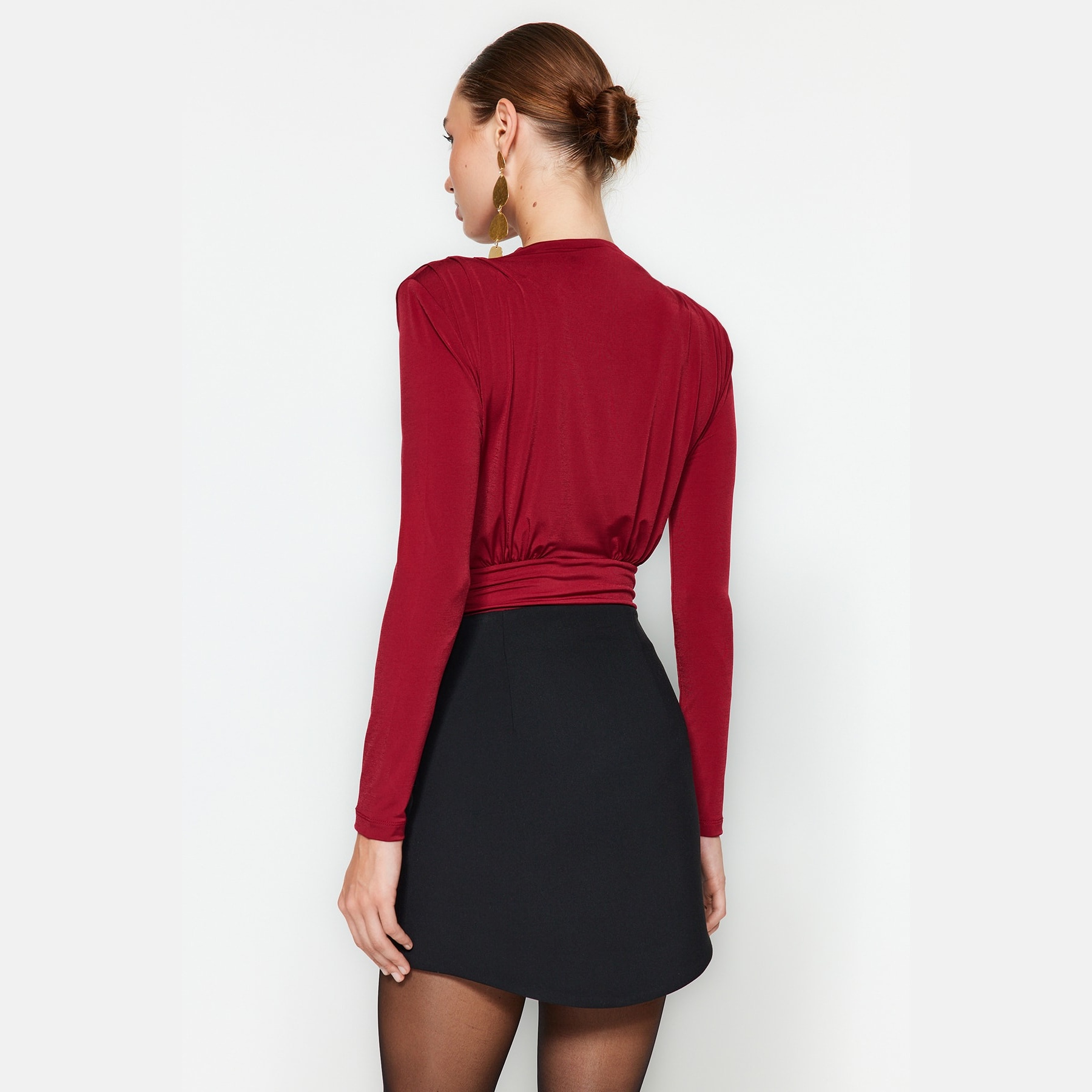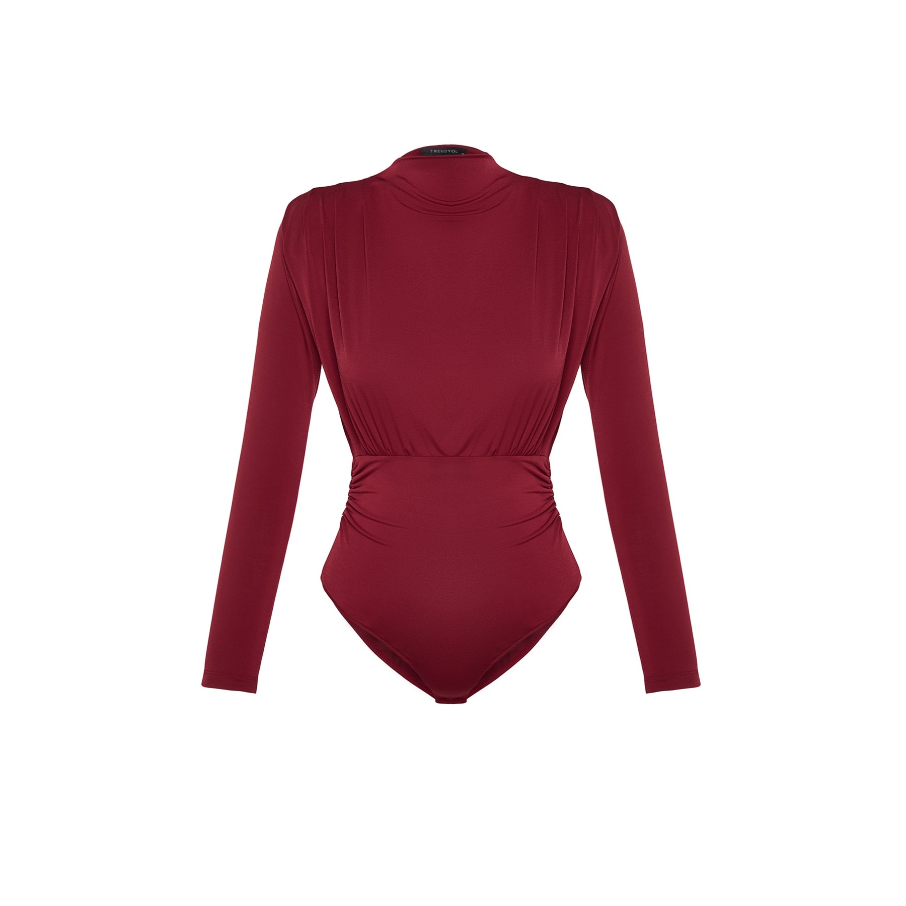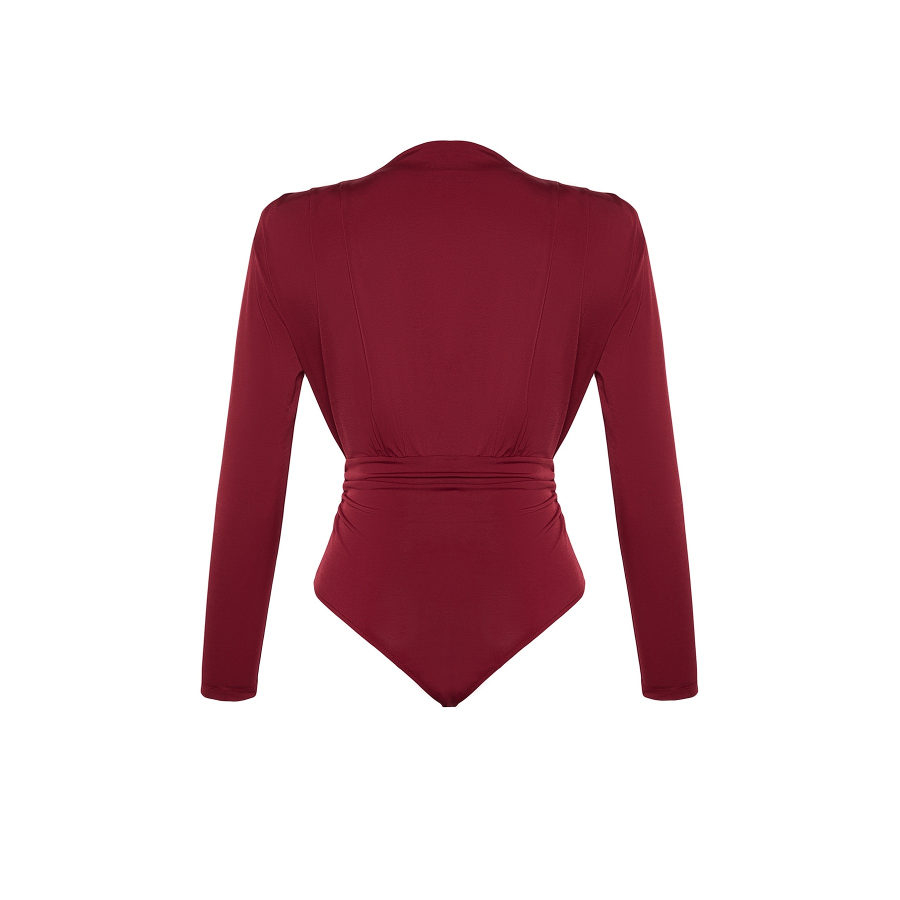 بودي نسائي بلون خمري، مصنوع من خامة Sandy مطاطية ولامعة، يتميز بياقة عالية تضيف لمسة رسمية، وأكتاف بارزة بفضل الفَتَك، مع درابيه أمامي يضفي لمسة أنثوية راقية. يأتي بقصة Fitted تبرز القوام، وإغلاق سفلي بصَفّاطات عملية. مثالي للإطلالات المسائية والمناسبات الخاصة.