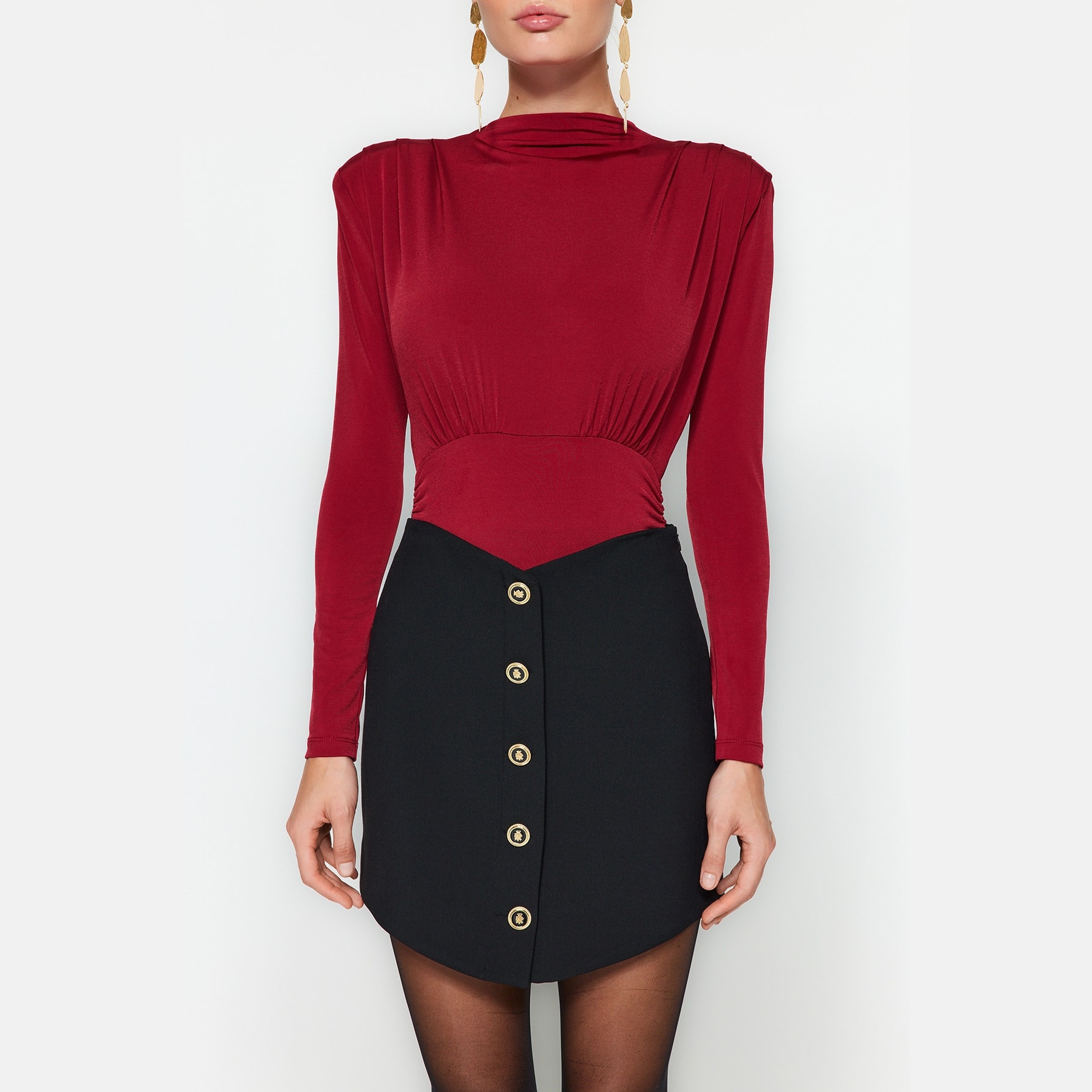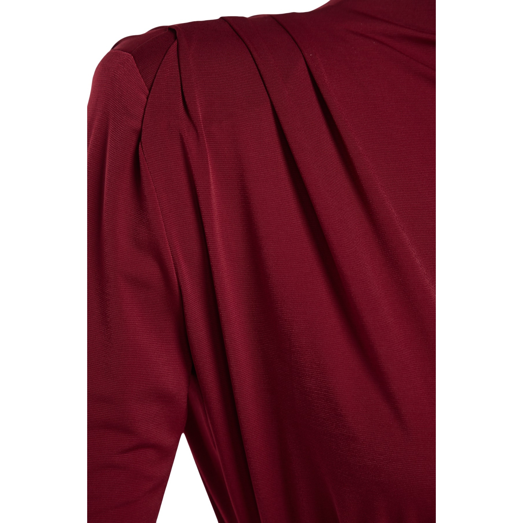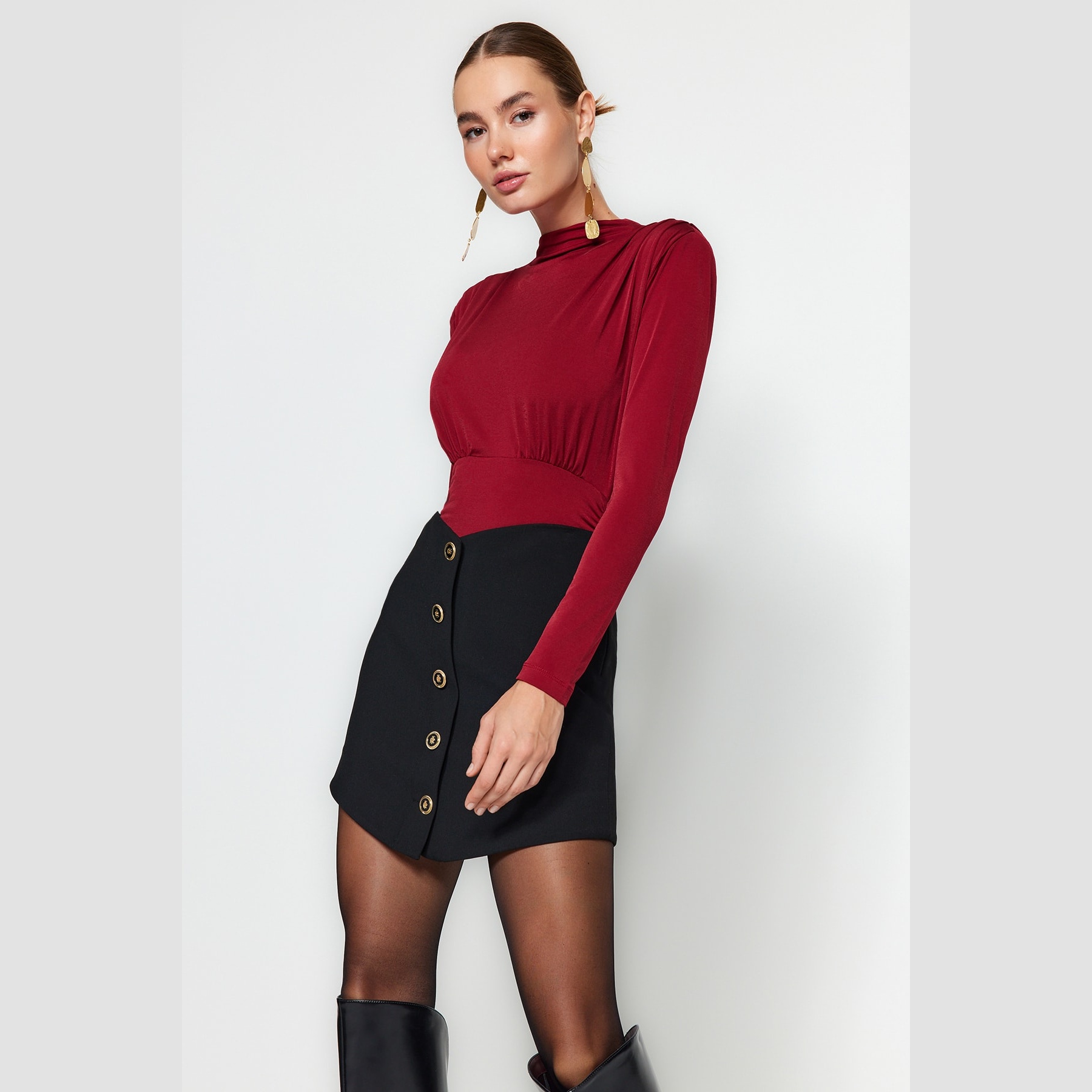 بودي نسائي بلون خمري، مصنوع من خامة Sandy مطاطية ولامعة، يتميز بياقة عالية تضيف لمسة رسمية، وأكتاف بارزة بفضل الفَتَك، مع درابيه أمامي يضفي لمسة أنثوية راقية. يأتي بقصة Fitted تبرز القوام، وإغلاق سفلي بصَفّاطات عملية. مثالي للإطلالات المسائية والمناسبات الخاصة.