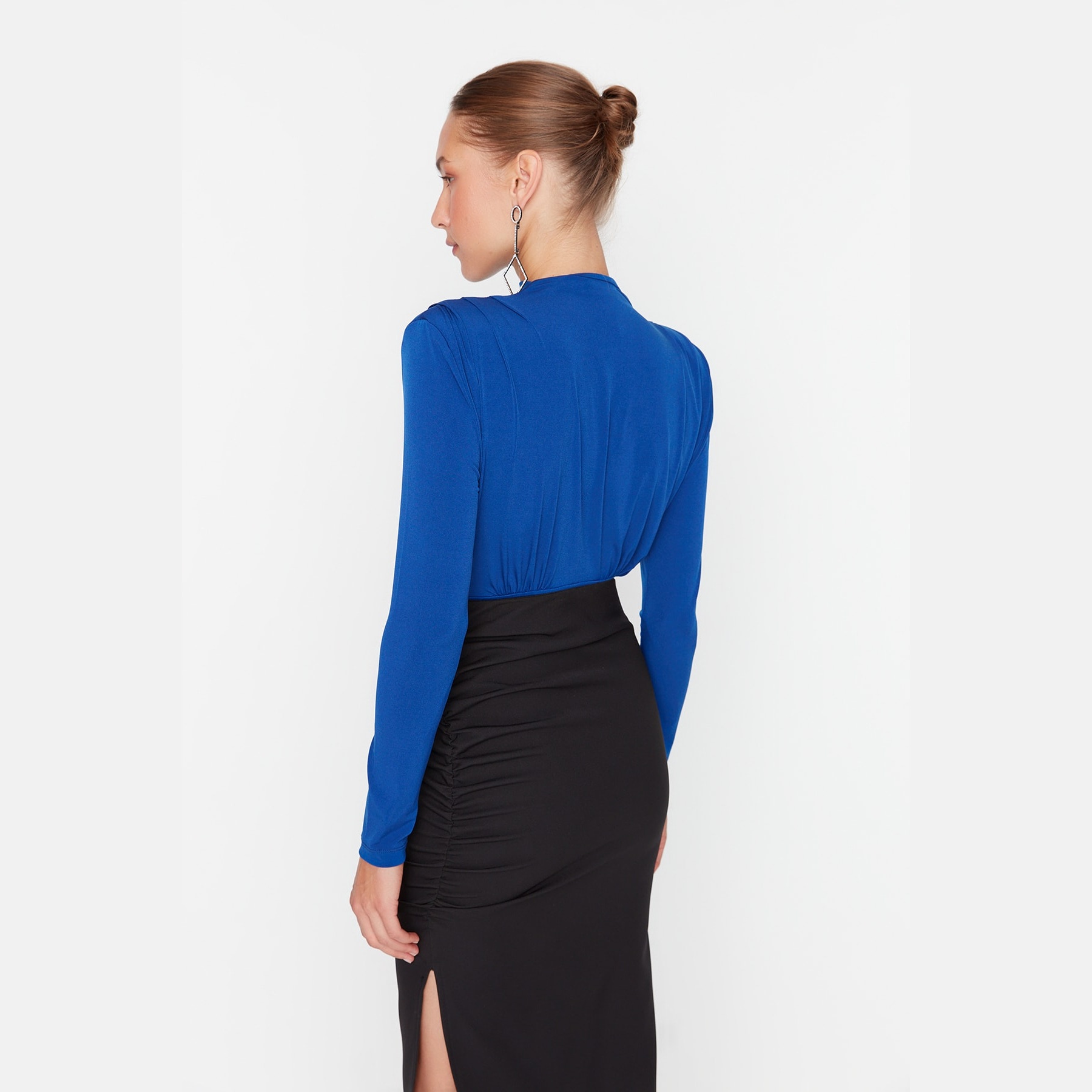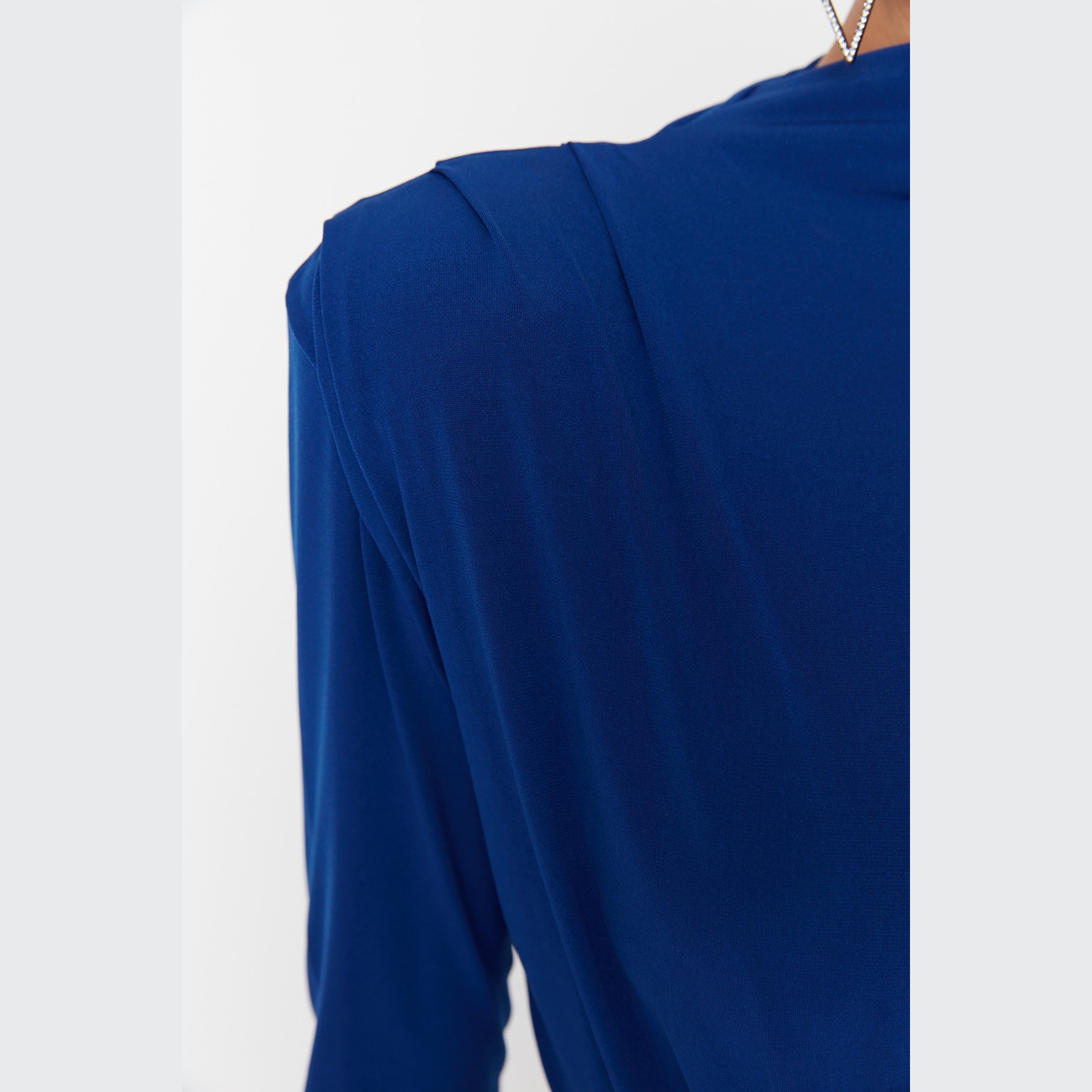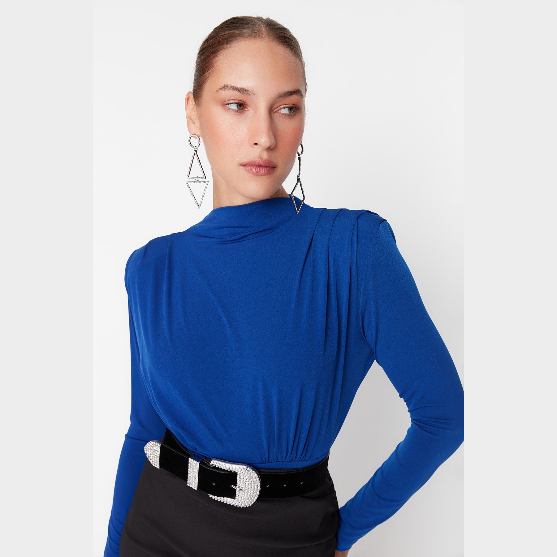 بودي نسائي بلون سَكْس، مصنوع من خامة Sandy مطاطية ولامعة، يتميز بياقة عالية تضيف لمسة رسمية، وأكتاف بارزة بفضل الفَتَك، مع درابيه أمامي يضفي لمسة أنثوية راقية. يأتي بقصة Fitted تبرز القوام، وإغلاق سفلي بصَفّاطات عملية. مثالي للإطلالات المسائية والمناسبات الخاصة.
