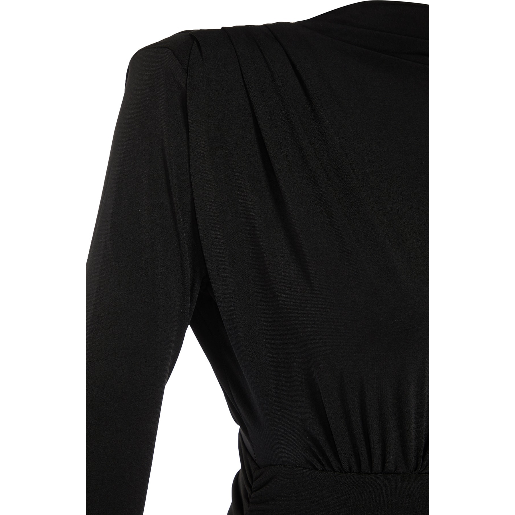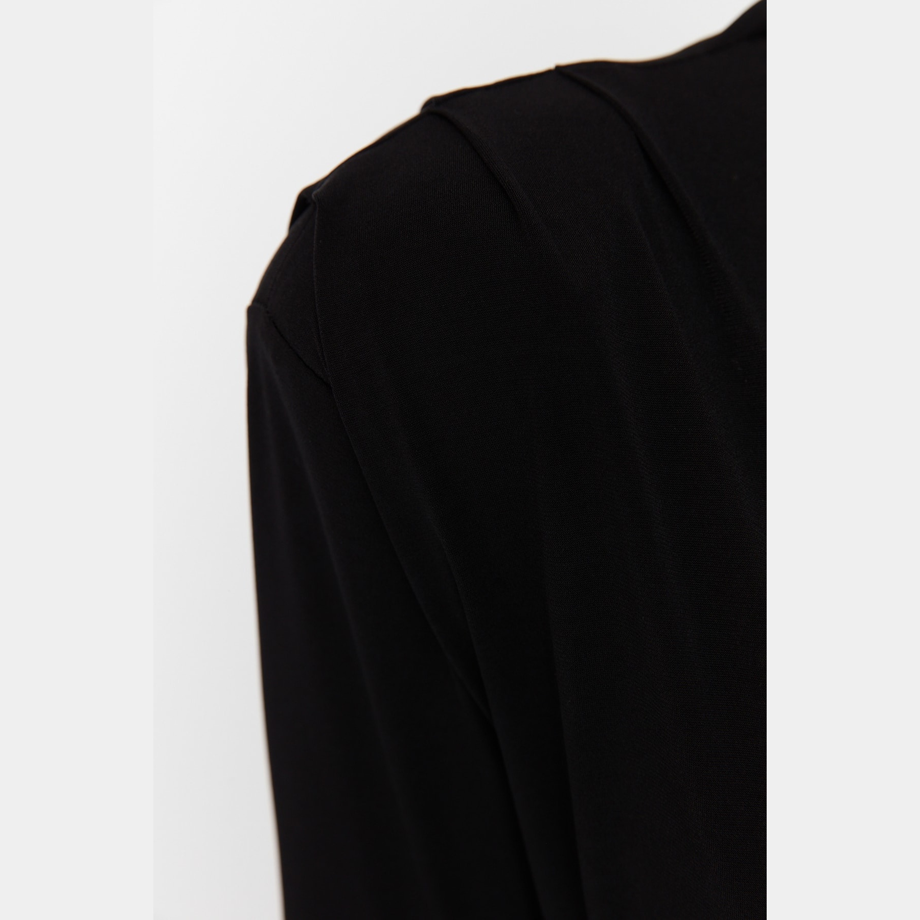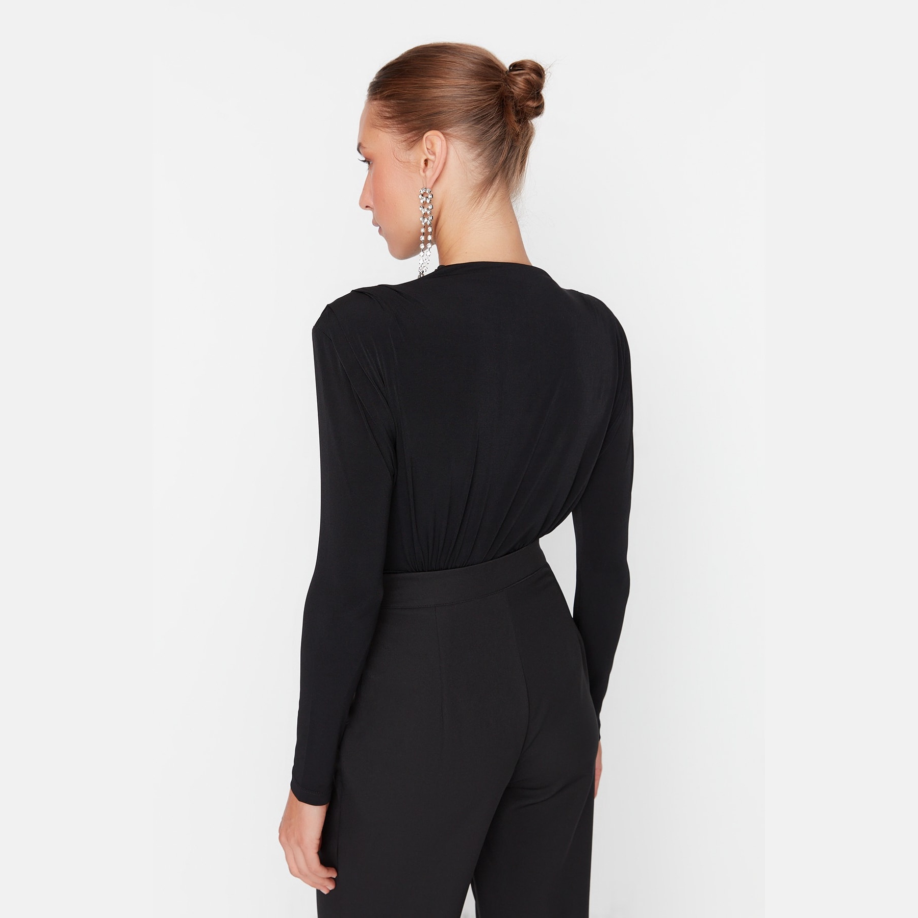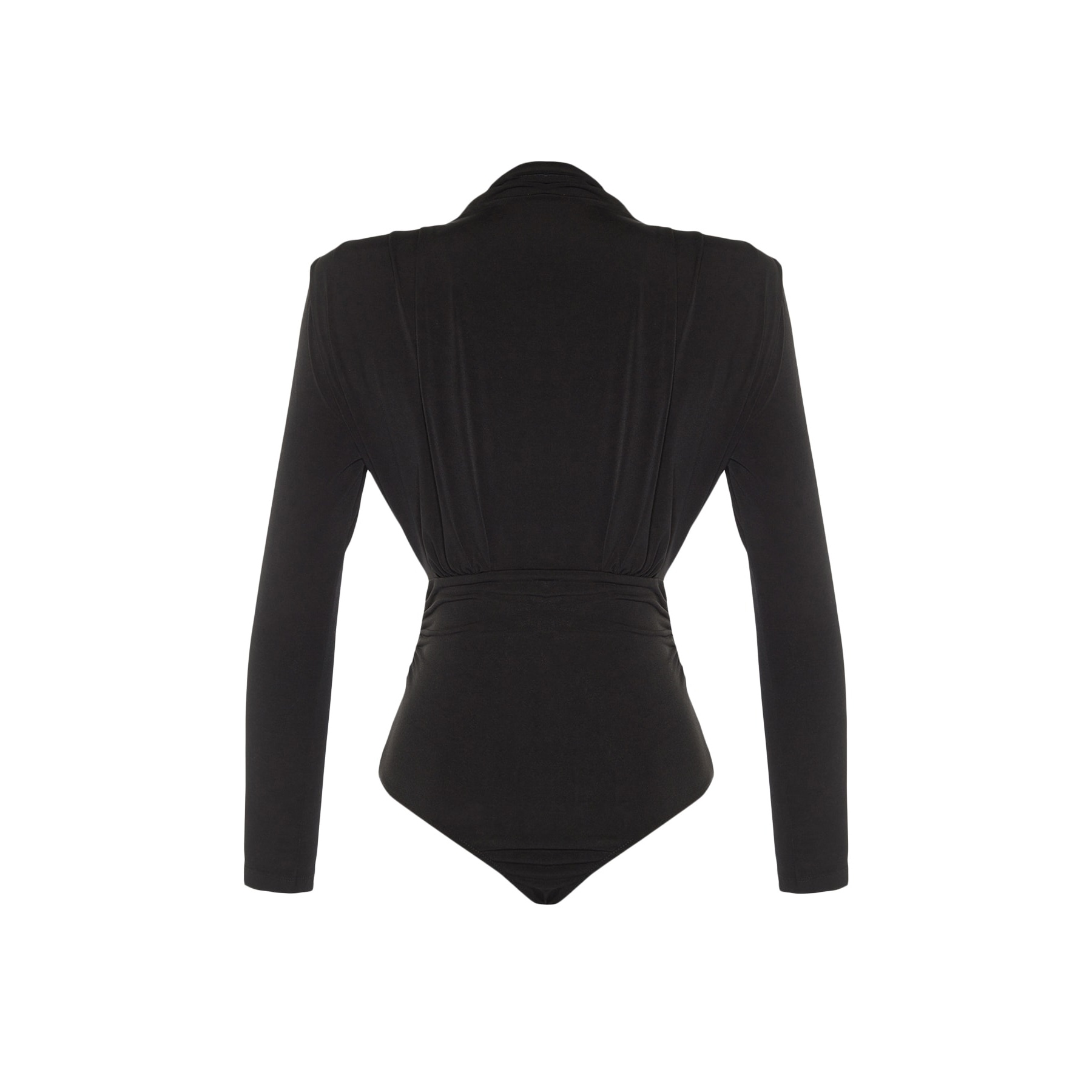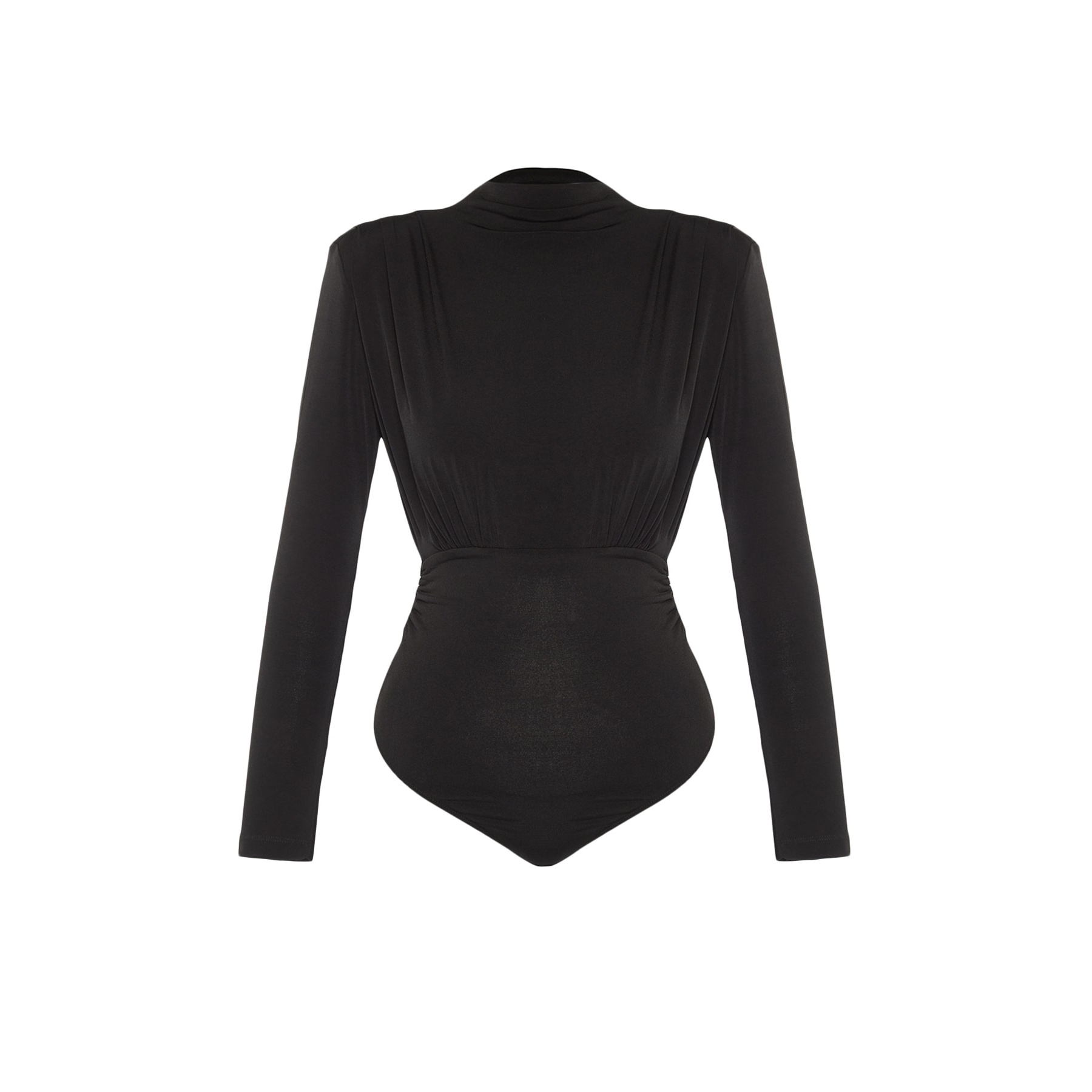 بودي نسائي بلون أسود، مصنوع من خامة Sandy مطاطية ولامعة، يتميز بياقة عالية تضيف لمسة رسمية، وأكتاف بارزة بفضل الفَتَك، مع درابيه أمامي يضفي لمسة أنثوية راقية. يأتي بقصة Fitted تبرز القوام، وإغلاق سفلي بصَفّاطات عملية. مثالي للإطلالات المسائية والمناسبات الخاصة.