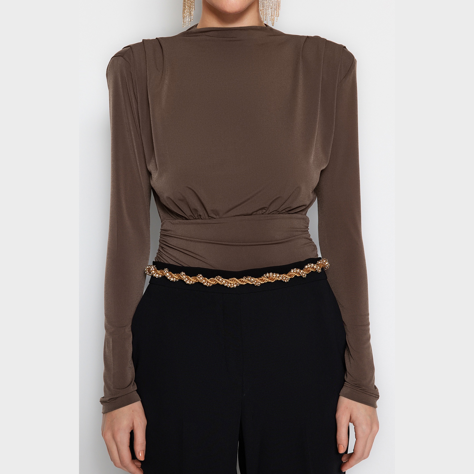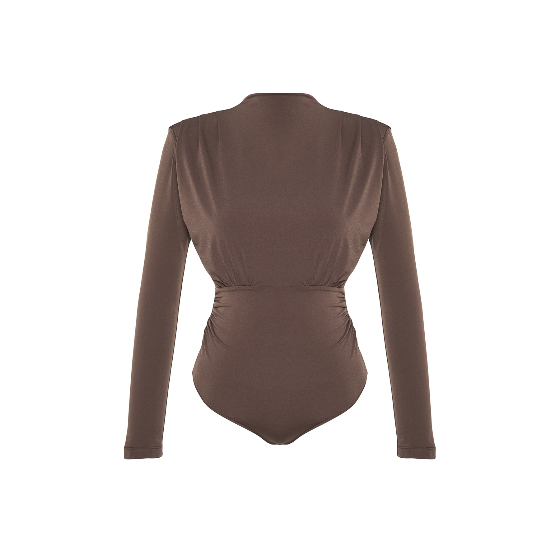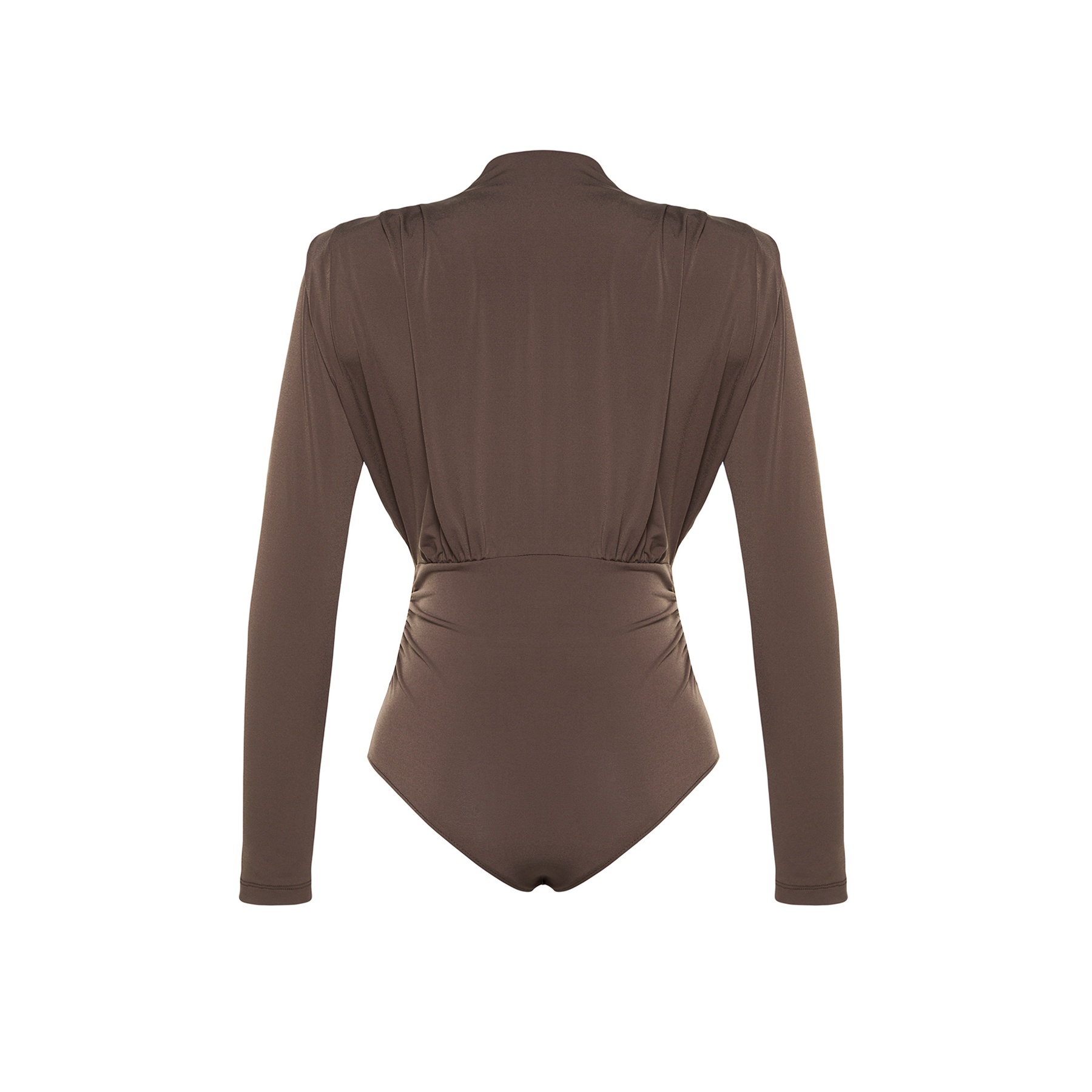 بودي نسائي بلون بني، مصنوع من خامة Sandy مطاطية ولامعة، يتميز بياقة عالية تضيف لمسة رسمية، وأكتاف بارزة بفضل الفَتَك، مع درابيه أمامي يضفي لمسة أنثوية راقية. يأتي بقصة Fitted تبرز القوام، وإغلاق سفلي بصَفّاطات عملية. مثالي للإطلالات المسائية والمناسبات الخاصة.