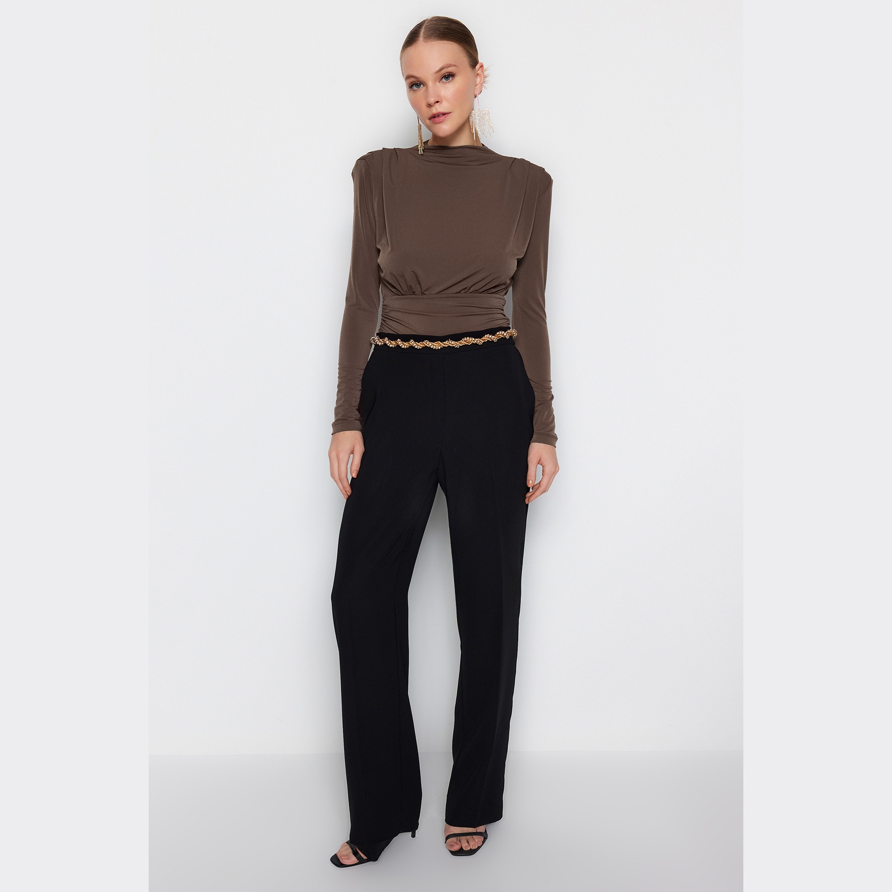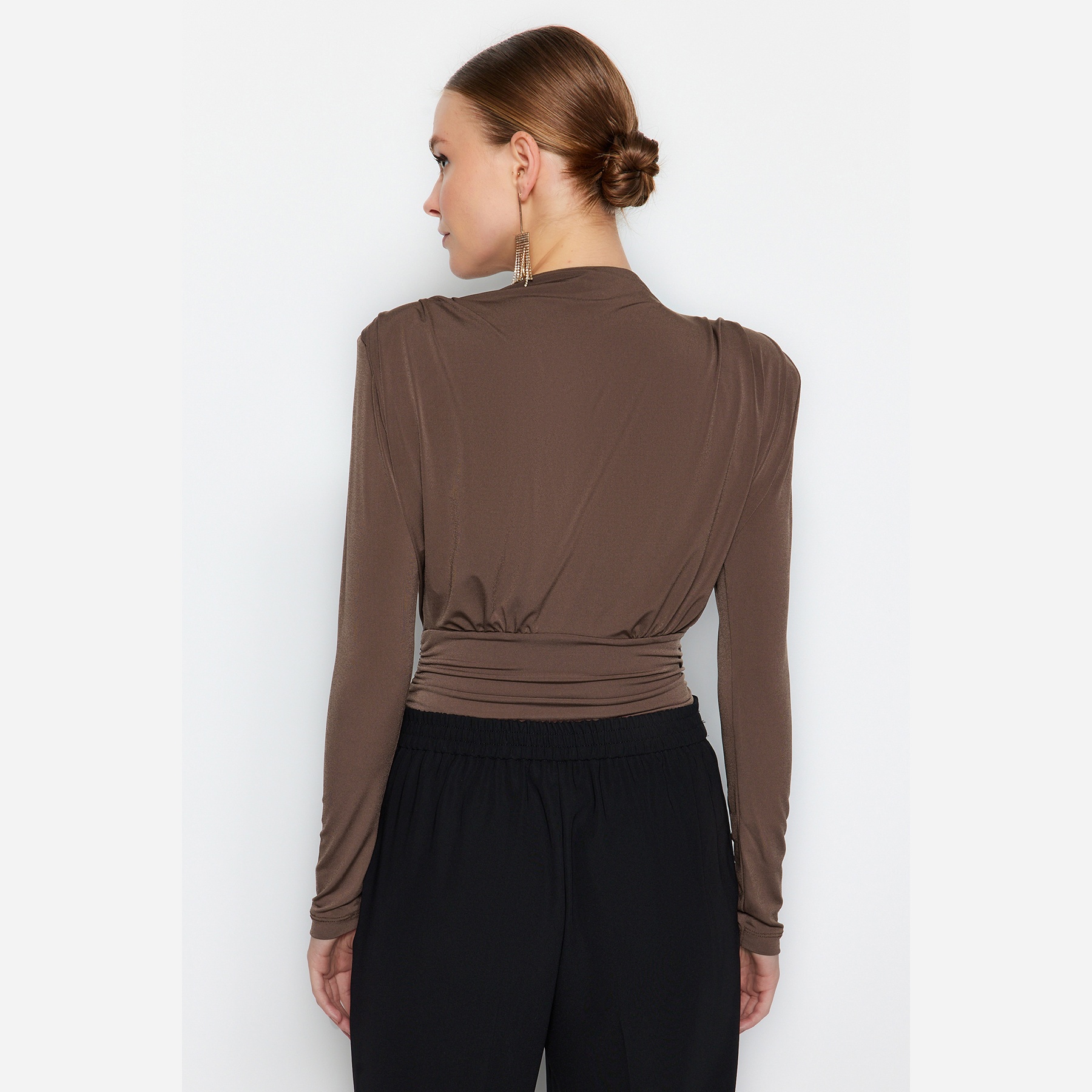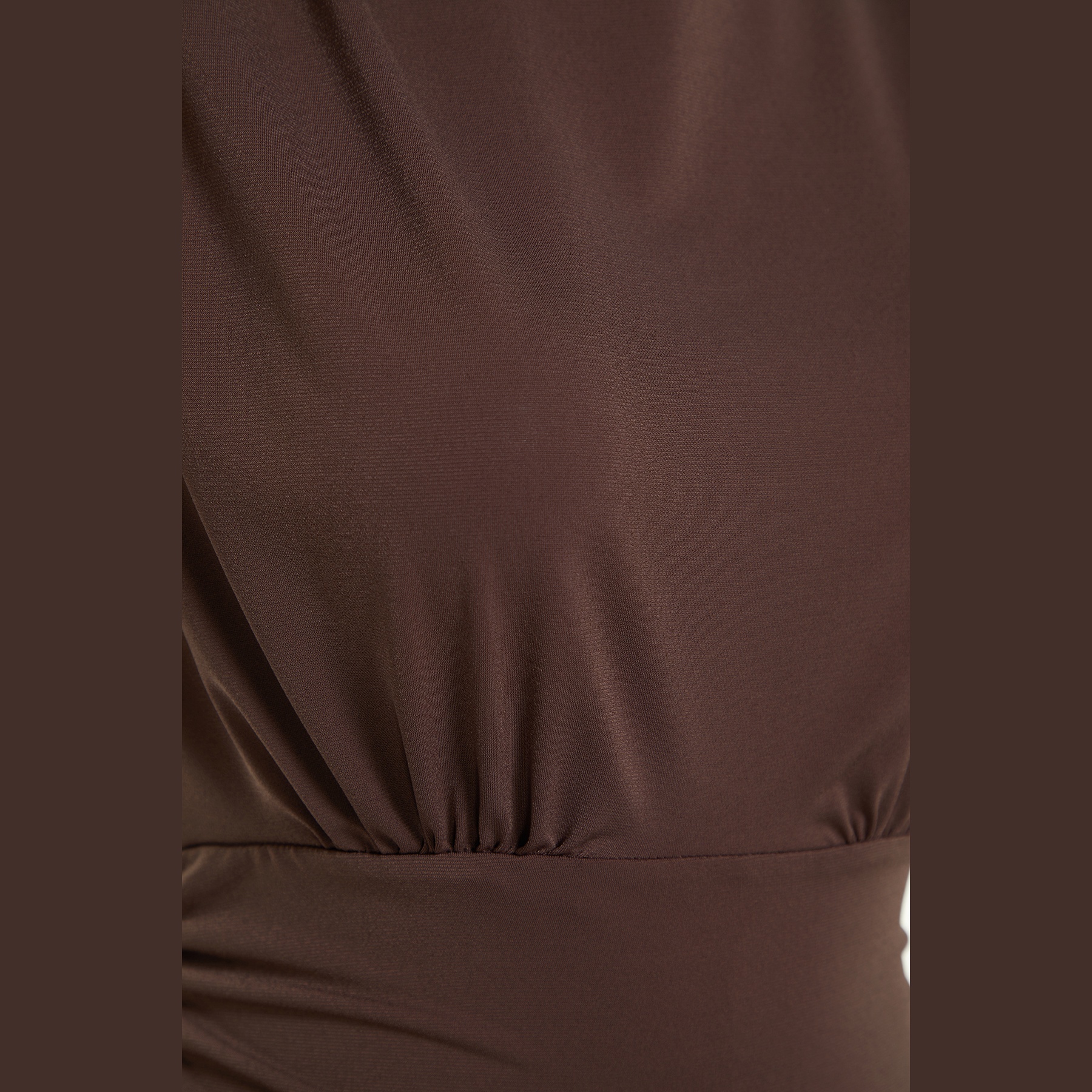 بودي نسائي بلون بني، مصنوع من خامة Sandy مطاطية ولامعة، يتميز بياقة عالية تضيف لمسة رسمية، وأكتاف بارزة بفضل الفَتَك، مع درابيه أمامي يضفي لمسة أنثوية راقية. يأتي بقصة Fitted تبرز القوام، وإغلاق سفلي بصَفّاطات عملية. مثالي للإطلالات المسائية والمناسبات الخاصة.