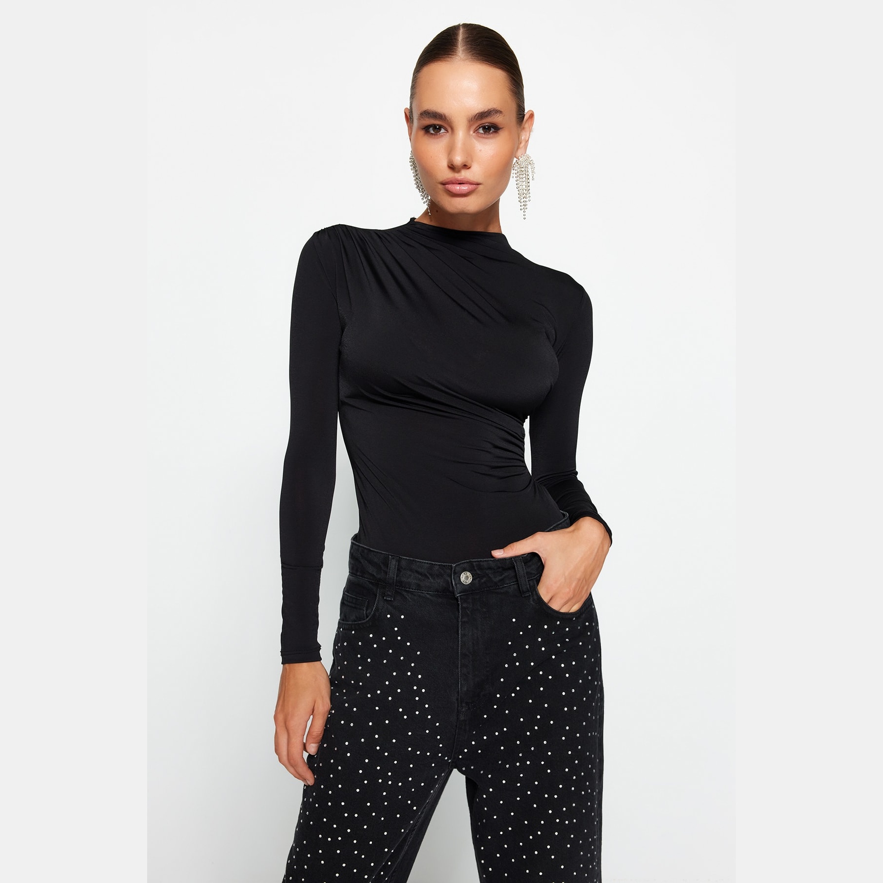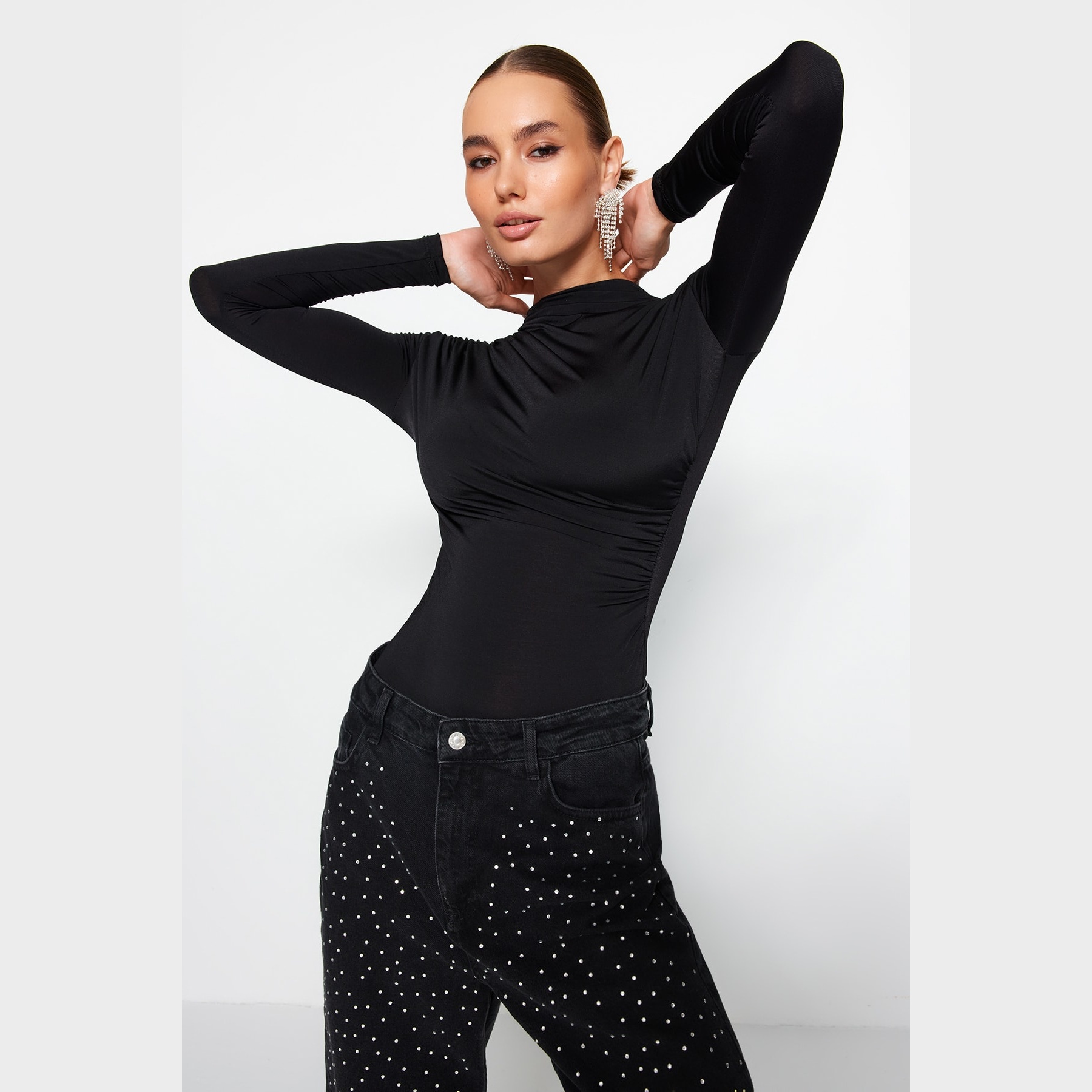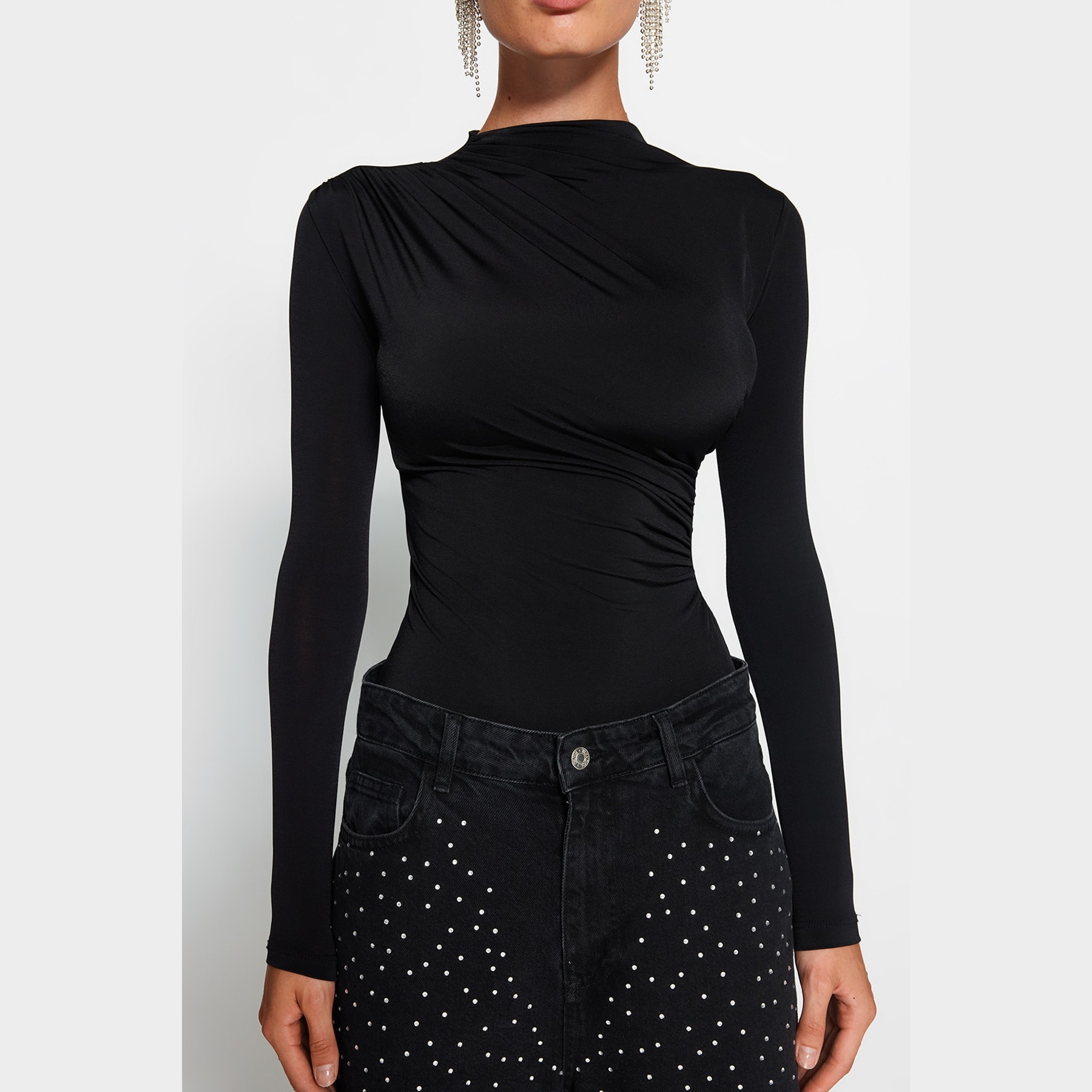 بودي نسائي – أسود بياقة عالية وفتك بارز (تصميم عملي أنيق بخامة مطاطية مريحة)