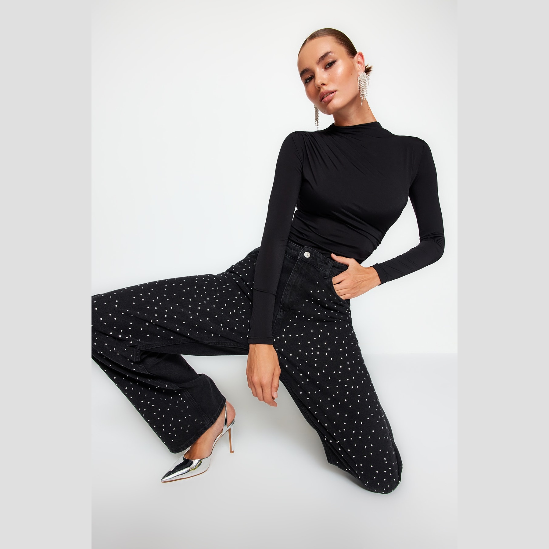 بودي نسائي بلون أسود، مصنوع من خامة تريكو مطاطية بتركيبة بوليستر وإيلاستان، يتميز بياقة عالية بتفصيل بارز، وأكتاف مدعّمة بالفَتَك تمنح حضورًا قويًا، مع قصة Fitted تبرز القوام، وإغلاق سفلي بصَفّاطات عملية. تصميم مثالي للإطلالات اليومية أو المسائية المحتشمة.