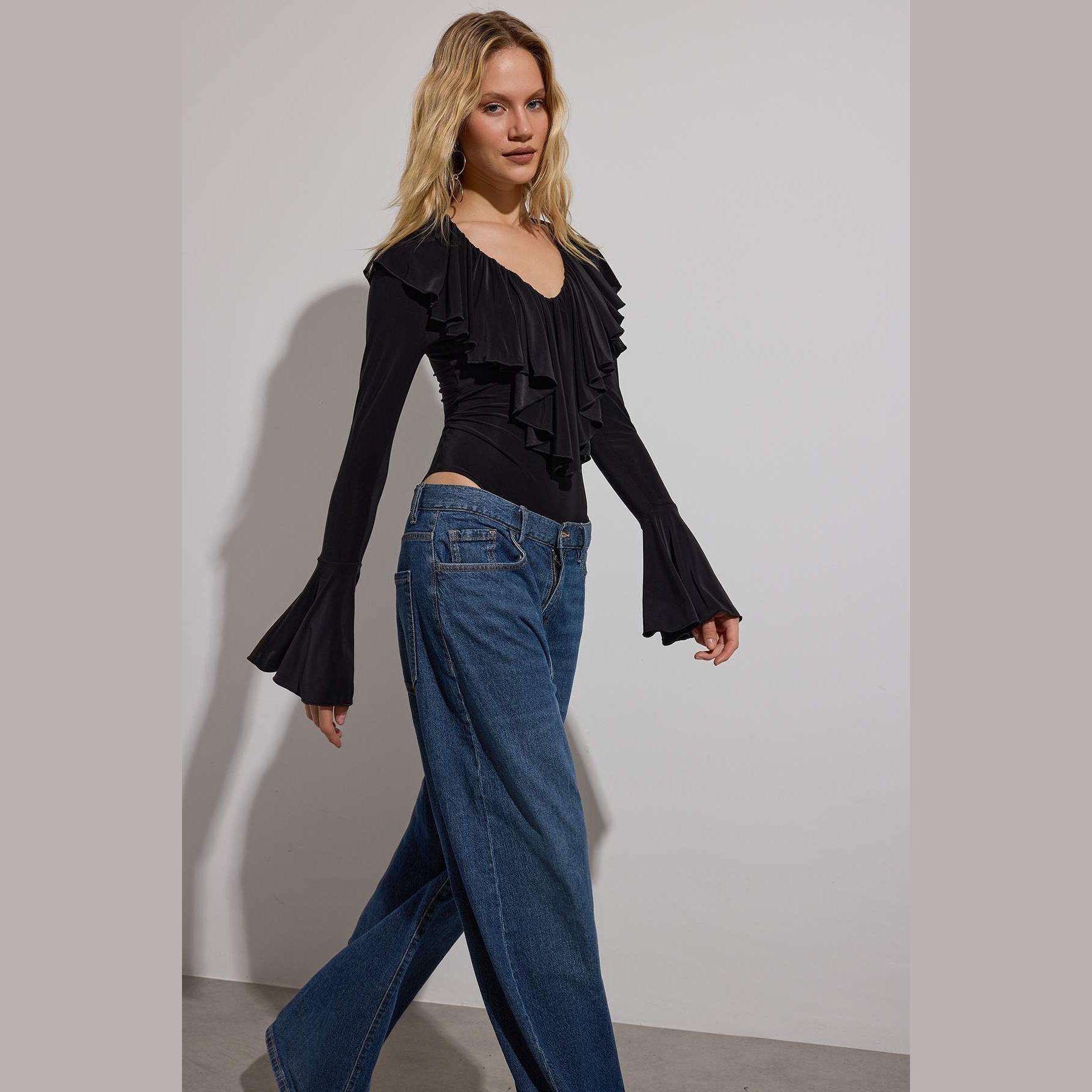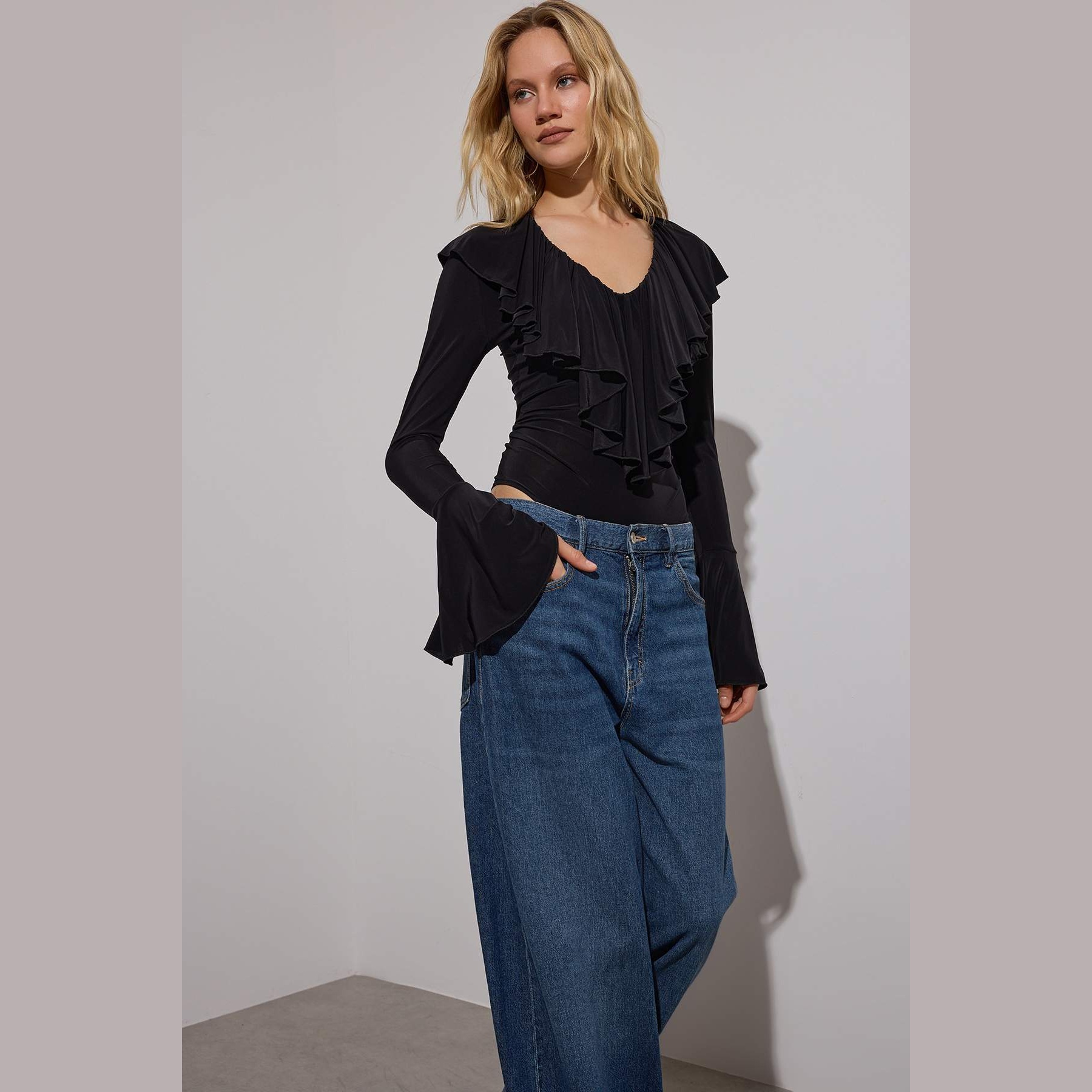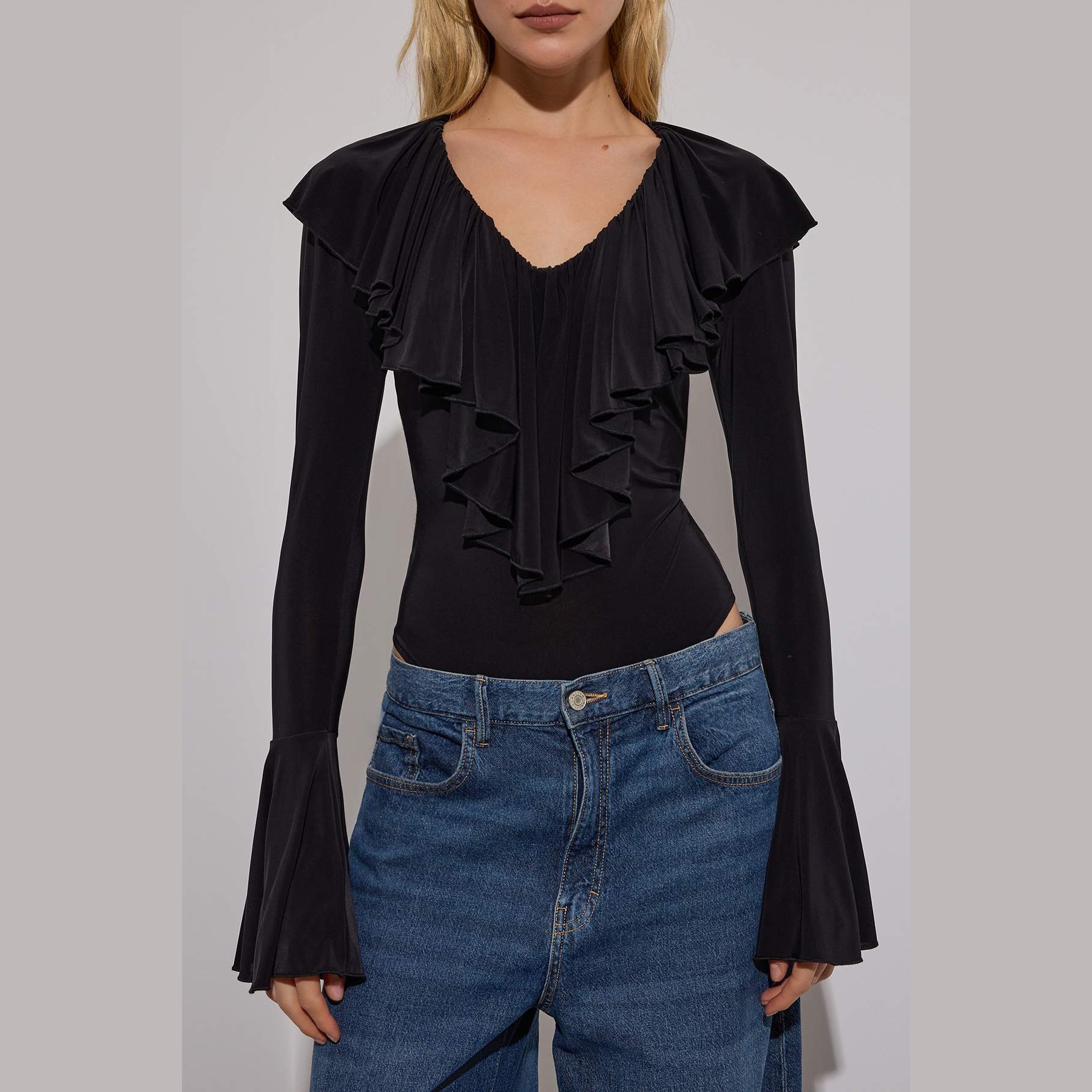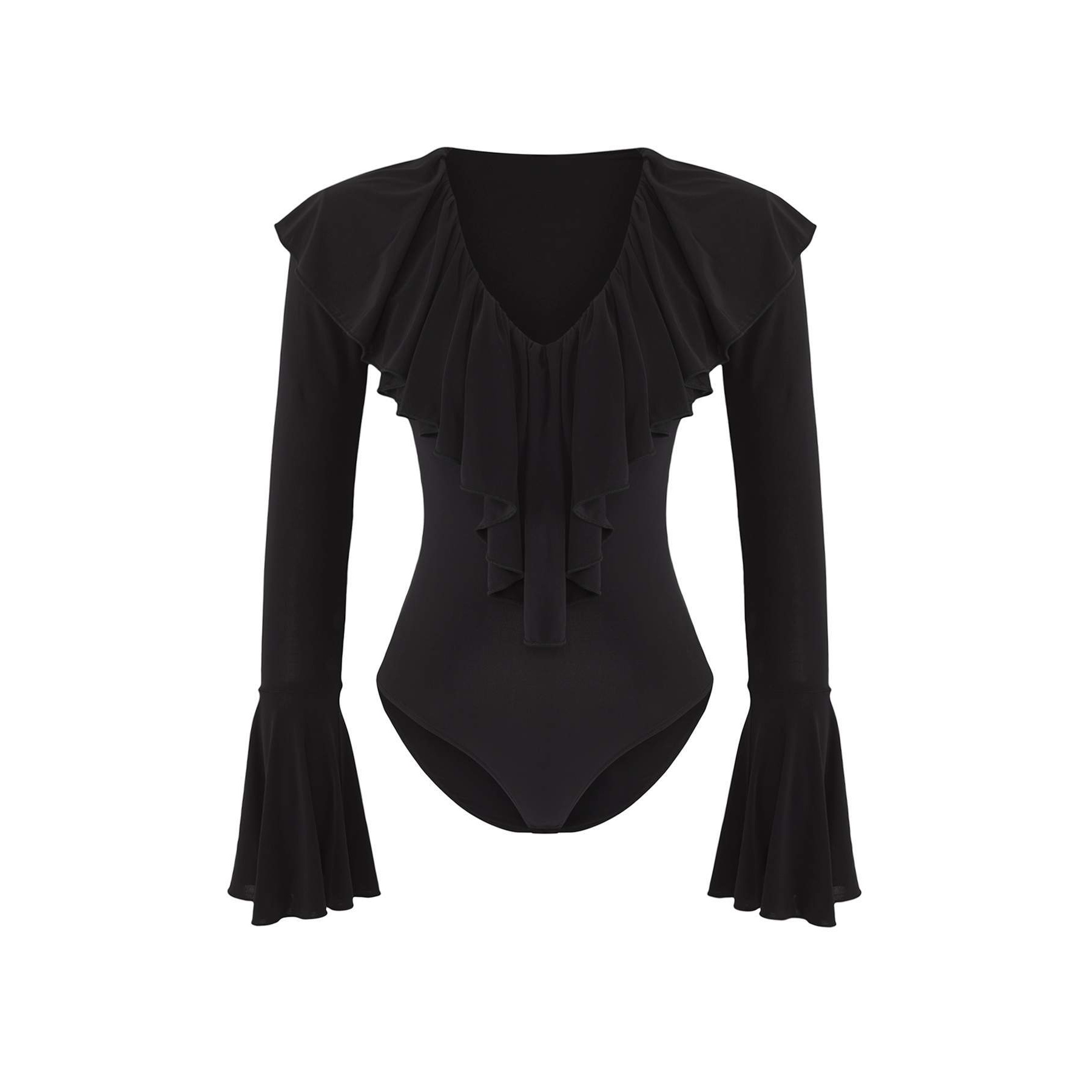 بودي نسائي – أسود بياقة V وأكمام طويلة (تصميم أنيق بخامة Sandy مطاطية)