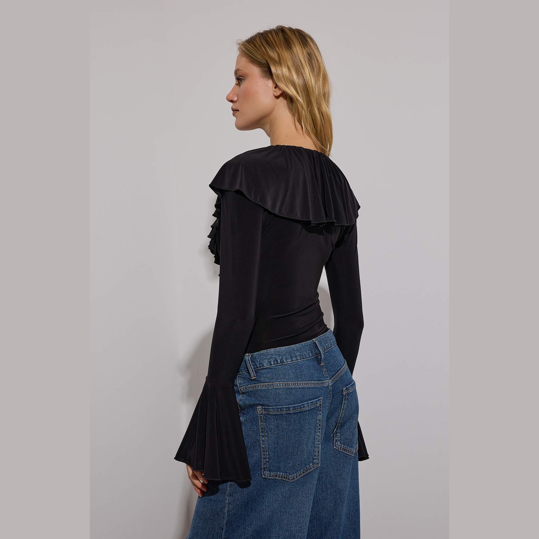 بودي نسائي بلون أسود، مصنوع من خامة Sandy مطاطية ولامعة، يتميز بياقة V أنثوية، وأكمام طويلة بقصة Fitted تبرز القوام، مع نسيج ناعم يمنح راحة في الارتداء. تصميم مغلق بدون درابيه أو تفاصيل إضافية، مثالي للإطلالات اليومية أو المسائية المحتشمة.