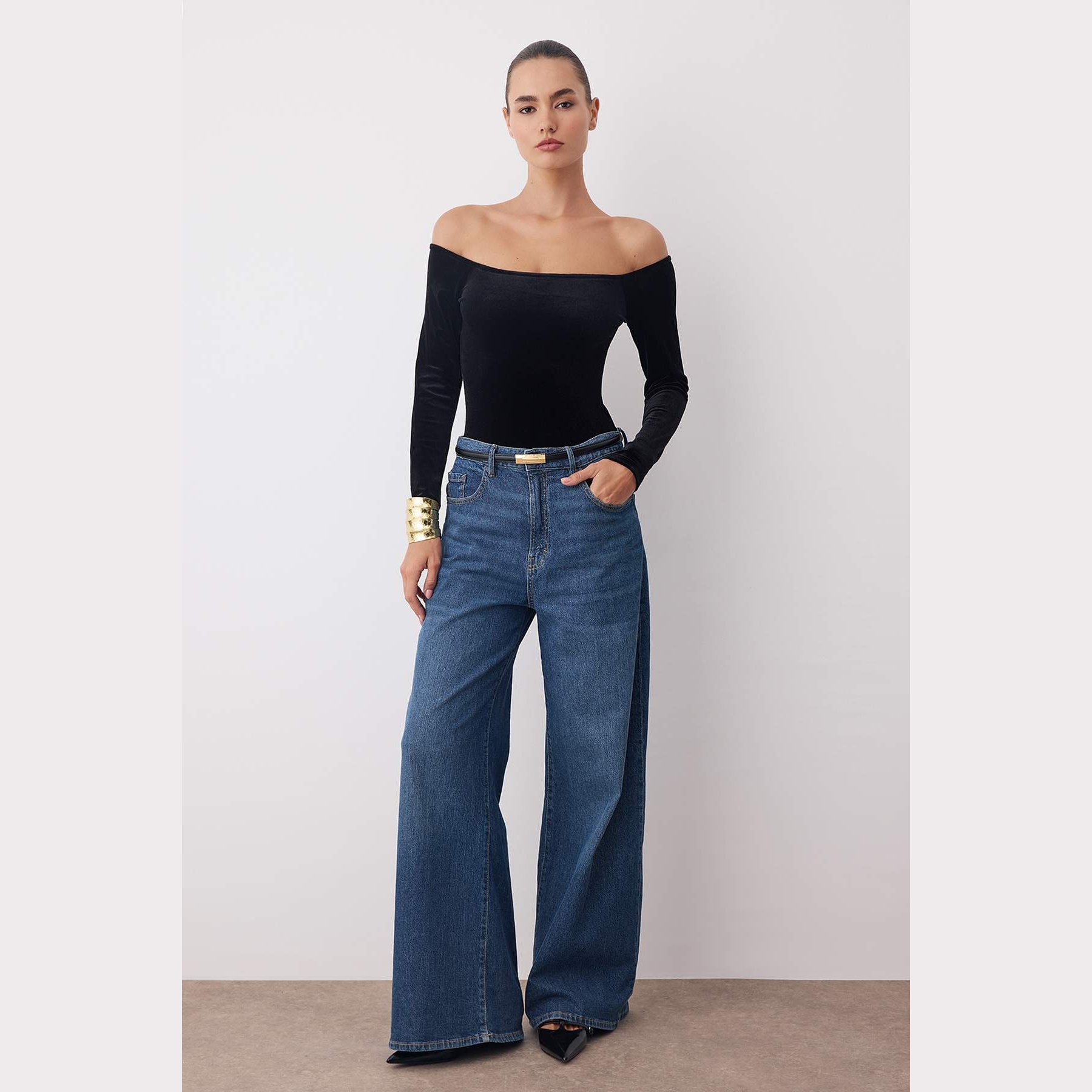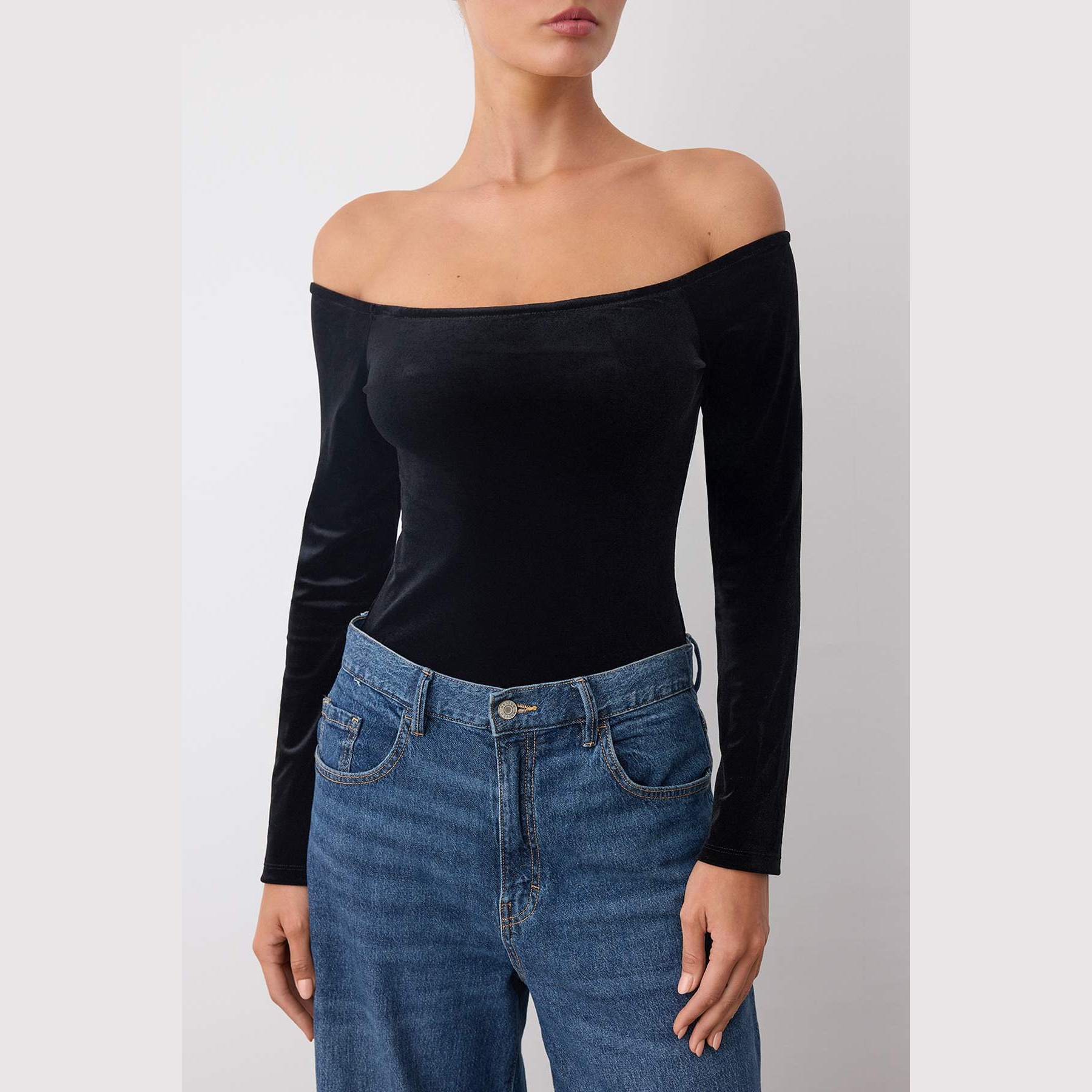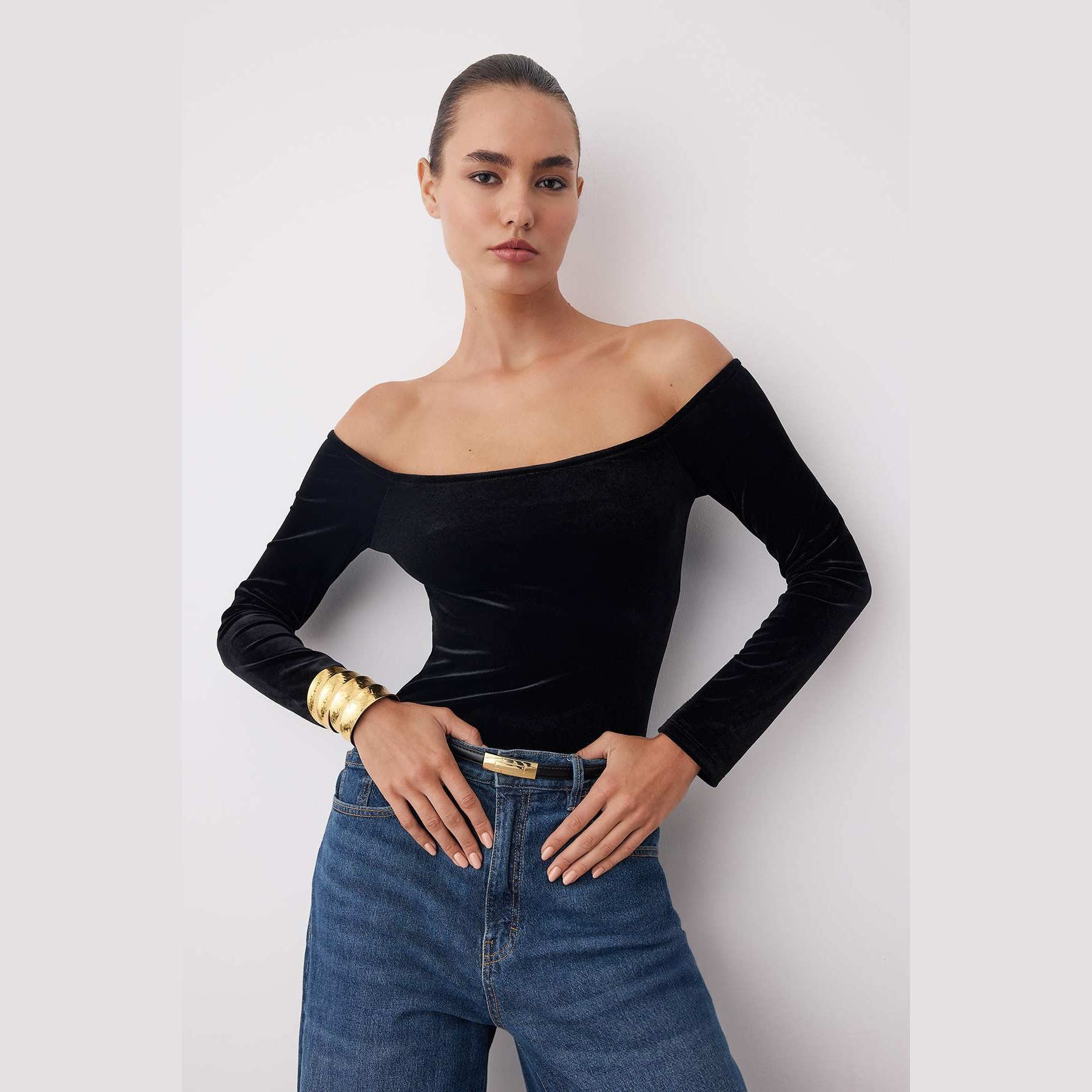 بودي نسائي بلون أسود، مصنوع من خامة تريكو كاديفة مطاطية بتركيبة بوليستر وإيلاستان، يتميز بياقة كارمن مكشوفة تضيف لمسة أنثوية جذابة، مع قصة Fitted تبرز القوام، وأكمام طويلة، وإغلاق سفلي بصَفّاطات عملية. تصميم مثالي للسهرات والمناسبات الخاصة.