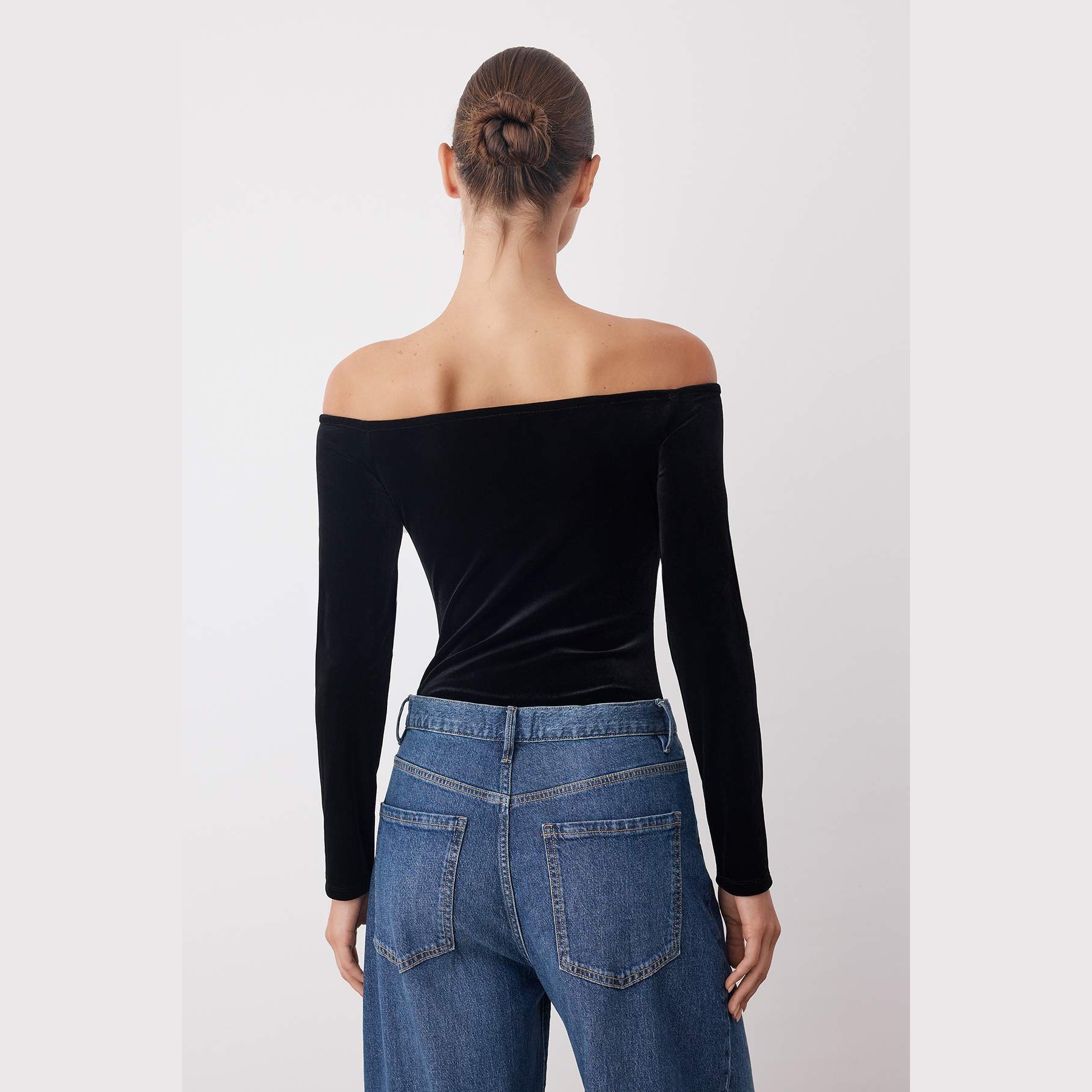 بودي نسائي – أسود بياقة كارمن وخامة كاديفة (تصميم مسائي أنيق بلمسة فاخرة)