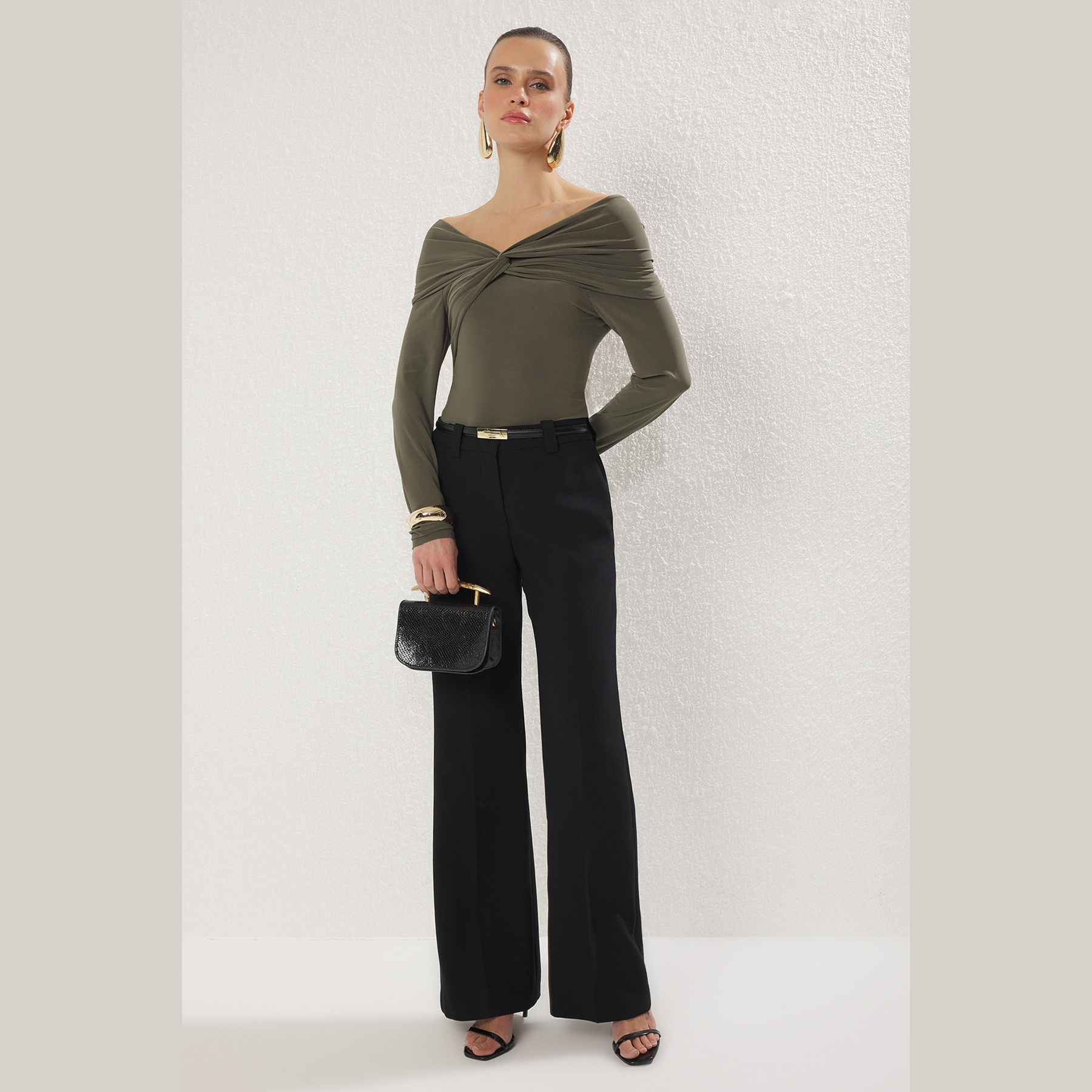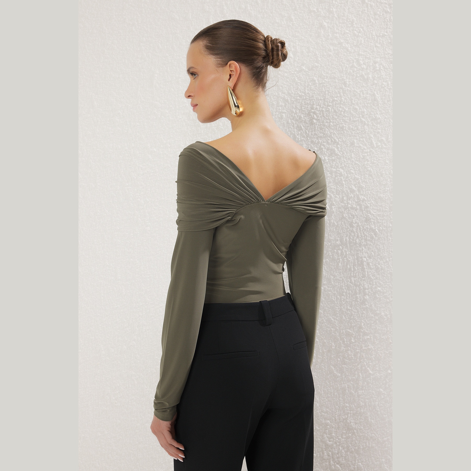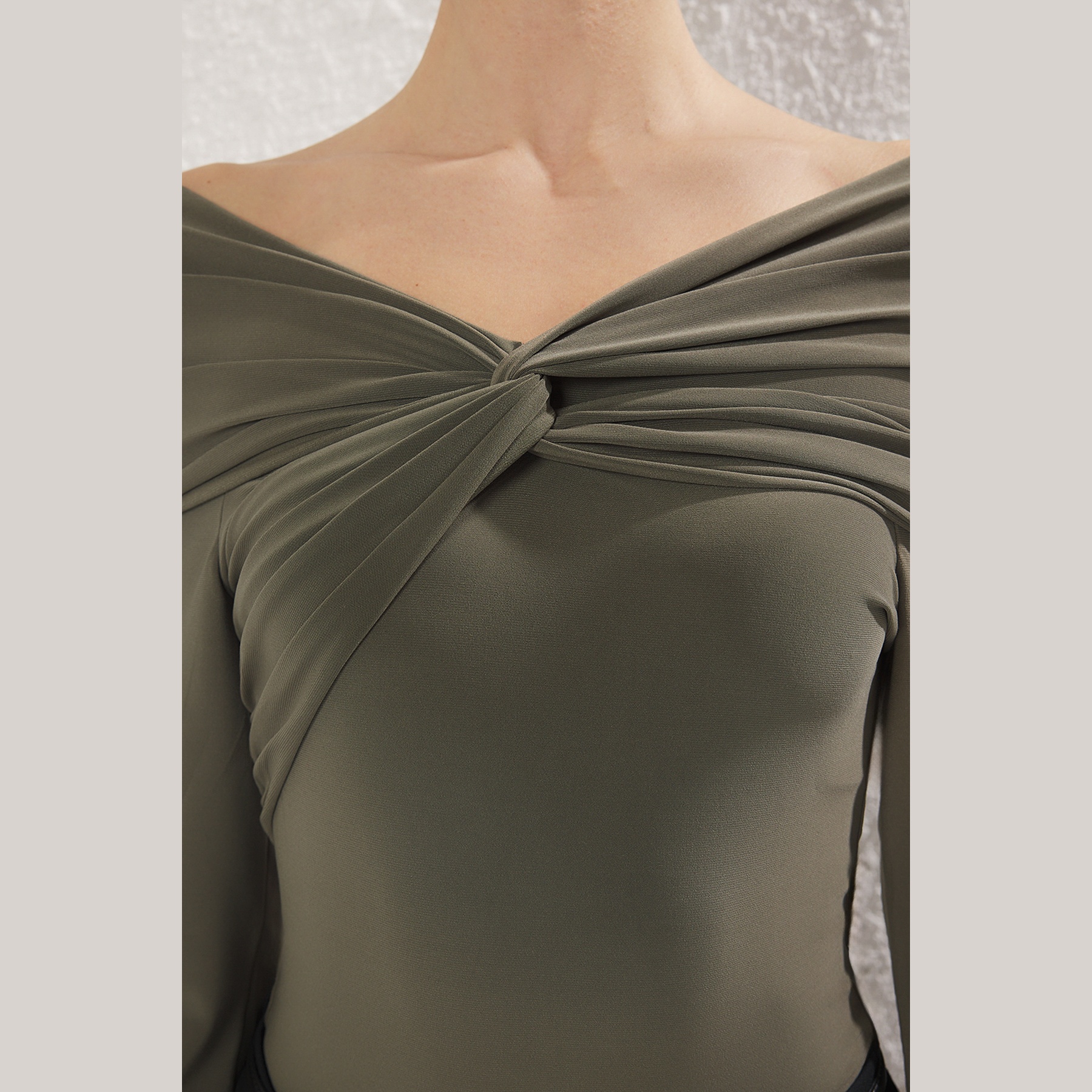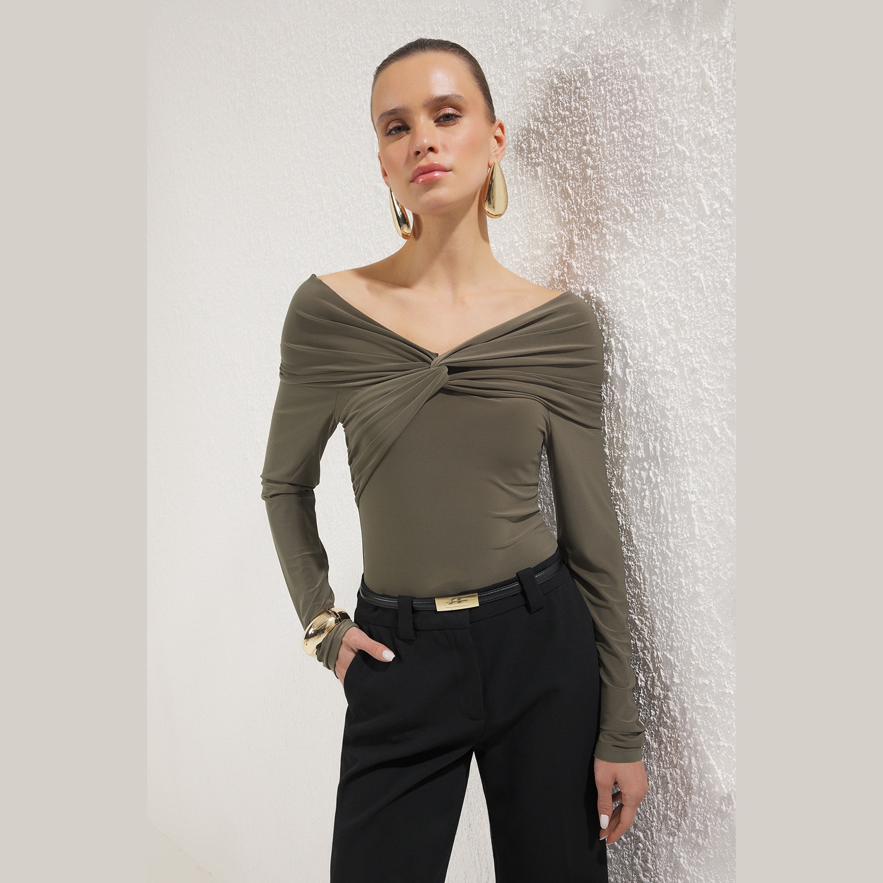 بودي نسائي – زيتي بياقة غير متناظرة وفتحة جانبية (تصميم عصري بخامة مطاطية مريحة)